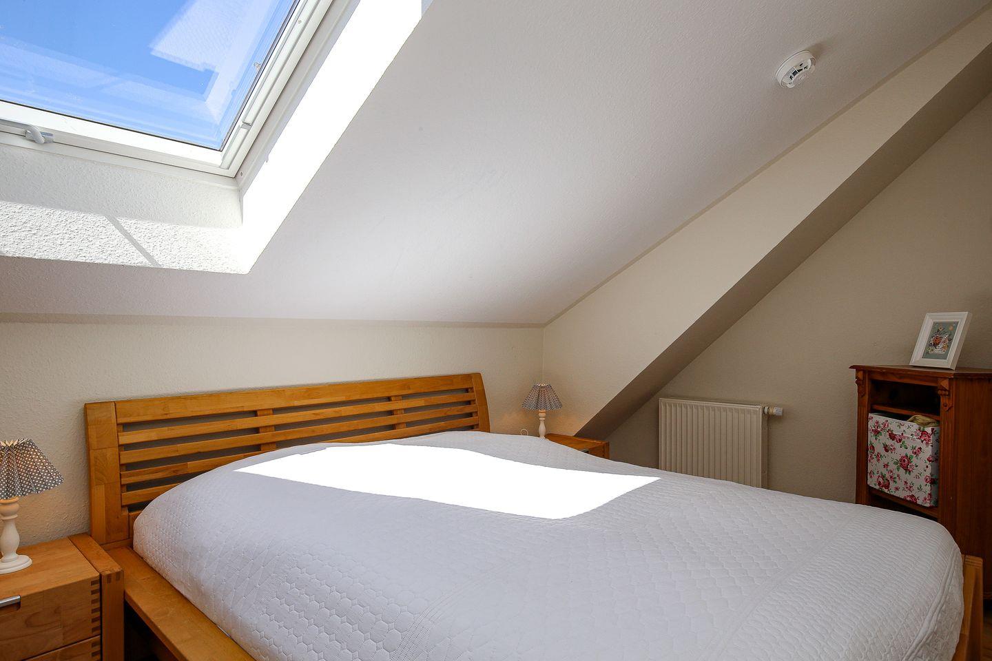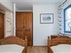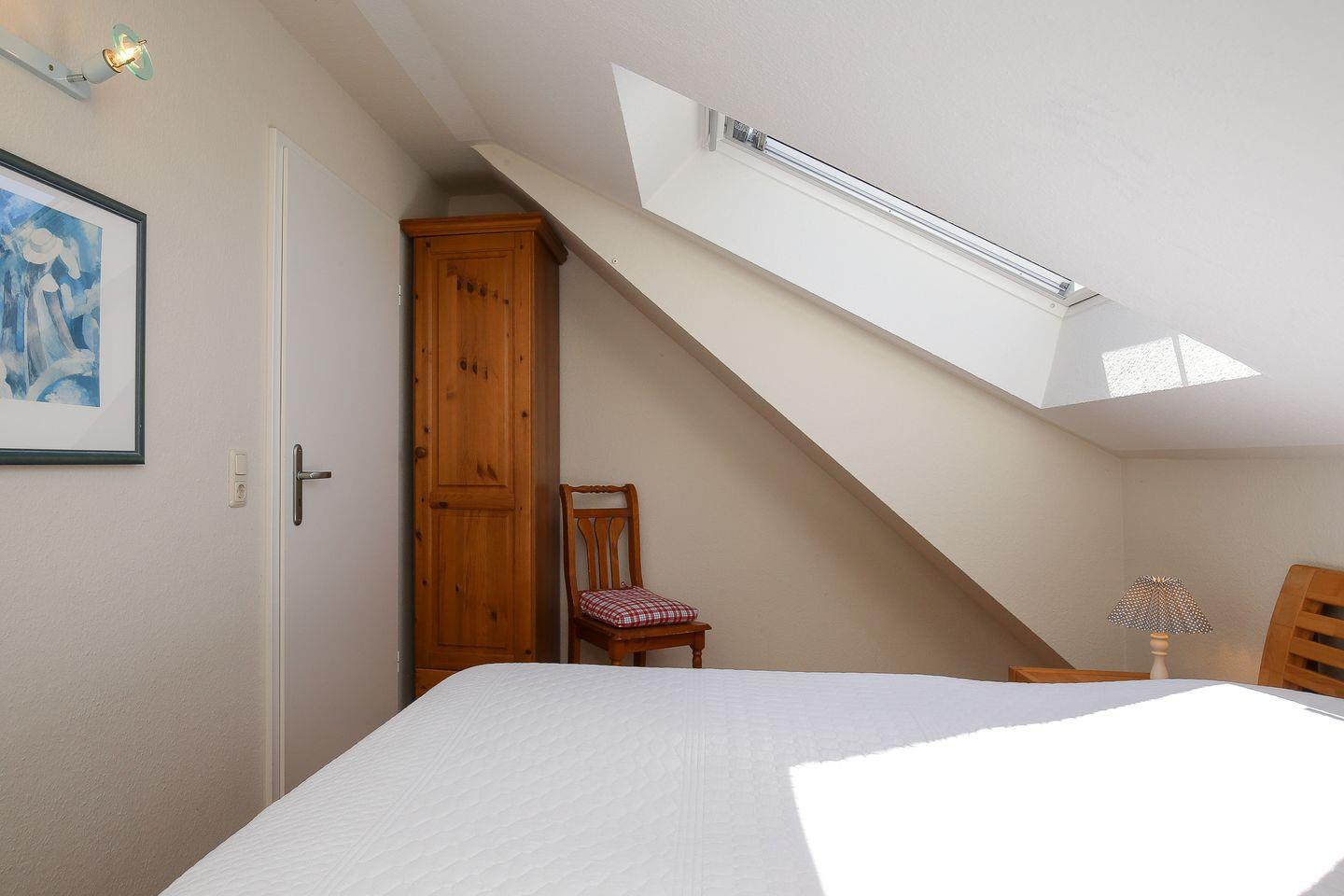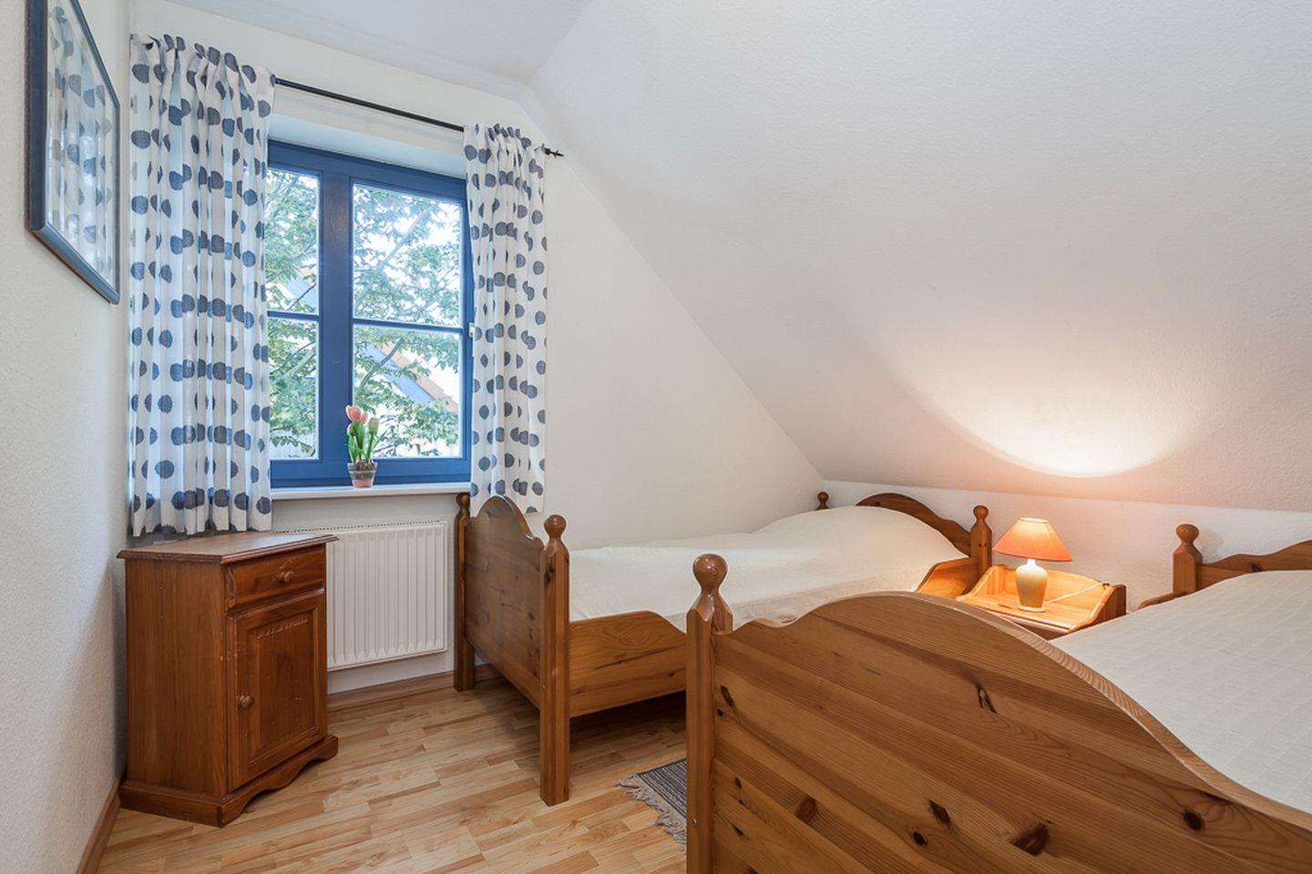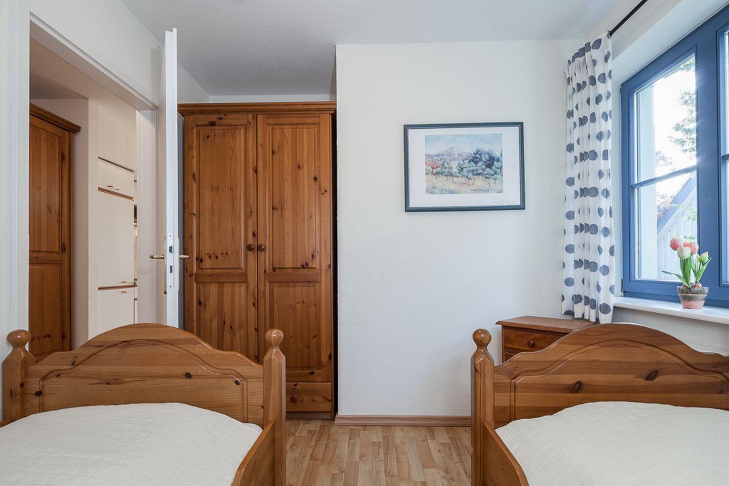 Zu den zwei weiteren Schlafbereichen kommst du über die innenliegende Treppe im Wohnzimmer. Hier befinden sich jeweils ein Doppelbett (2 x 90 x 200 cm und 2 x 80 x 200 cm) und ein Kleiderschrank. Eine Besonderheit im rechten Schlafraum ist eine extra Stereoanlage. Rollos zur Verdunklung dienen im Schlafzimmer auf der unteren Ebene und im rechten Schlafzimmer auf der oberen Etage. Der linke Schlafraum im Obergeschoss wird mit Vorhängen abgedunkelt.