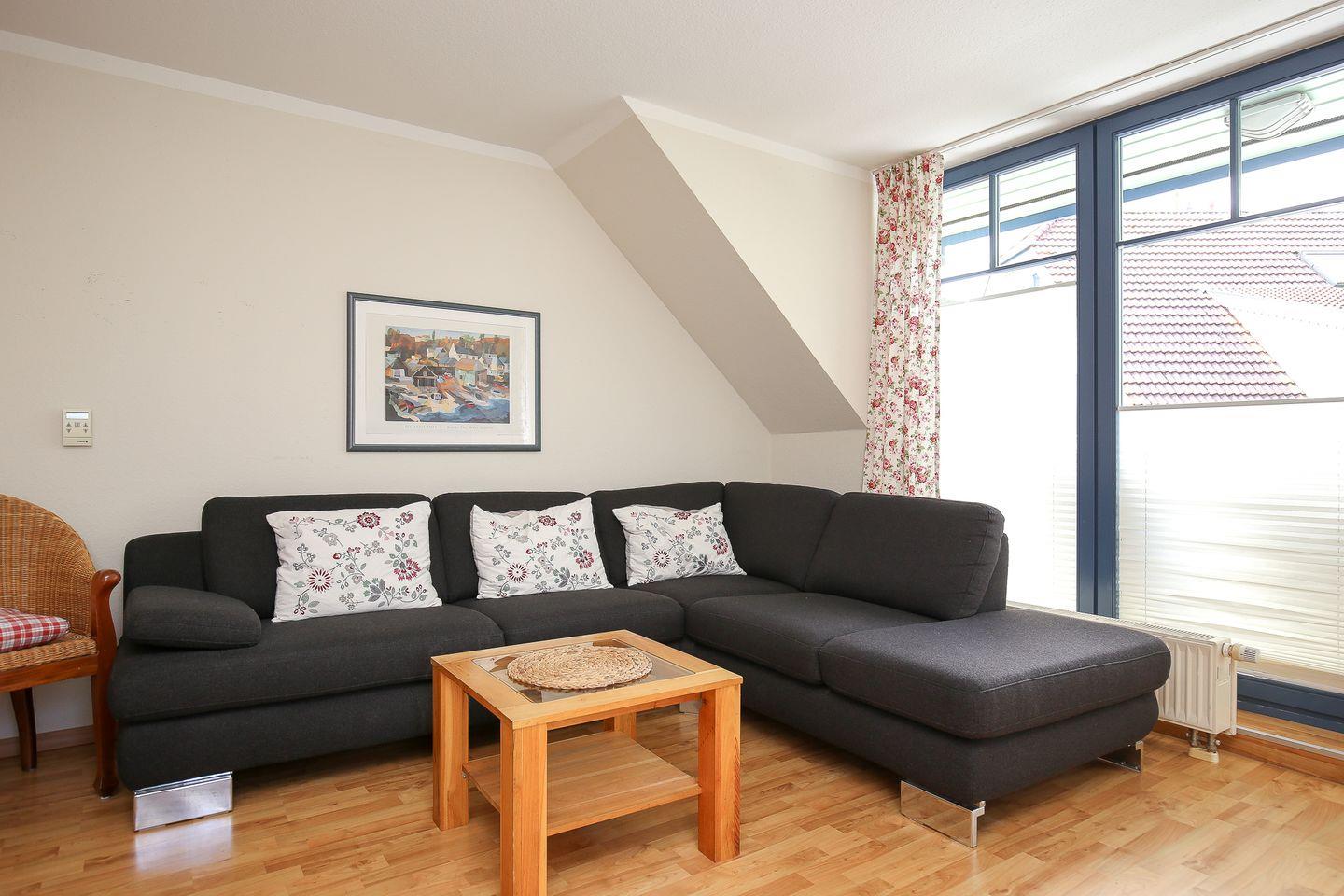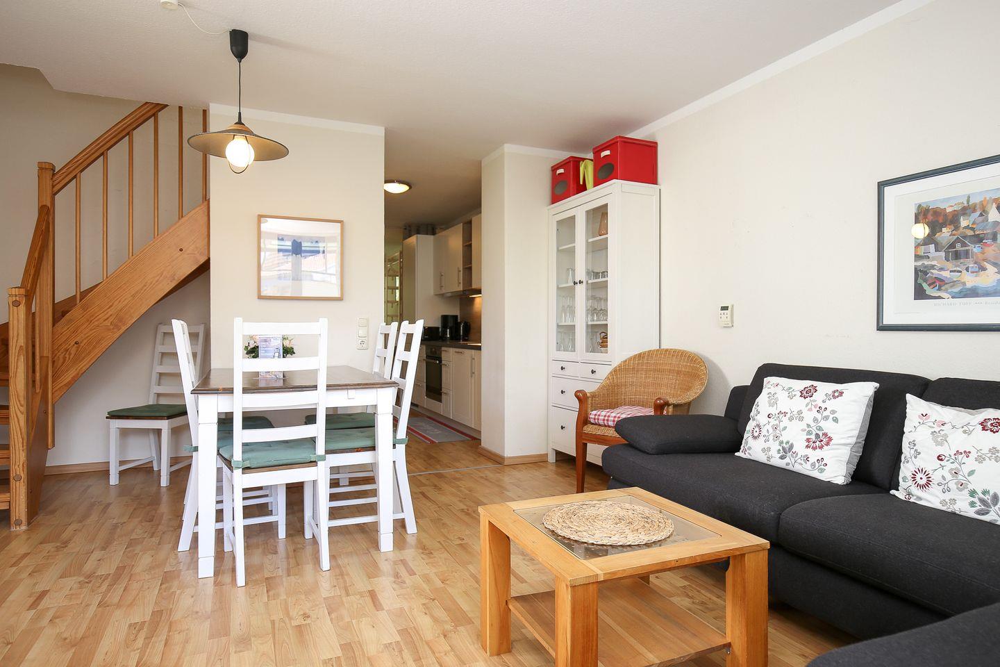 Genieße auf dem möblierten Balkon deinen wohlverdienten Urlaub. Du betrittst diesen über das Wohnzimmer. Zum offen gestalteten Wohn- und Essbereich gehören eine bequeme Couchgarnitur sowie ein Essplatz. Ein Flachbild-TV, eine Stereoanlage, ein Blu-ray-Player und eine Auswahl an Büchern und Spielen sorgen zusätzlich für Wohlbefinden.