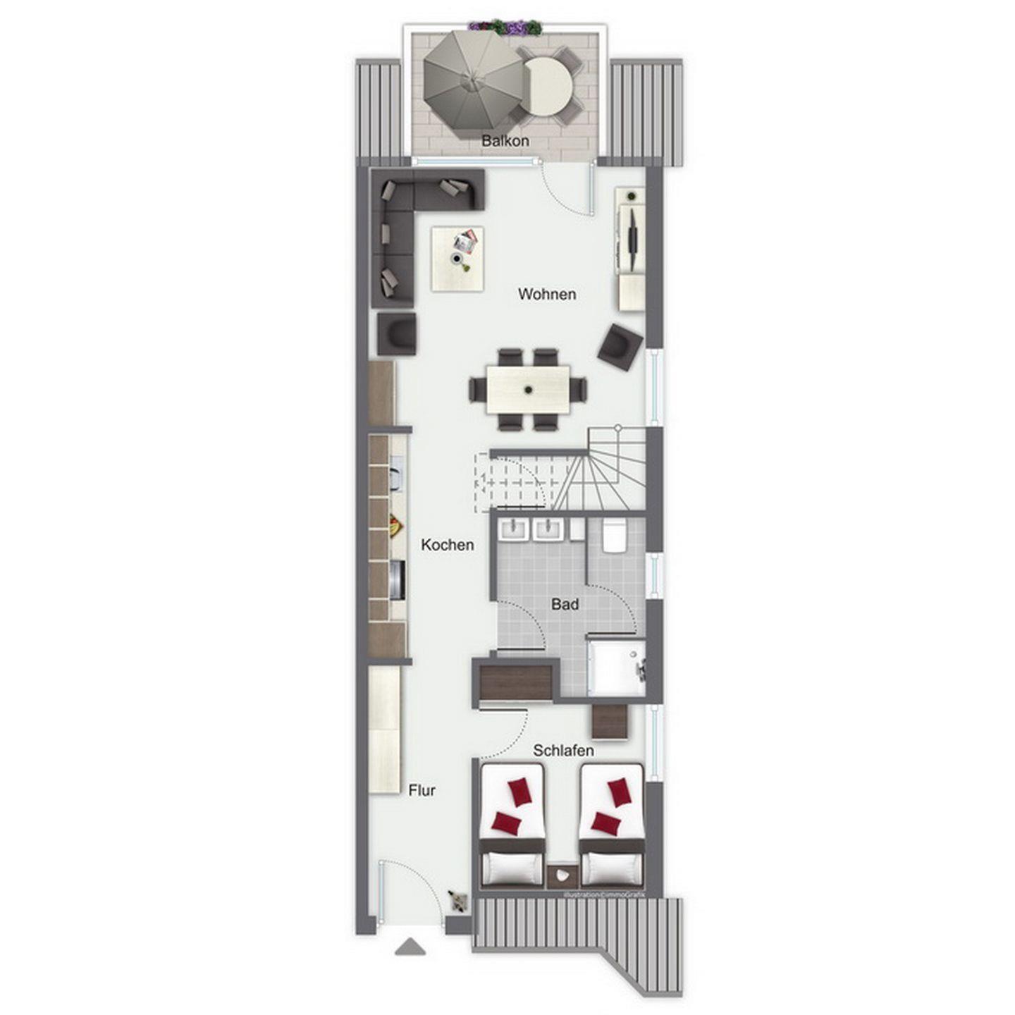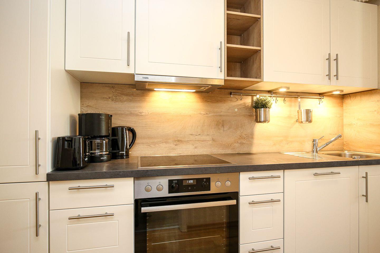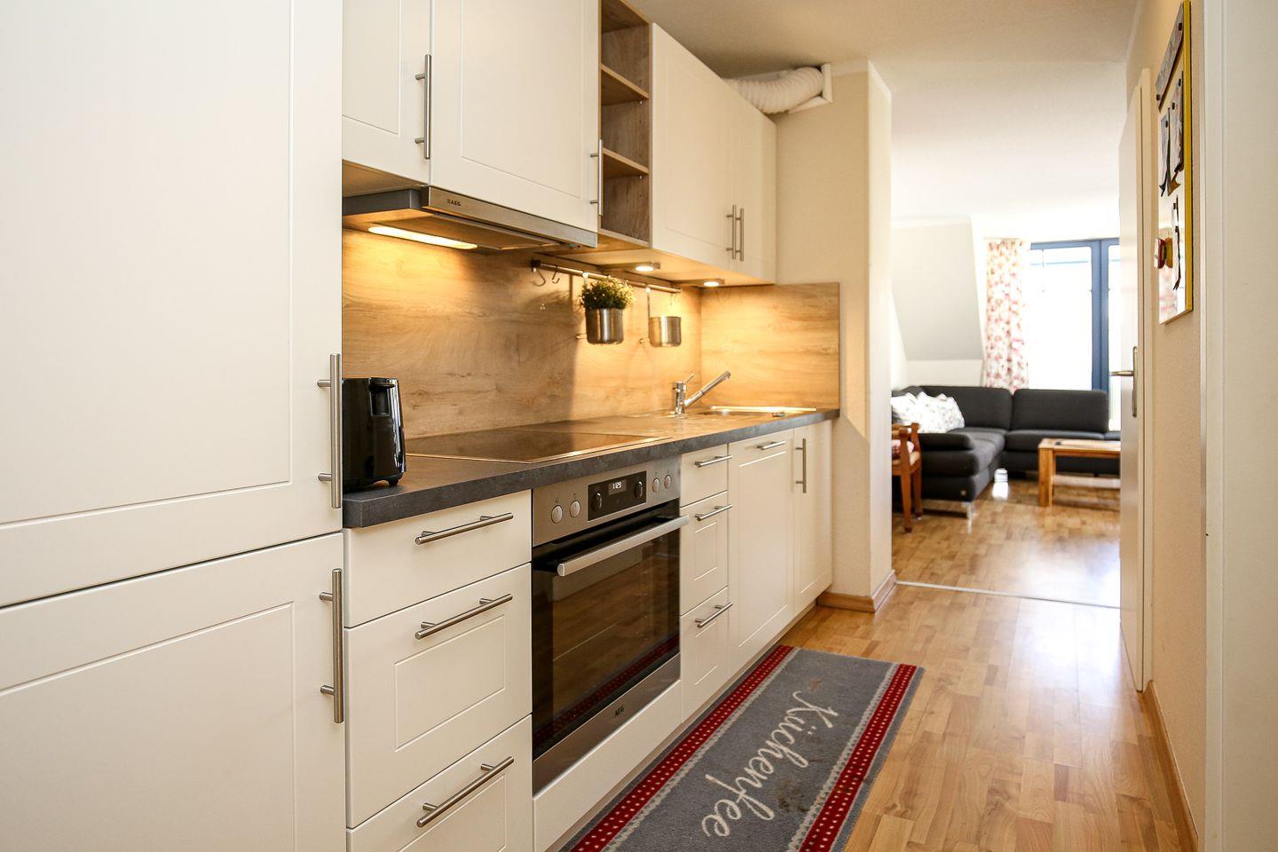 Die integrierte Küchenzeile verfügt über ein 4-Plattenkochfeld mit Backofen, einen Geschirrspüler und ein Kühlschrank mit Gefrierfach. Als Bodenbelag wurde in der gesamten Wohnung Laminat gewählt. Im Schlafzimmer im Untergeschoss ermöglichen zwei Einzelbetten (90 x 200 cm) einen ruhigen Schlaf. Mitgebrachte Garderobe kann in den Kleiderschränken im Schlafraum und im Eingangsbereich verstaut werden.