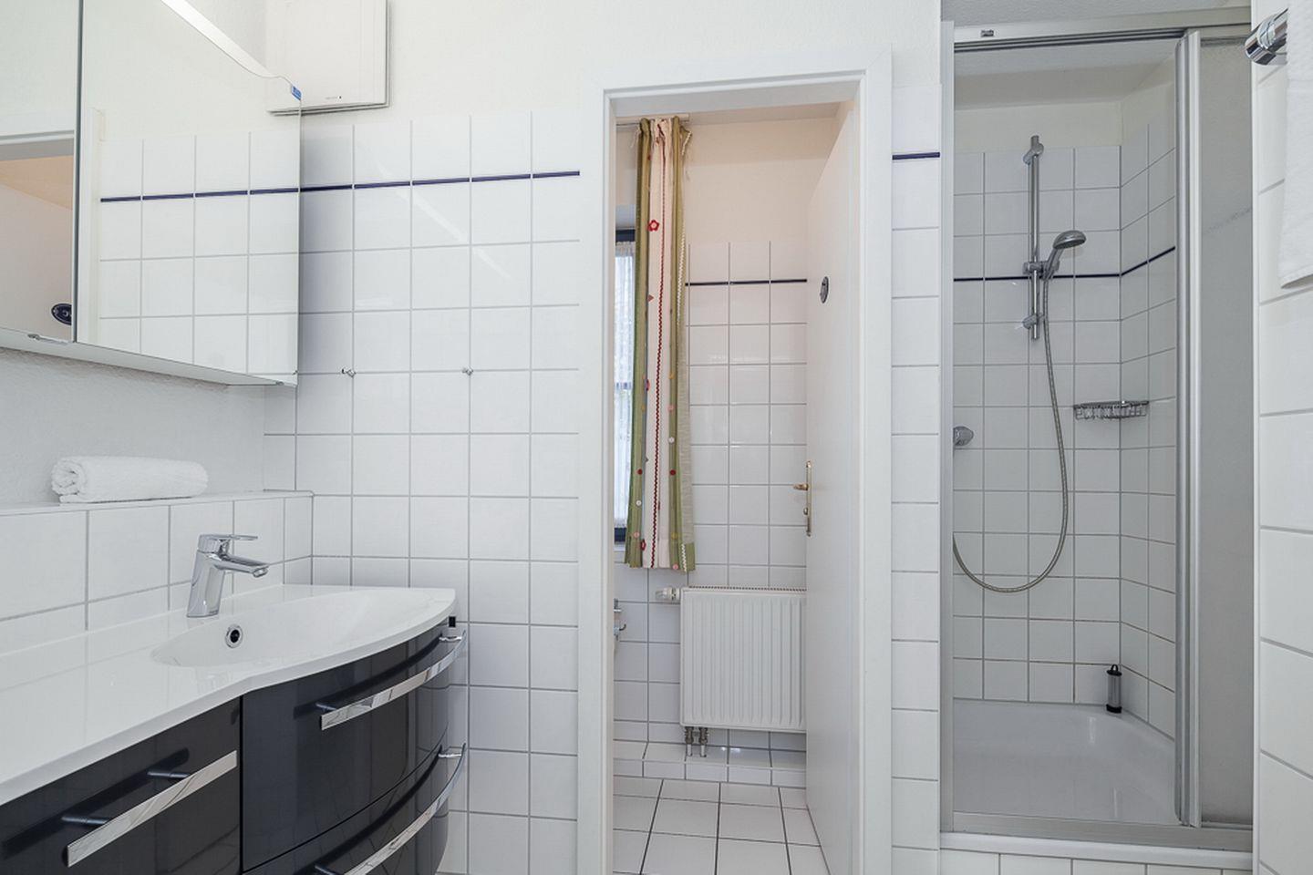 Im gefliesten Nassbereich mit einem Fenster sind zwei Waschbecken und ein separates WC vorhanden. Fahrräder können im Fahrradständer am Haus abgestellt werden. In dieser Nichtraucherwohnung sind Haustiere nicht erlaubt.