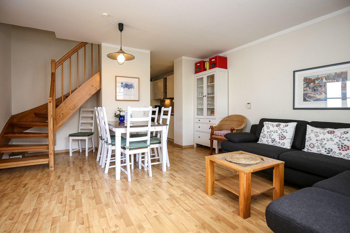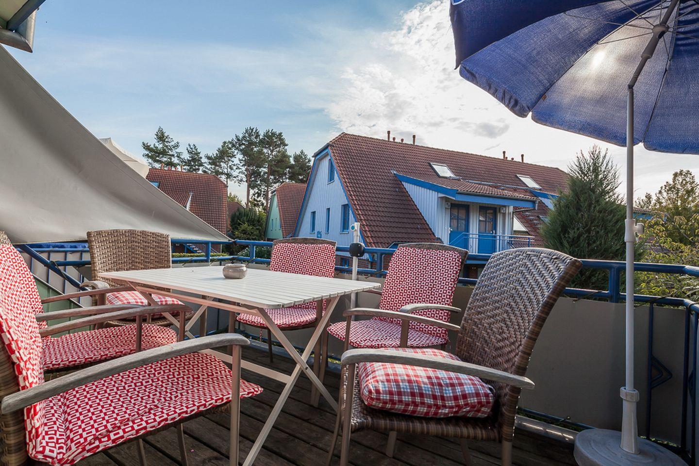 Im 1. OG. des Hauses 10 erwartet dich auf ca. 70 m² ein gemütliches 4-Zi.-Apartment mit Balkon in Süd-West-Lage. Auf zwei Etagen findest du einen Wohn-und Essbereich, drei Schlafzimmer, eine Küchenzeile und ein Duschbad vor. Es Die Strandentfernung vom Feriendorf Papillon beträgt ca. 250 m.