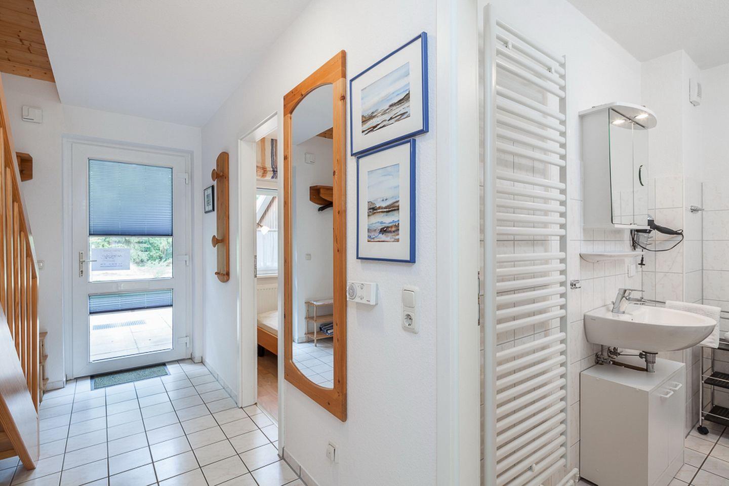 In diesem Ferienhaus findest du im Erdgeschoss ein Duschbad mit Waschmaschine, Föhn und Spiegelschrank mit Vergrößerungs-Spiegel. Im Obergeschoss nutzt du ein Gäste-WC und Waschbecken mit einem Vergrößerungsspiegel sowie ein Föhn. In einem Stauraum findest du den Kinderhochstuhl sowie Terrassen-Sitzauflagen vor.