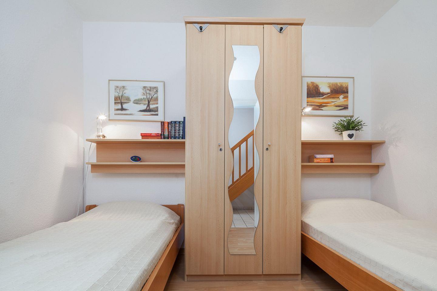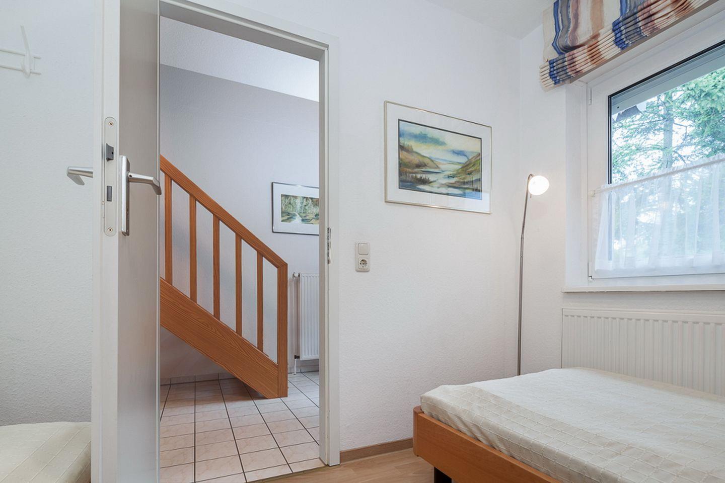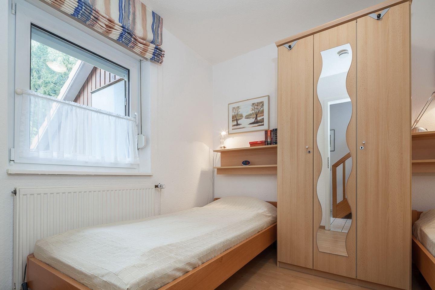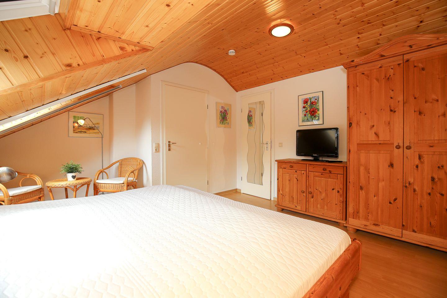 Im Obergeschoss des Ferienhauses befindet sich 1 Schlafzimmer. Dieses Schlafzimmer bietet ein komfortables Doppelbett (2 x 90 x 200 cm) sowie einen geräumigen Kleiderschrank. Eine kleine Sitzecke mit zwei Korbsesseln und Tisch, dimmbare Leselampe und ein Flachbild-TV laden zusätzlich zum Relaxen ein. Beide Velux-Fenster haben Verdunkelungs-/Hitzeschutz-Rollos.