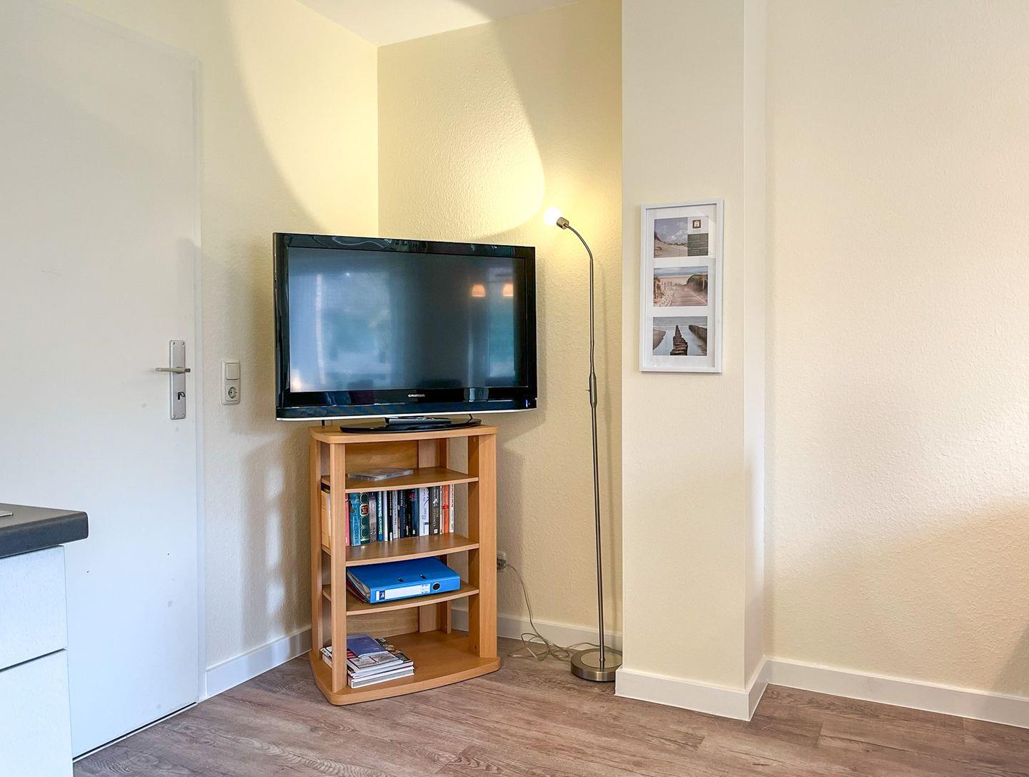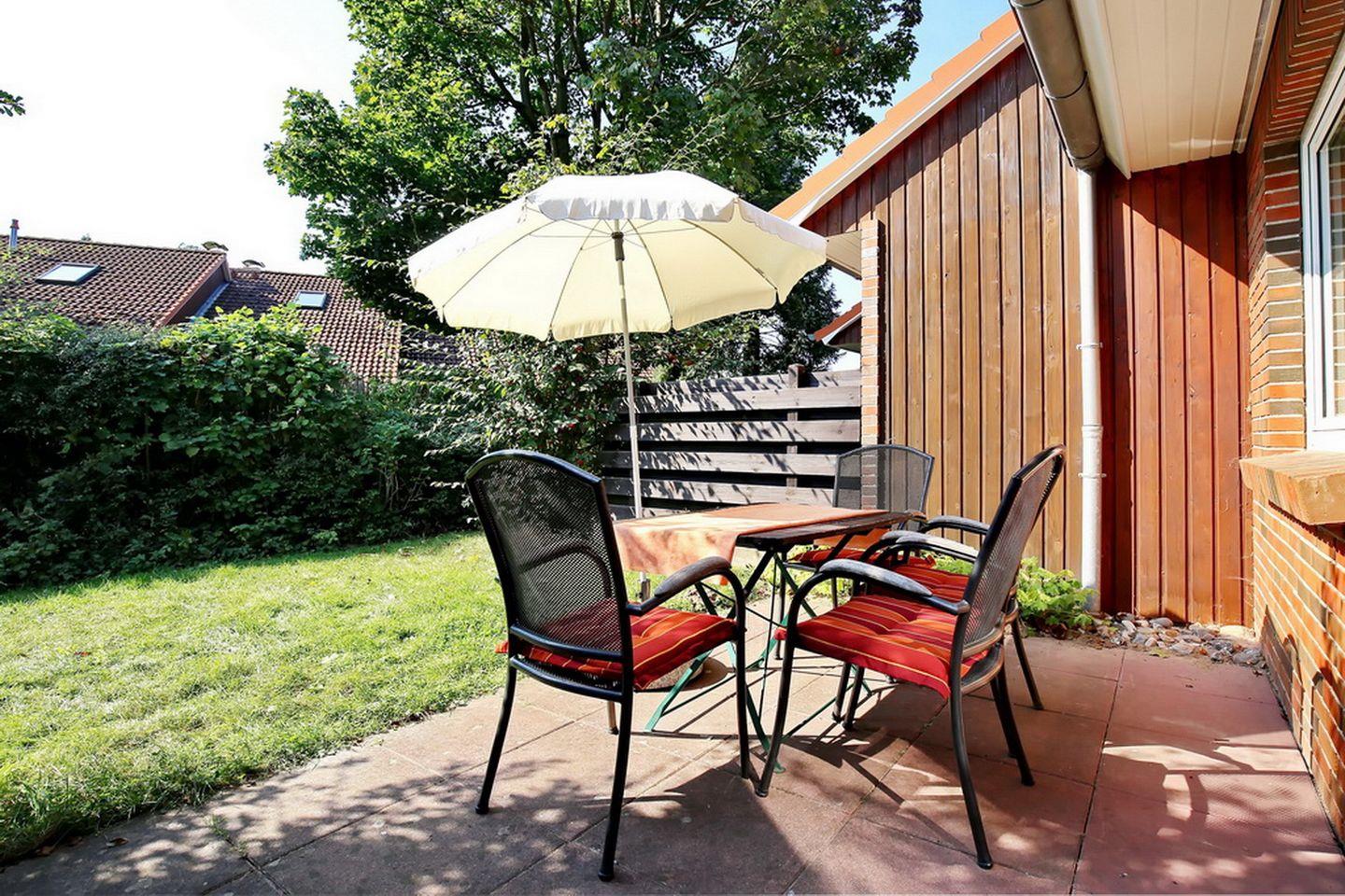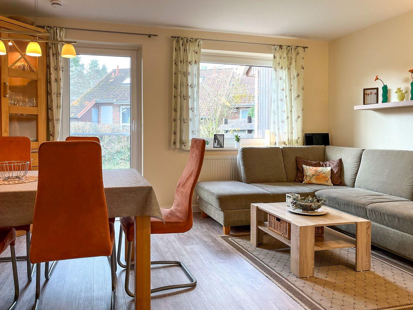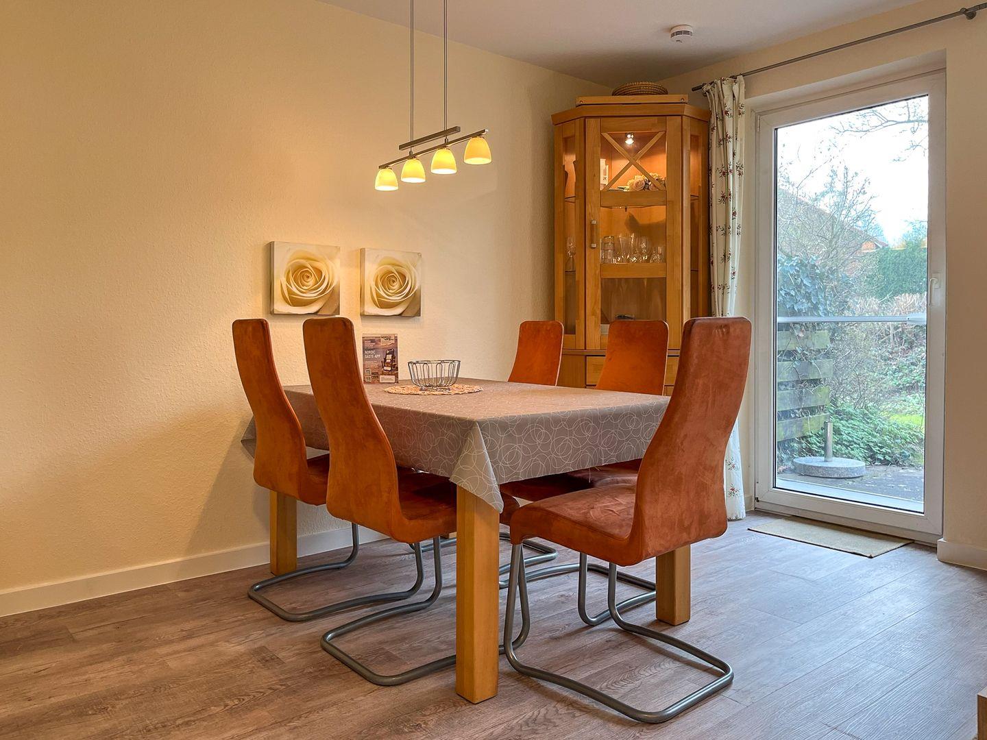 Der Wohnbereich lädt mit einer gemütlichen Eckgarnitur, die sich zur Schlafgelegenheit (Liegefläche 125 x 200 cm) umbauen lässt, zum Ausruhen ein. Der große Esstisch bietet viel Platz für geselliges Miteinander. Das Wohnzimmer ist ausgestattet mit TV und kleiner Stereoanlage mit CD-Player. Auf der schönen Südterrasse finden sich bequeme Gartenstühle mit Auflagen. Auch für unsere kleinen Gäste sind Gartentisch und Stühle vorhanden.