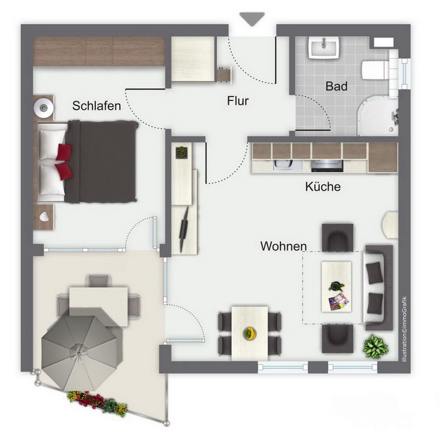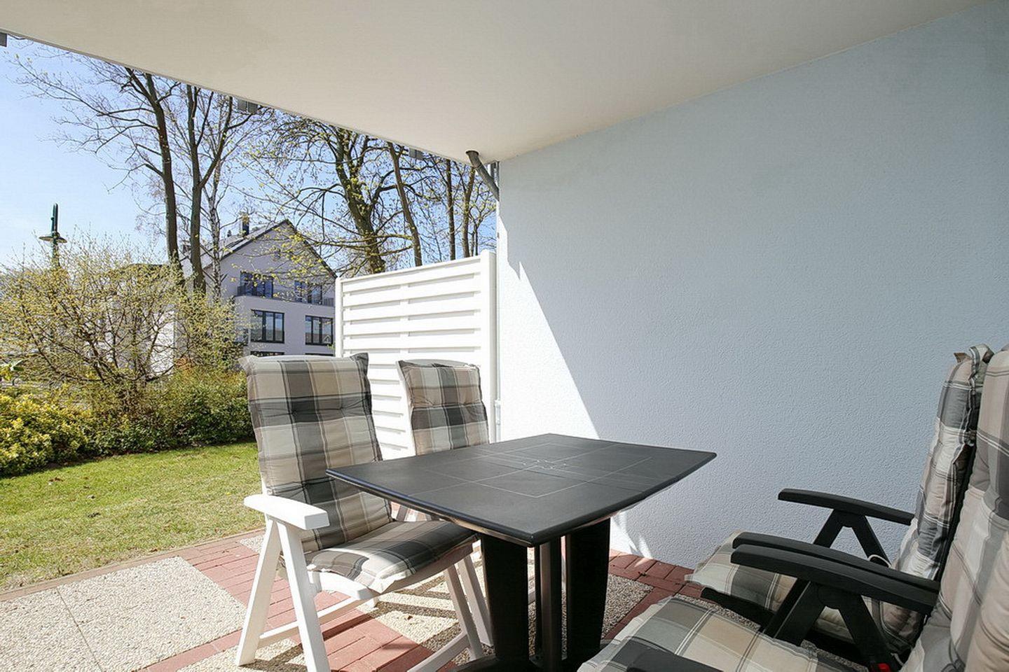 Die ca. 48 m² große Ferienwohnung liegt im Erdgeschoss und hat eine Terrasse in Südlage. Weiterhin verfügst du über ein Wohnzimmer mit Küchenzeile, ein Schlafzimmer und ein Duschbad. Zum Strand sind es nur 70 Meter.