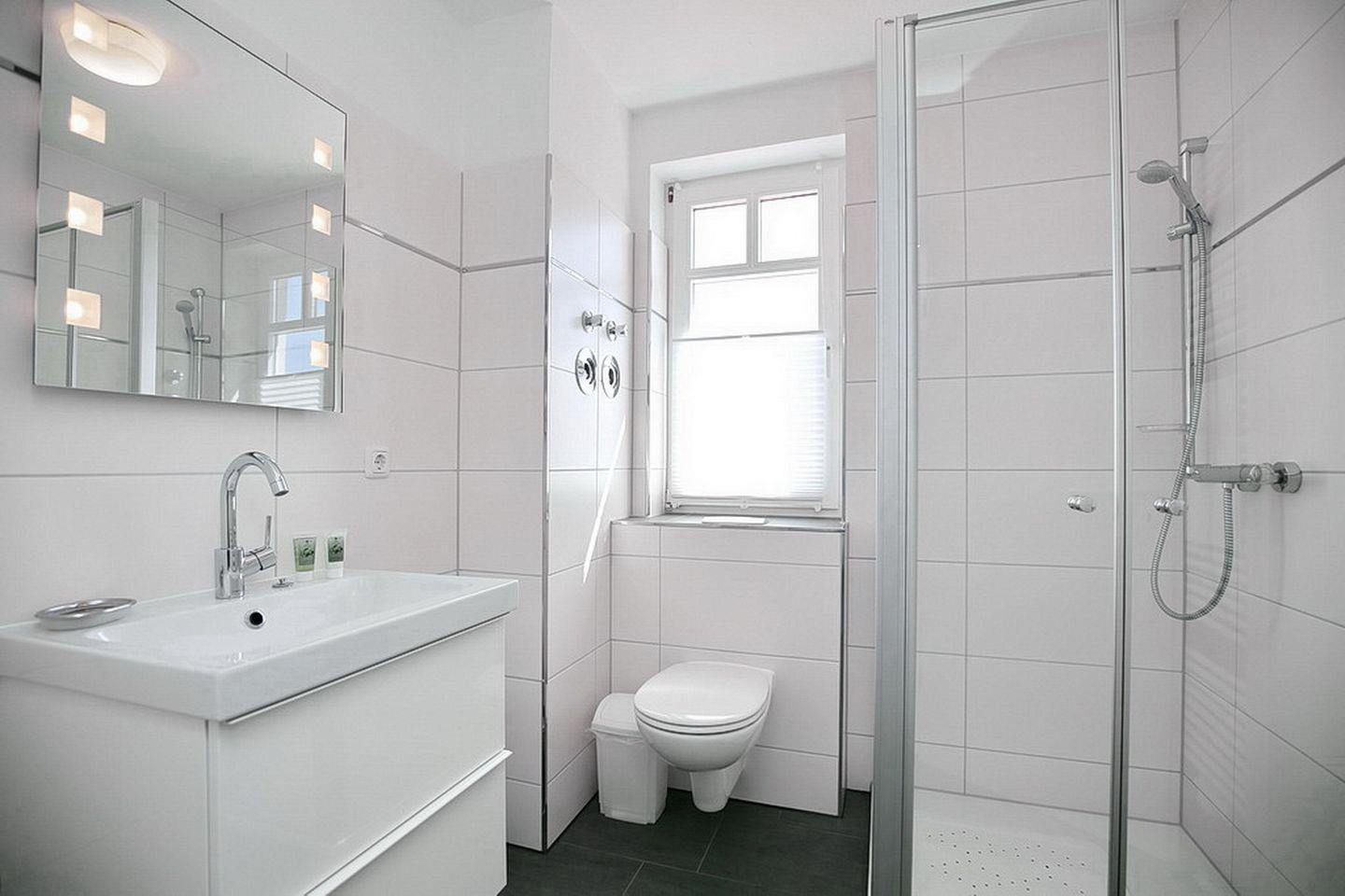 Das Duschbad überzeugt mit modernem Schick: Eine bodentiefe Dusche mit flachem Einstieg aus Sicherheitsglas und ein Handtuchheizkörper sorgen für Wohlfühlatmosphäre.