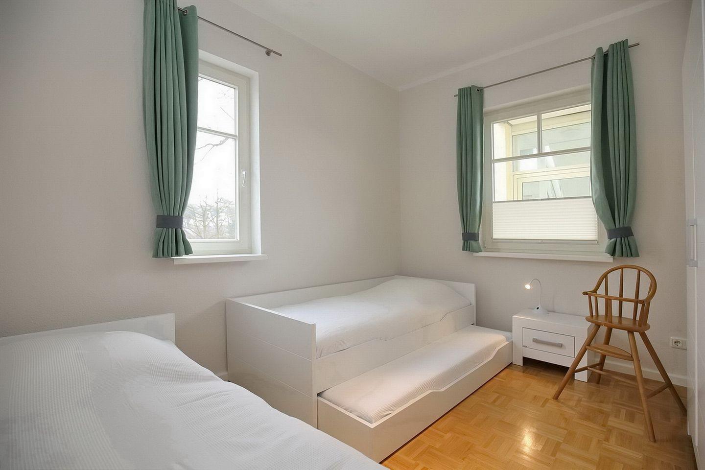 In einem der beiden Schlafzimmer stehen zwei Einzelbetten (je 90 x 200 cm) und in dem anderen Schlafzimmer ein Doppelbett (2 x 90 x 200 cm). Ein Kinderhochstuhl und Kinderbett können von unseren kleinen Gästen kostenfrei genutzt werden.