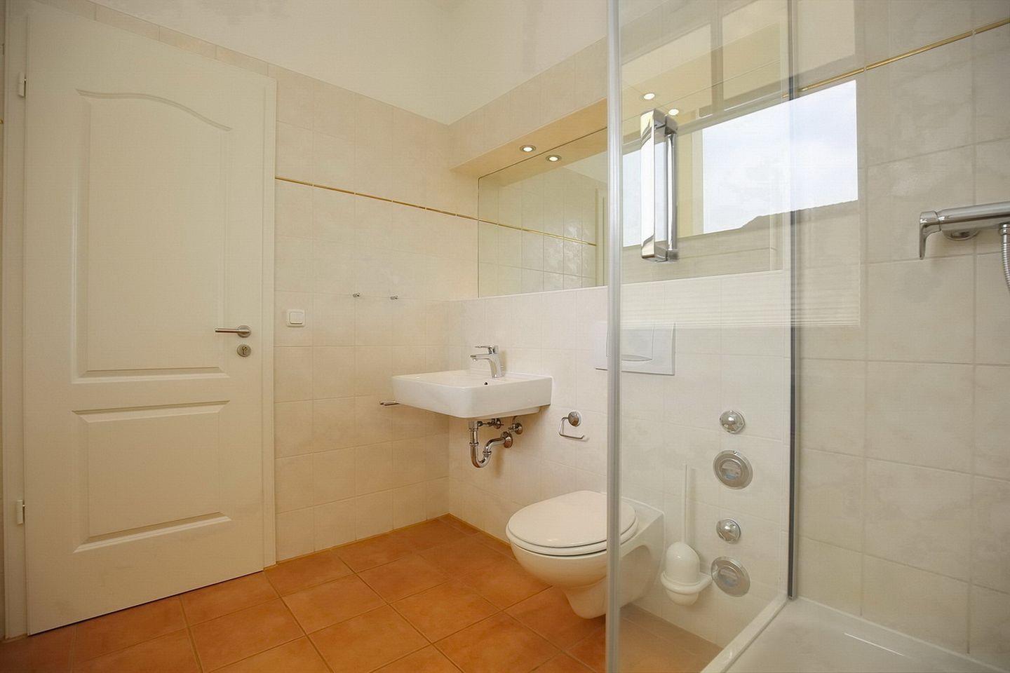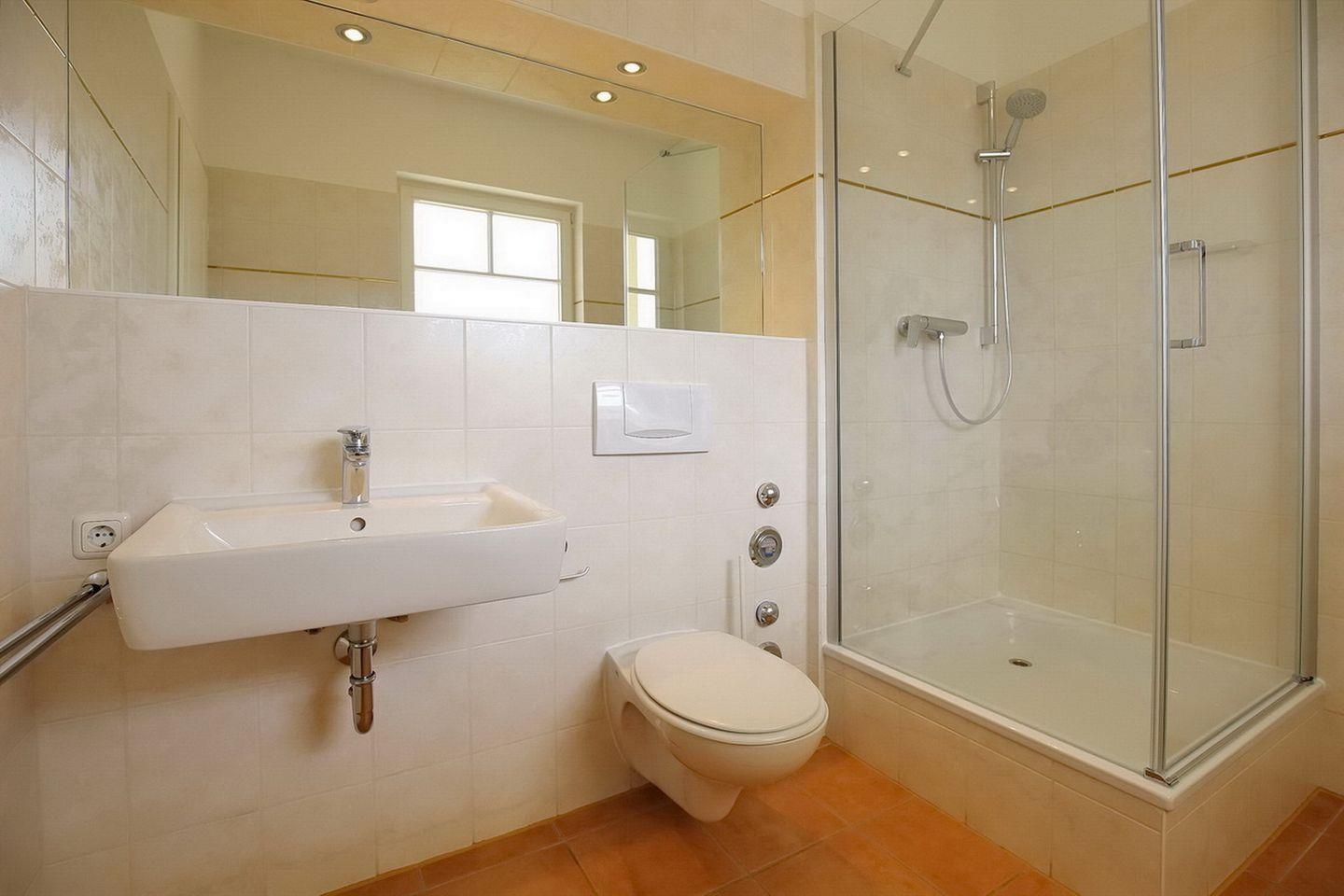Ein gefliestes Duschbad mit Fenster ist ebenfalls vorhanden. Diese Nichtraucherferienwohnung ist mit Parkett ausgelegt und modern eingerichtet.