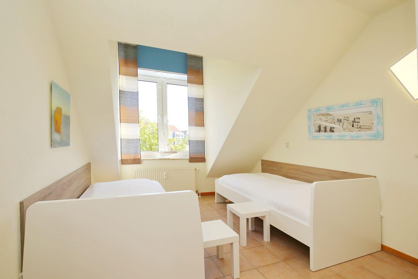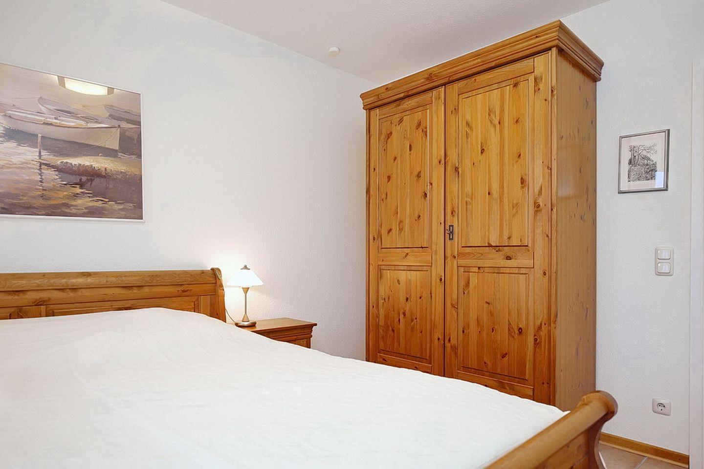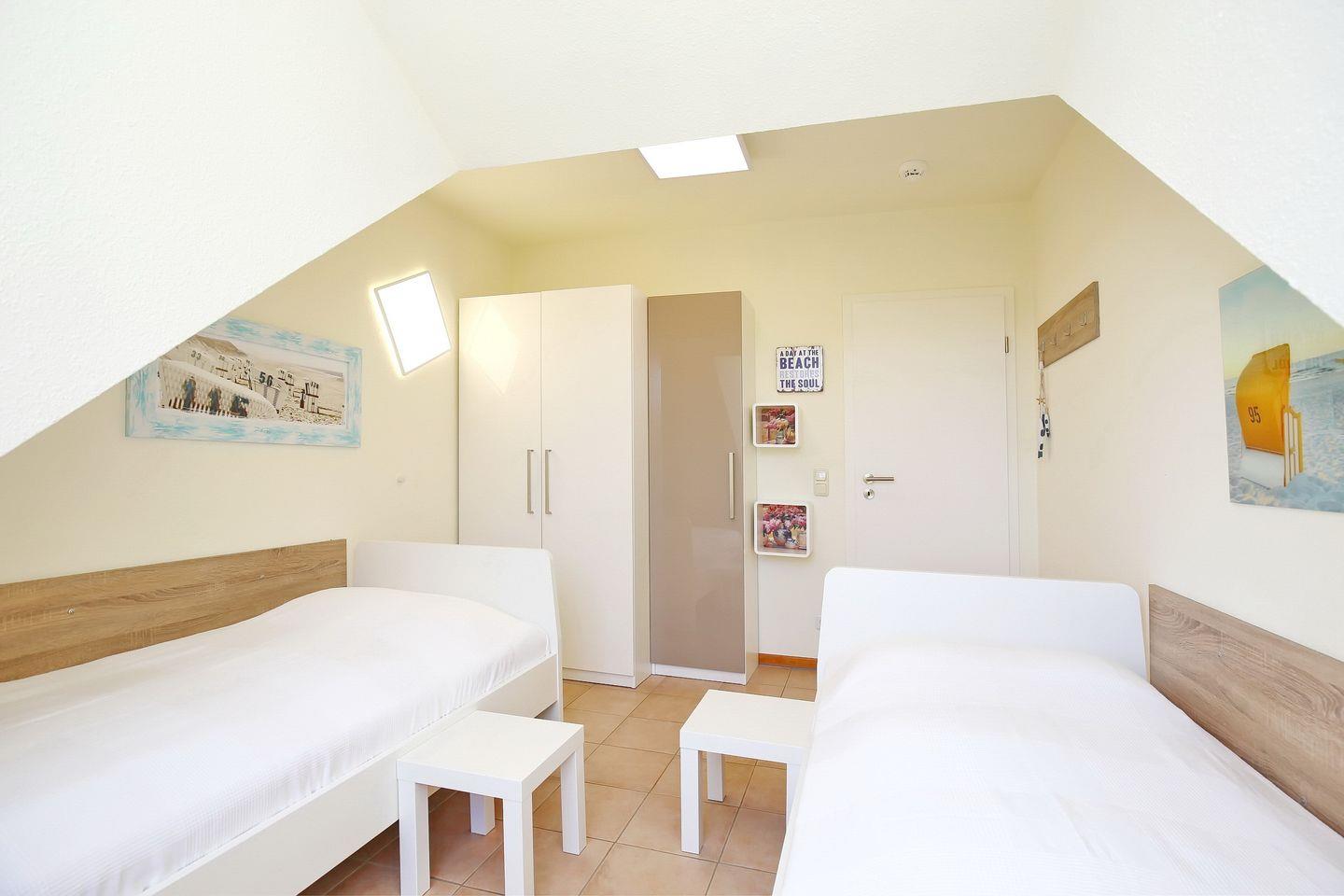 Im ersten Schlafzimmer sorgen ein bequemes Doppelbett (2 x 90 x 200 cm) und ein großer Kleiderschrank für deinen Komfort. Im zweiten Schlafraum dienen zwei Einzelbetten (90 x 200 cm) für einen erholsamen Schlaf. Dort kannst du im Kleiderschrank dein Mitgebrachtes unterbringen. Die Fenster werden mit Vorhängen abgedunkelt.