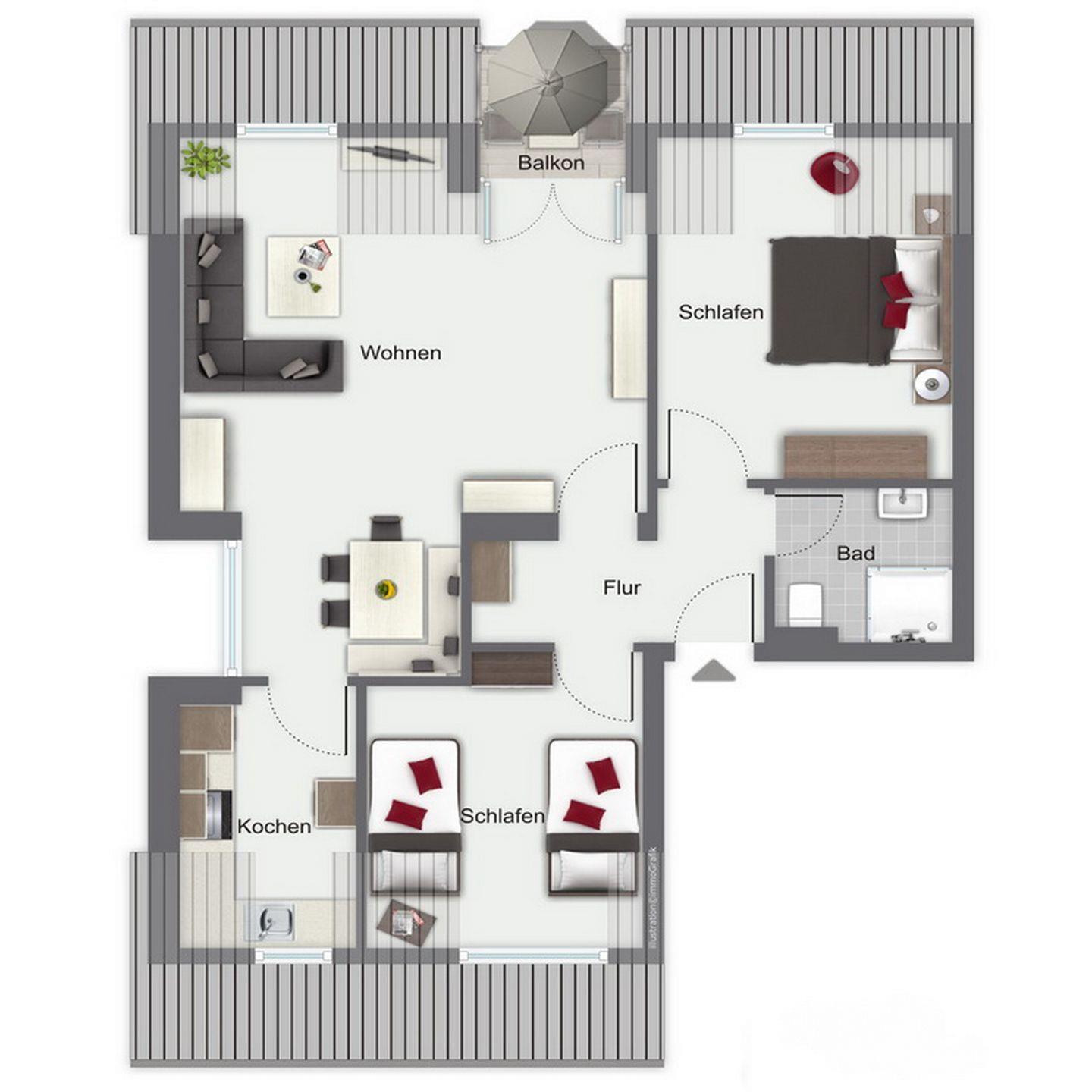 Vom Wohnzimmer aus erreichst du den möblierten Balkon. Dieser lädt zur Entspannung und Betrachtung von schönen Sonnenuntergängen ein. Eine bequeme Couchgarnitur und ein liebevoll gestalteter Essplatz sorgen für Gemütlichkeit. Eine Stereoanlage, eine Spieleauswahl sowie ein Flachbild-TV mit DVD-Player gehören ebenfalls zur Ausstattung.