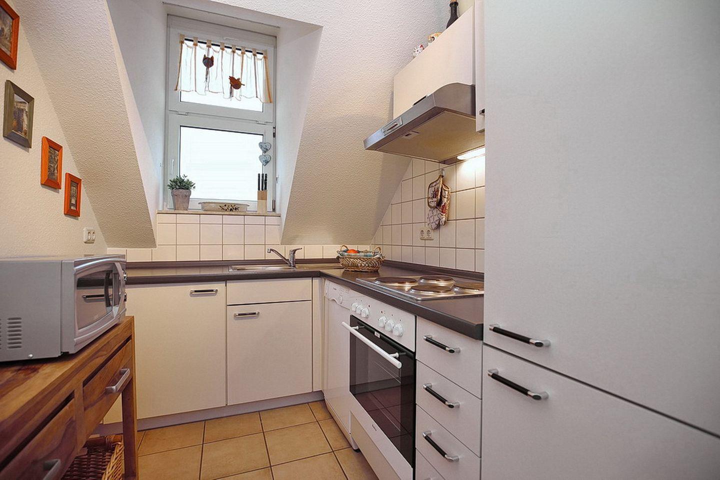In der separaten Küche gibt es einen Geschirrspüler, 4-Plattenkochfeld, Backofen, Mikrowelle und einen Kühlschrank mit Gefrierfach. Ein Kinderhochstuhl ist in dieser Wohnung inklusive. Als Bodenbelag wurde in allen Räumen Fliese gewählt.