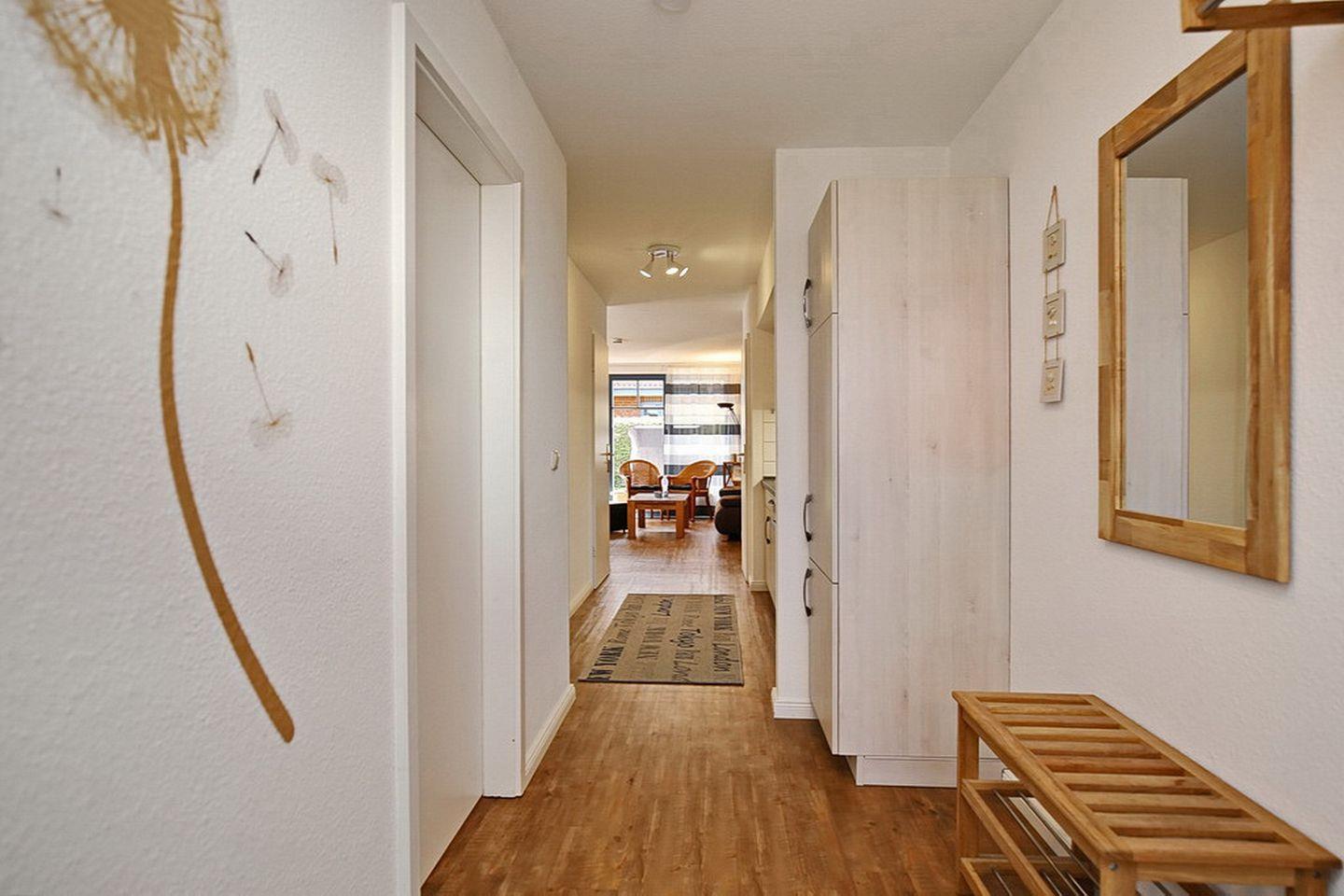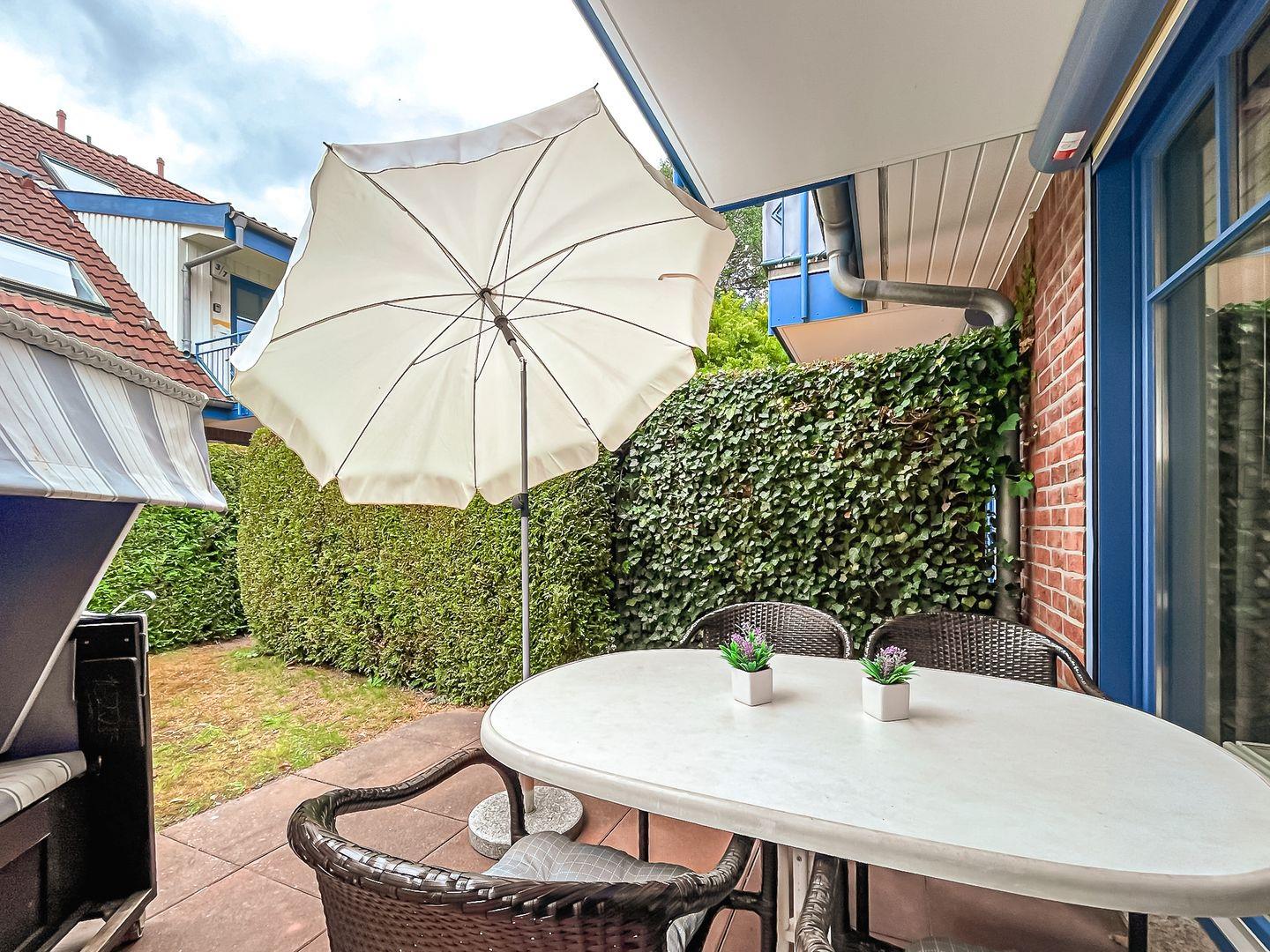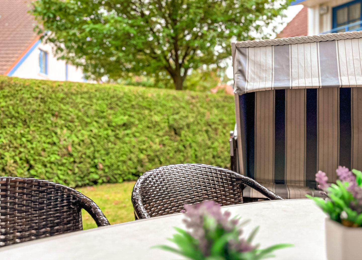Die sonnige Erdgeschoss-Wohnung liegt am Ende des Hauses 4. Auf ca. 55 m² gibt es einen Wohn- und Essbereich, ein Schlafzimmer, eine Küchenzeile und ein Duschbad. Die Terrasse mit eigenem Strandkorb ist süd-westlich ausgerichtet. Zum Strand sind es von der Ferienanlage Papillon etwa 250 m.