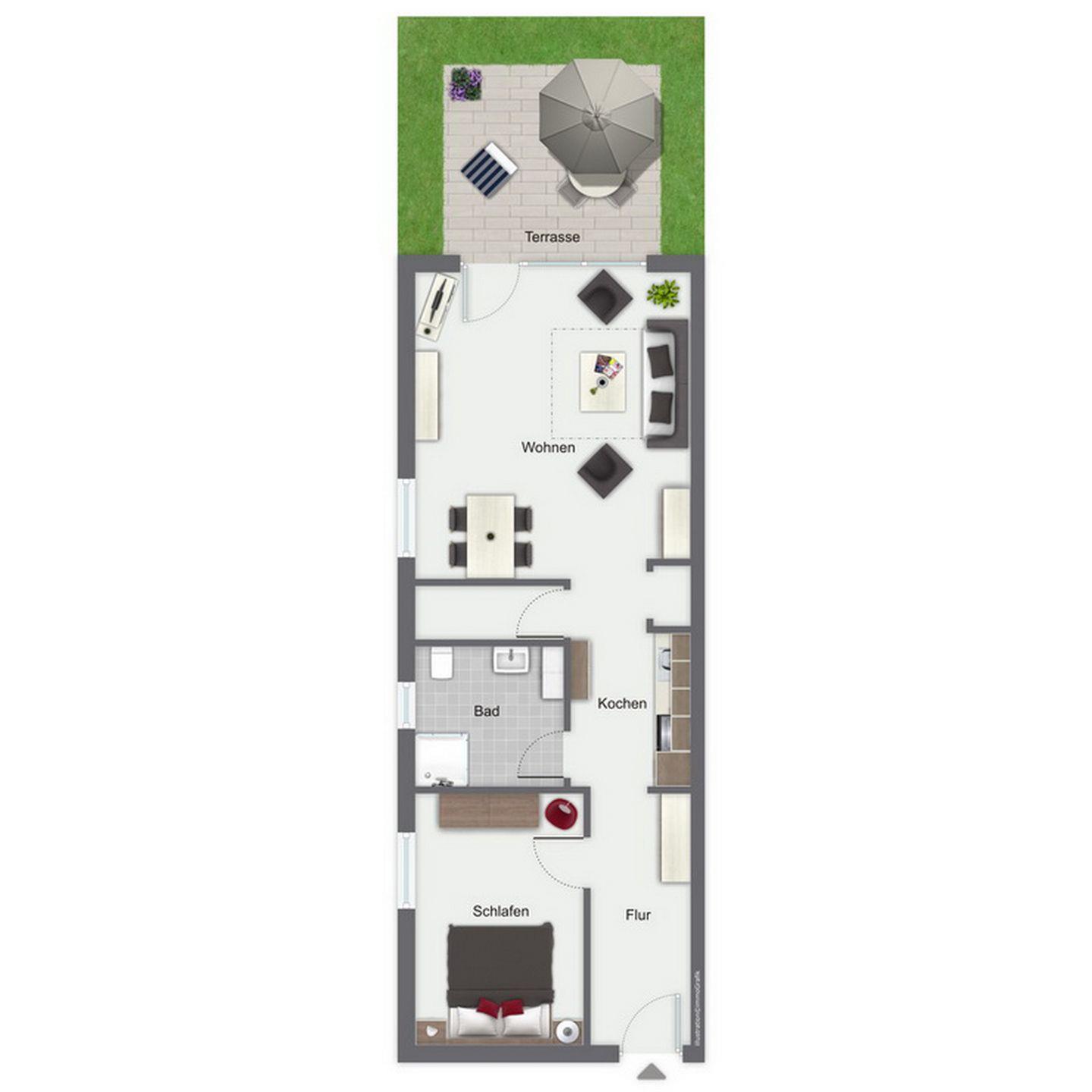 Im Wohnzimmer, aus dem du auch die Terrasse erreichst, steht ein großes Schlafsofa (160 x 195 cm) für zwei Personen. Am Esstisch finden bis zu vier Personen Platz. Für die kleinen Gäste steht ein Hochstuhl bereit. Der Flachbild-TV sorgt für Abwechslung.