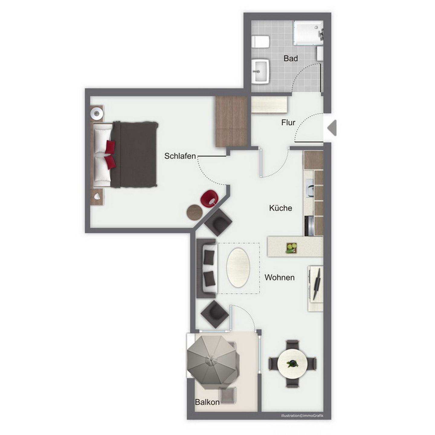 Du verfügst in dieser Ferienwohnung auf ca. 45 m² Wohnfläche im 2. Obergeschoss über ein Wohnzimmer mit integrierter Küchenzeile, ein Schlafzimmer sowie ein Duschbad. Der Balkon ist zur Seeseite ausgerichtet und mit bequemen Balkonmöbeln ausgestattet. Zum Strand sind es nur ca. 100 m.