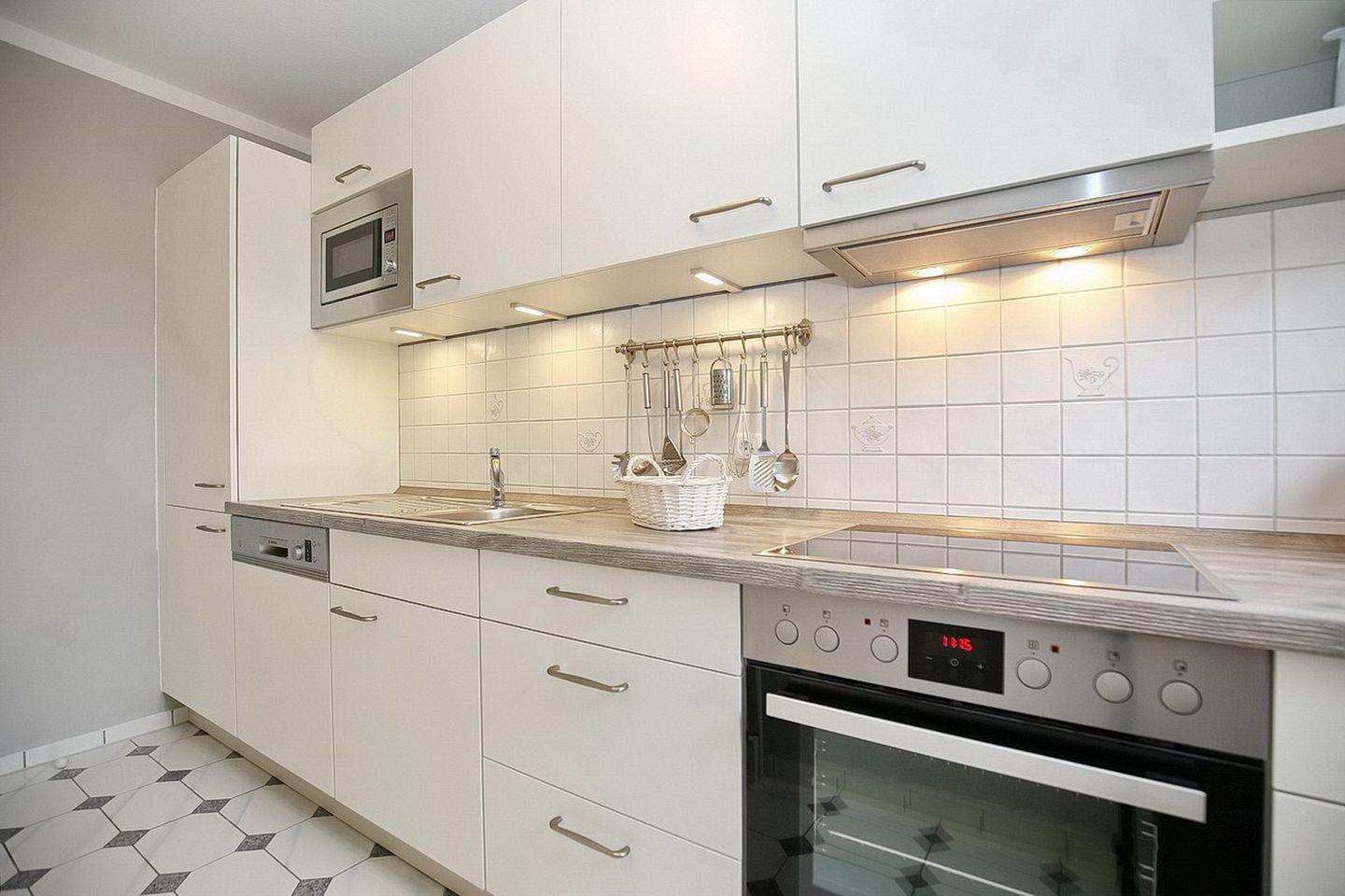 Die separate Küche verfügt über einen Herd mit einem 4-Platten-Cerankochfeld und Backofen, eine Mikrowelle, eine Kühl-Gefrierkombination und einen Geschirrspüler. Ausreichend Geschirr, Gläser und vieles mehr komplettieren die Ausstattung. In dieser Nichtraucherwohnung sind auch keine Haustiere erlaubt.
