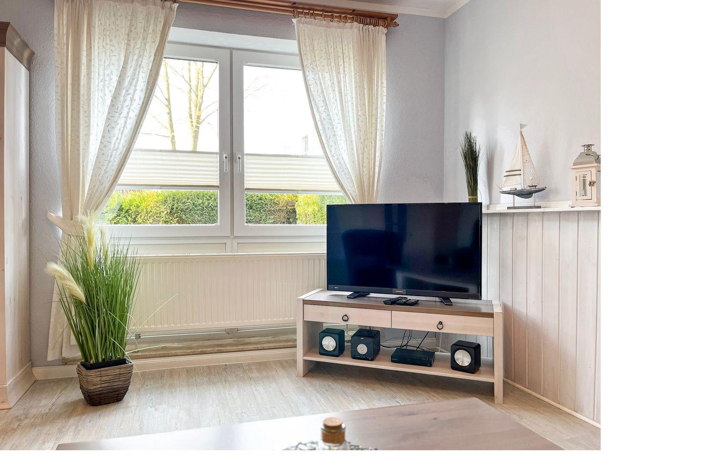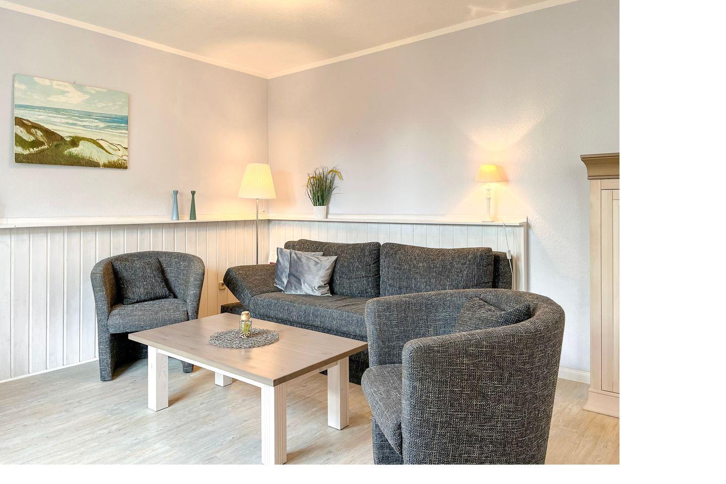Das geräumige Wohnzimmer ist modern und sehr geschmackvoll eingerichtet. Die sehr hochwertige Schlafcouch (Kopfteile verstellbar, 150 x 200 cm) bietet bequeme Schlafplätze für 2 Personen. Für deine Multimediaunterhaltung sorgen ein Flachbild-TV, ein DVD-Player und eine Stereoanlage. Ebenso steht eine kleine Auswahl an Büchern und Spielen bereit. An dem gemütlichen Essplatz können sich bis zu 4 Personen kulinarischen Genüssen hingeben.