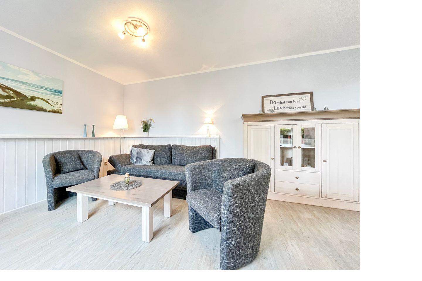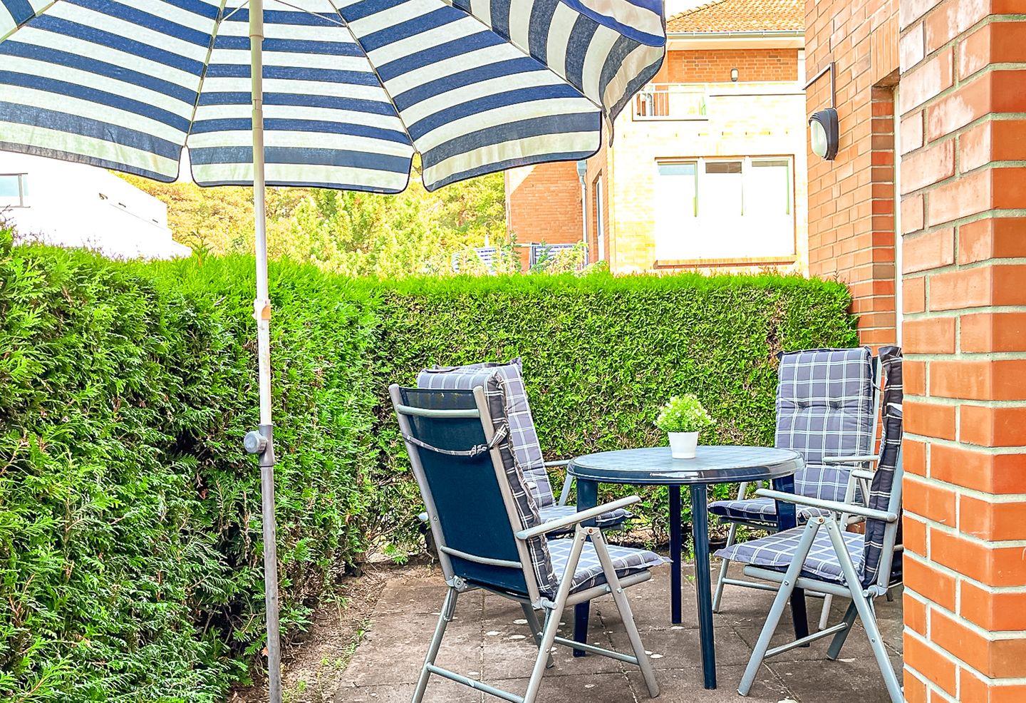 Diese gemütliche, 48 m² große, 2-Zimmer-Ferienwohnung befindet sich im Erdgeschoss und verfügt über eine westlich ausgerichtete Terrasse, die liebevoll möbliert und urlaubsgerecht ausgestattet ist. Du hast ein Wohnzimmer, ein Schlafzimmer, eine separate Küche und ein Duschbad. Die Entfernung zum Strand beträgt nur ca. 100 Meter.