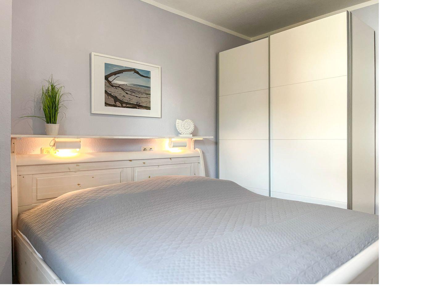 Das gepflegte Schlafzimmer verfügt über ein komfortables Doppelbett (2 x 90 x 200 cm) und einen 3-türigen Kleiderschrank mit einem Ganzkörperspiegel. Hier findet deine Urlaubsgarderobe genügend Platz.