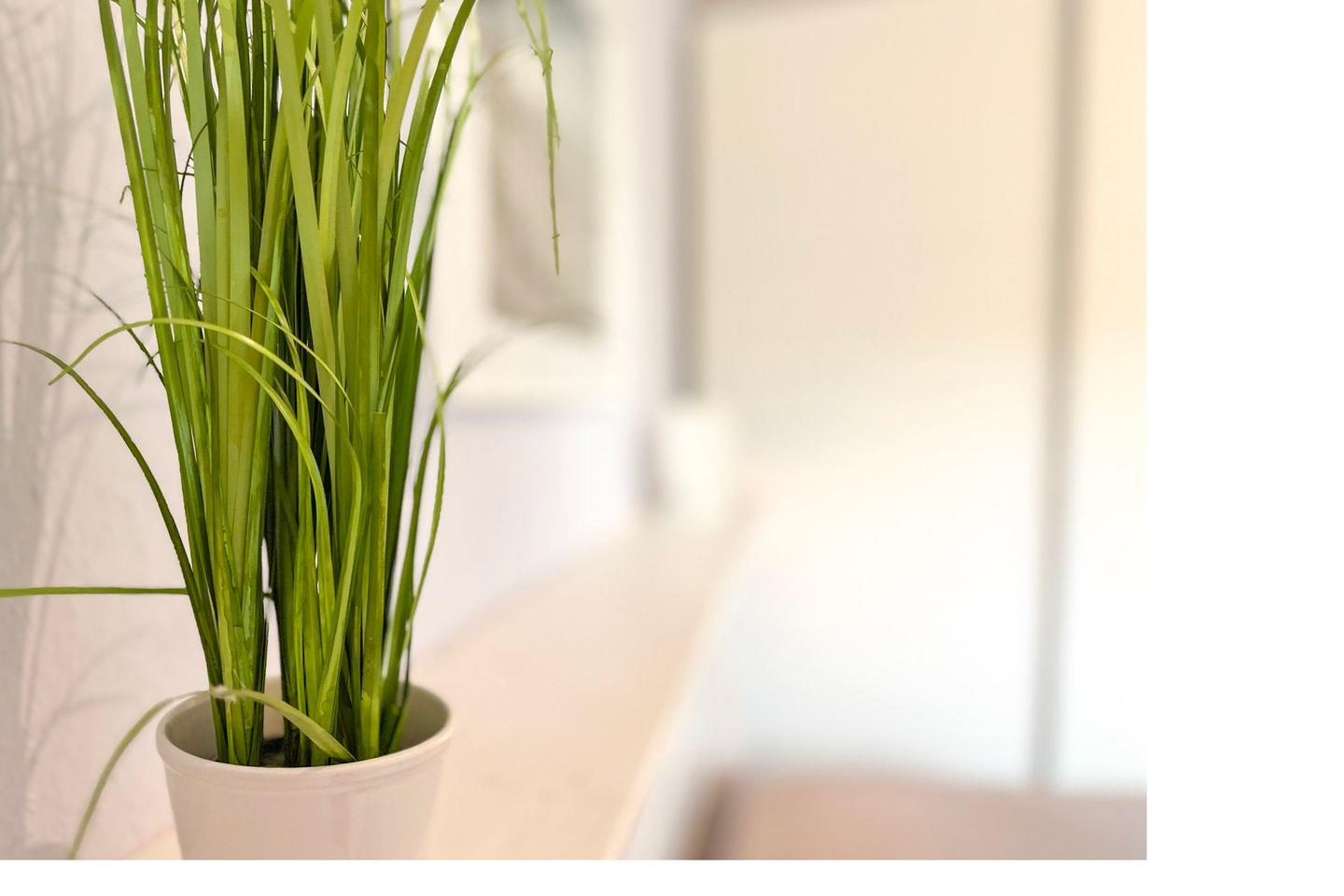 Die Fußböden im Wohnzimmer und Schlafzimmer sind mit sehr hochwertigem Laminat ausgelegt. Als Sicht- und Sonnenschutz dienen Plissees und Vorhänge.