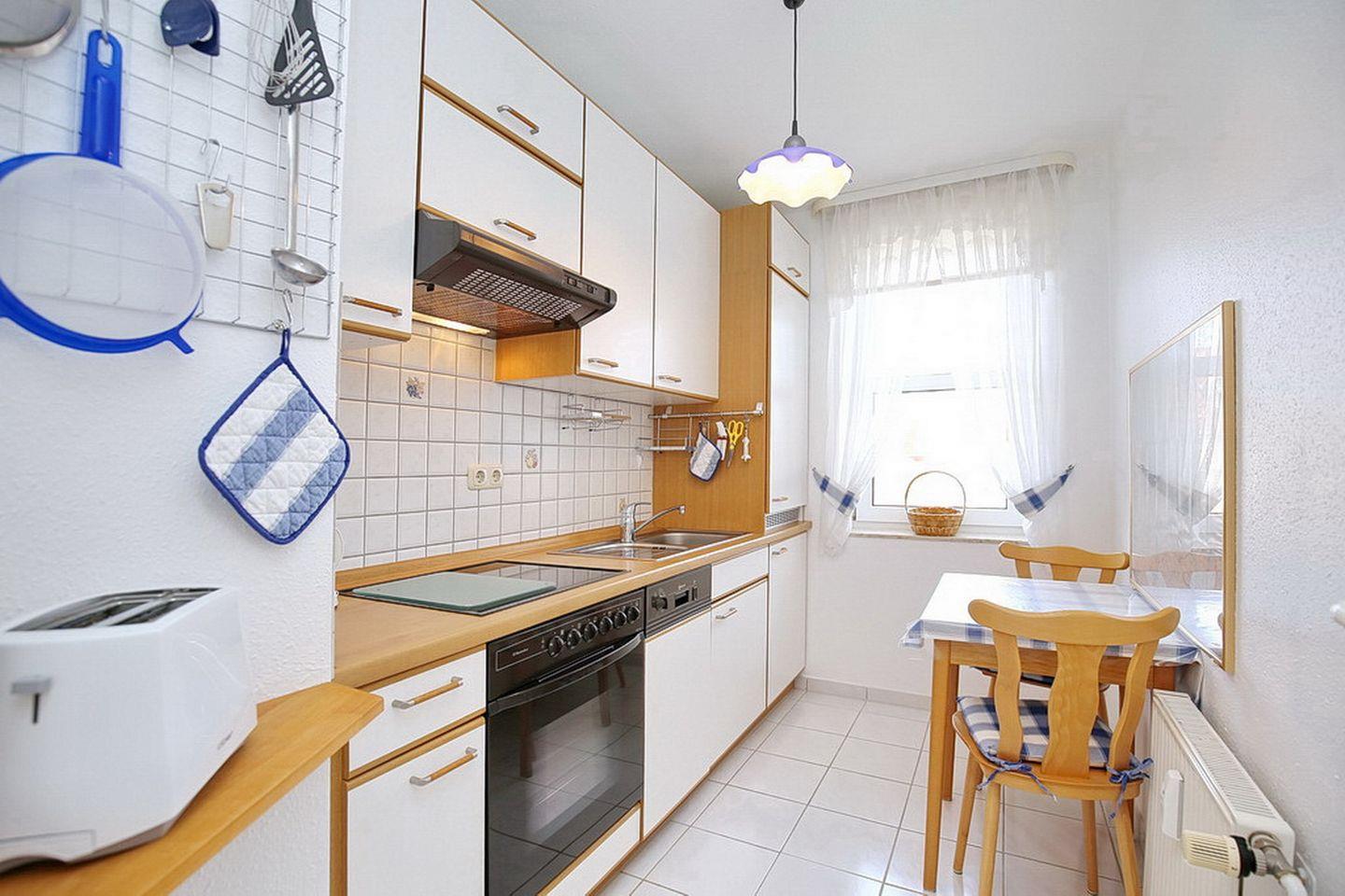Die Küchenzeile ist mit einem Backofen mit Grillfunktion, einem Cerankochfeld, einem Geschirrspüler und einem Kühlschrank mit Gefrierfach ausgestattet. Eine Waschmaschine ist ebenfalls vorhanden. Als Bodenbelag wurde in der gesamten Wohnung Fliesen gewählt.