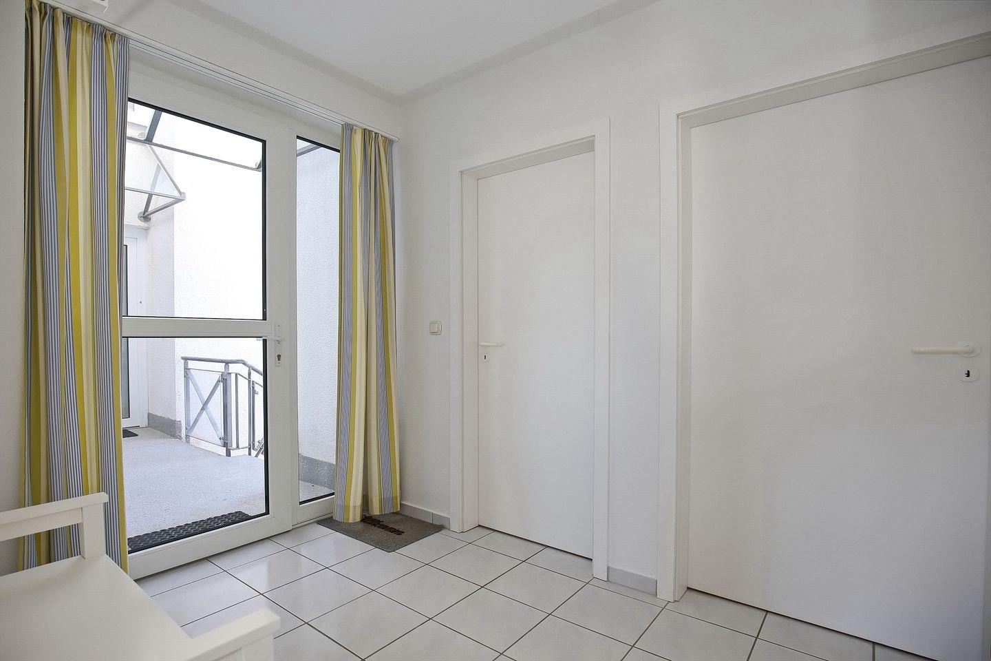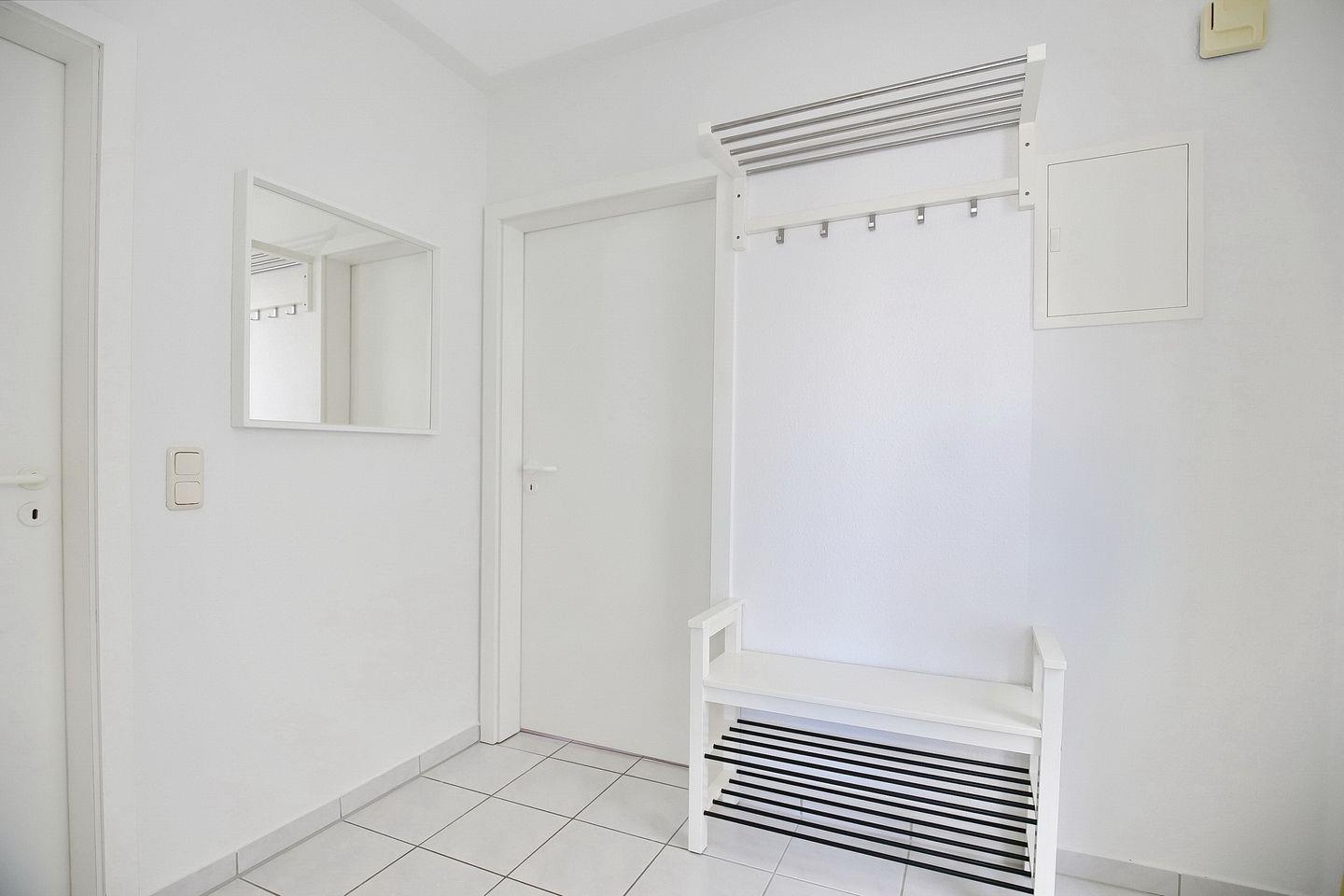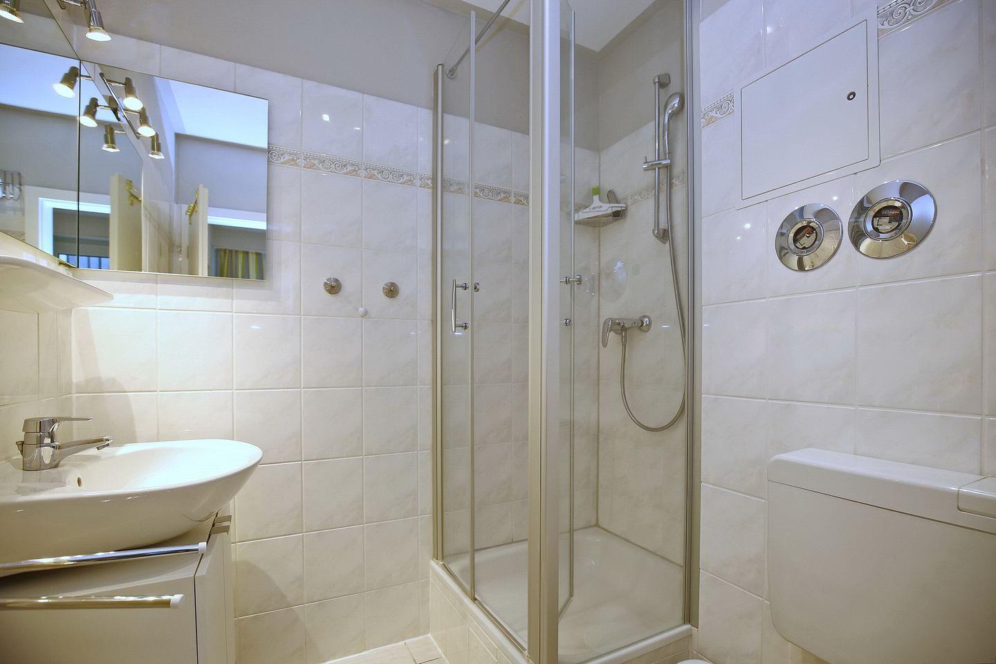 Zum gefliesten Nassbereich gehört eine Handtuchheizung. In dieser Nichtraucherwohnung sind Haustiere nicht erlaubt.