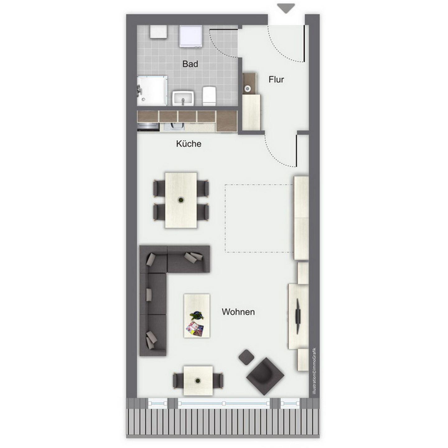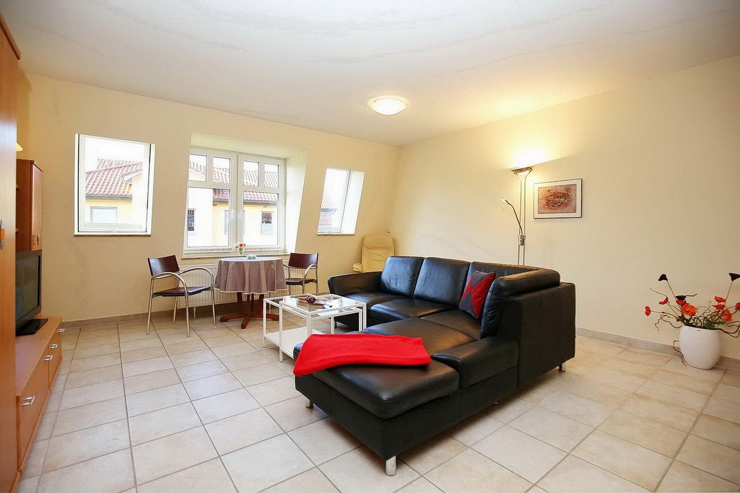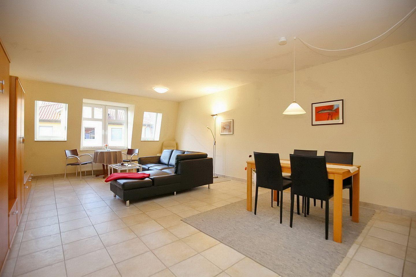 Die Ferienwohnung liegt im 2. OG und bietet dir auf ca. 48 m² ein Wohnzimmer mit integrierter Küche sowie ein Duschbad.