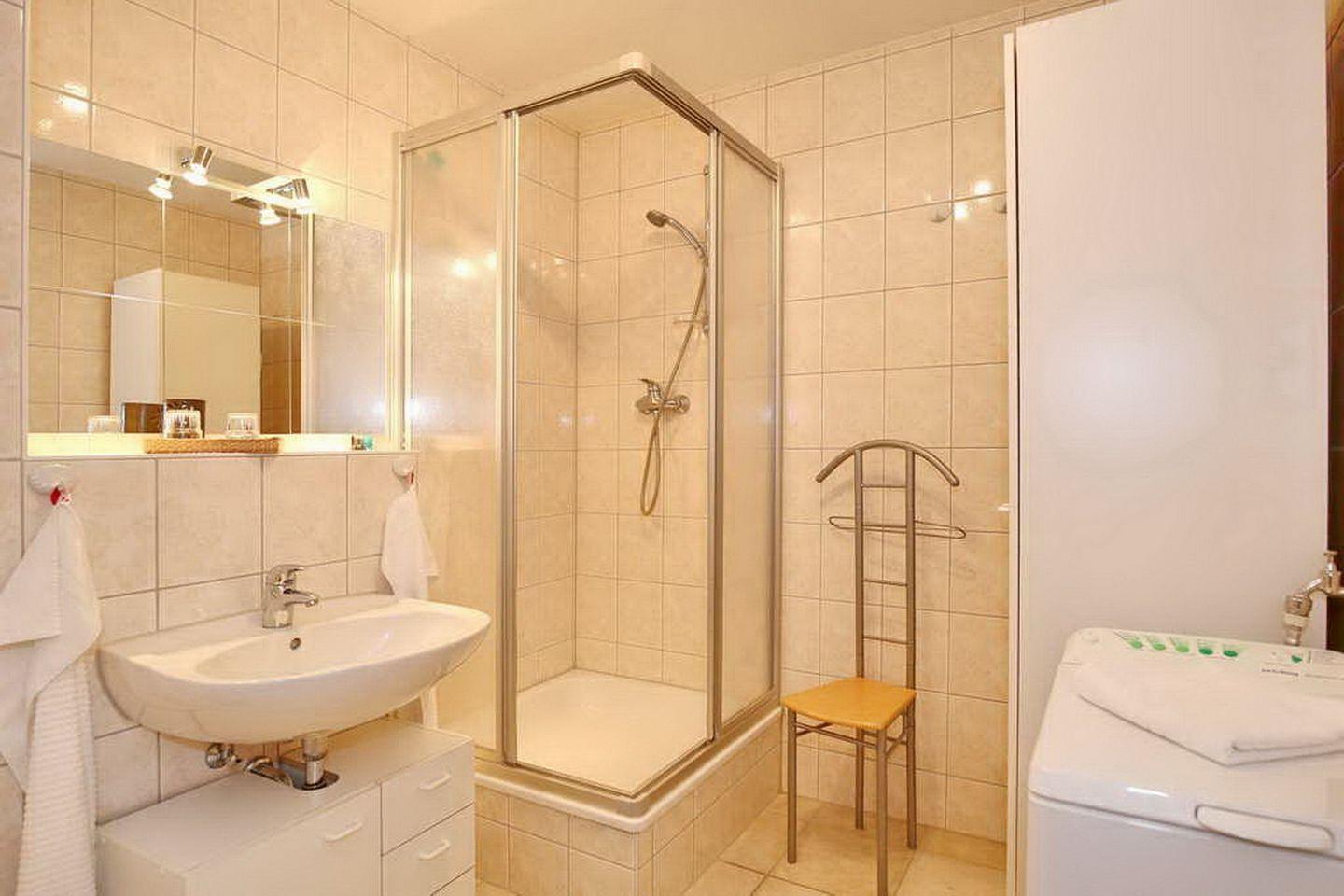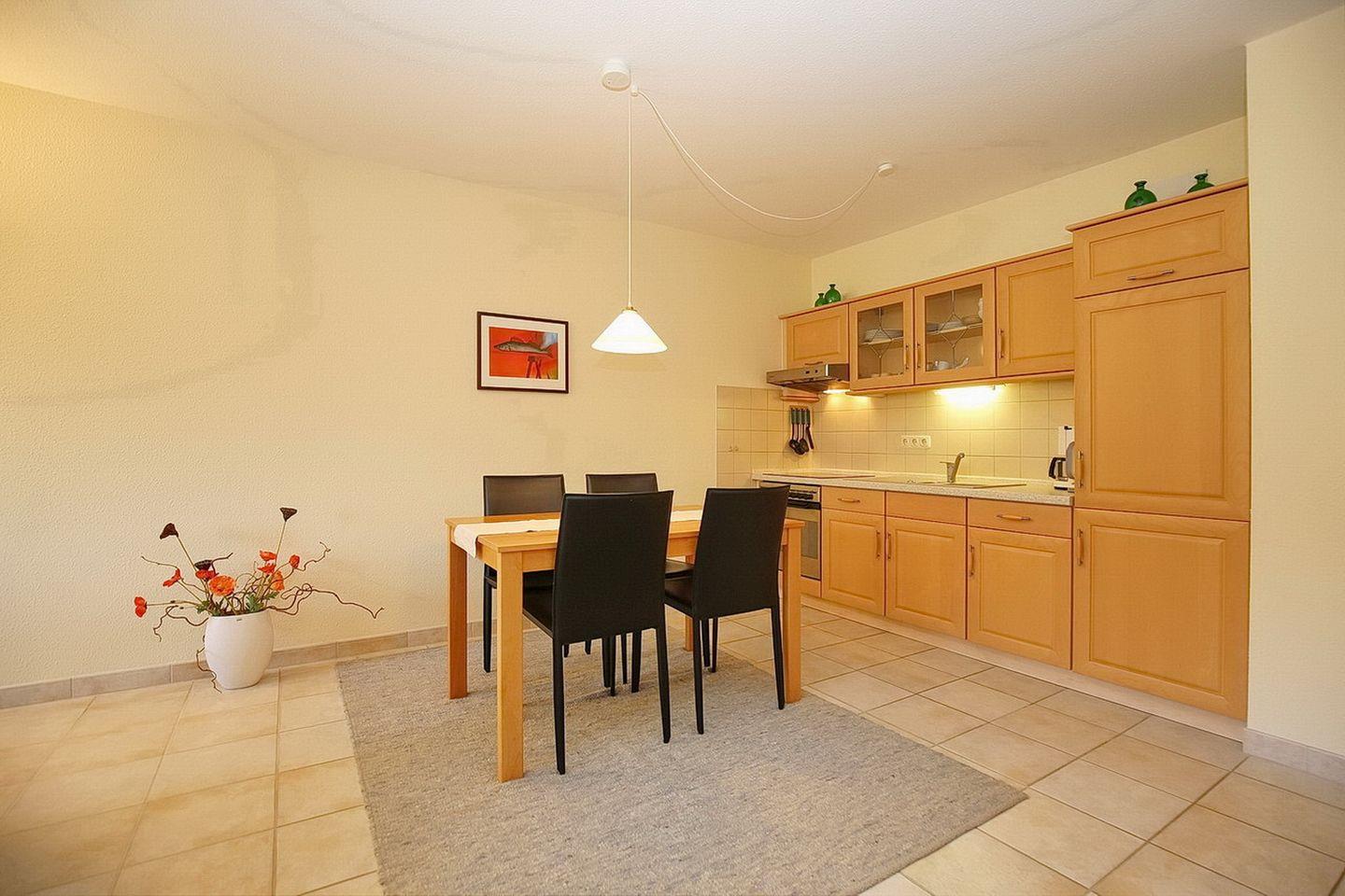 Die moderne Küchenzeile ist ausgestattet mit einem Kühlschrank inkl. Gefrierfach, einem 4-Platten-Cerankochfeld und einem integrierten Backofen. Das Badezimmer verfügt über einen Waschtisch, eine große Dusche sowie eine Waschmaschine. Die gesamte Wohnung ist gefliest. Haustiere sind in dieser Nichtraucherwohnung nicht erlaubt.