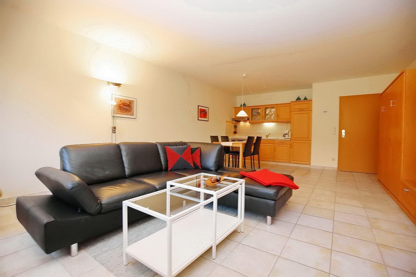 Auf der bequemen Leder-Eckcouch kannst du nach langen Strandtagen entspannen oder den einladenden Lesesessel nutzen, um den Tag bei einem guten Buch ausklingen zu lassen. Ein TV-Flatscreen nebst DVD-Player und eine Stereoanlage mit USB- sowie iPod/iPhone-Schnittstelle bieten umfangreiche Unterhaltung. WLAN (ohne Gewähr) kannst du kostenfrei nutzen. Zum Schlafen steht dir ein Schrank-Doppelbett (2 x 80 x 200 cm) zur Verfügung, das sich einfach und leicht öffnen und schließen lässt. So hast du tagsüber viel Platz in deiner Ferienwohnung. Als Sichtschutz wurden im Wohnzimmer Plissees verwendet.
