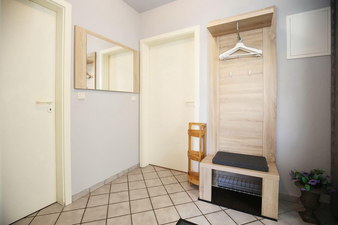 Das geflieste Duschbad ist mit Dusche und WC ausgestattet. Der Boden ist gefliest. In dieser Raucherwohnung sind maximal zwei Haustiere gestattet. Ein Bollerwagen (ohne Gewähr) sowie WLAN (ohne Gewähr) ist inklusive.