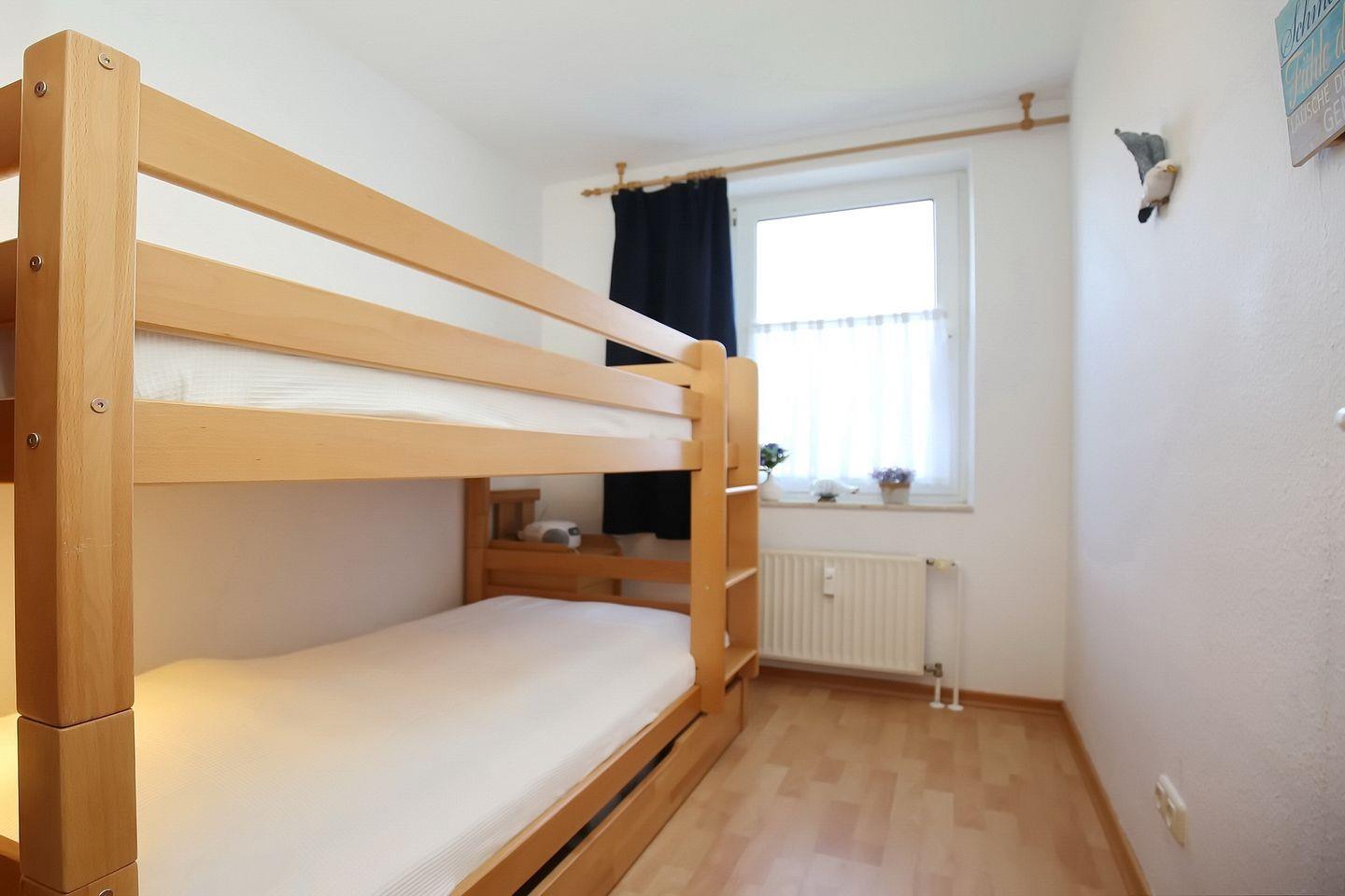 Die integrierte Küche bietet dir einen Kühlschrank mit Gefrierfach, einen Backofen, ein 4-Platten-Ceranfeld, eine Mikrowelle sowie einen Geschirrspüler. Das Schlafzimmer ist mit einem Doppelbett (2 x 90 x 200 cm) und einem 3-türigem Kleiderschrank eingerichtet. Das zweite Schlafzimmer verfügt über ein Etagenbett. Die Fenster haben Vorhänge. In beiden Schlafzimmern ist der Bodenbelag Laminat.