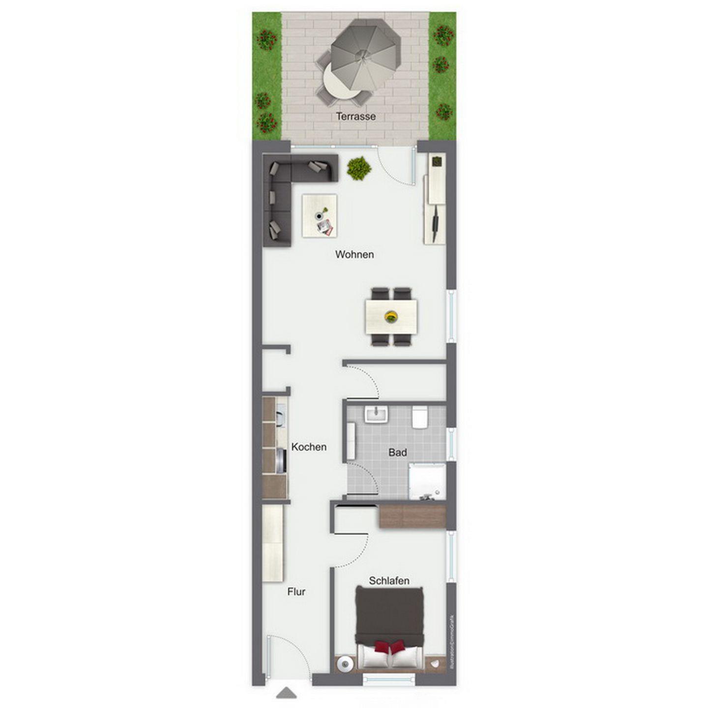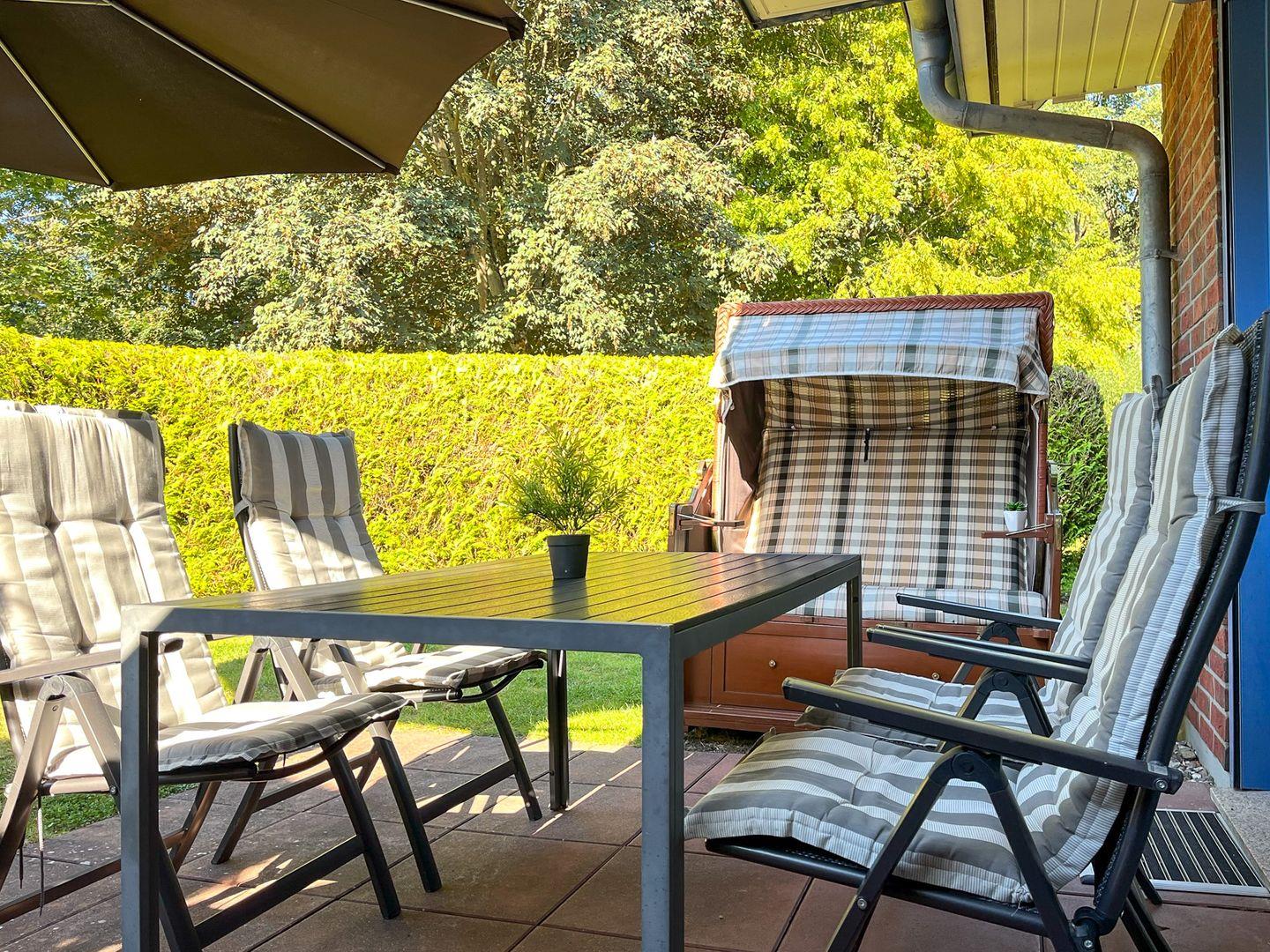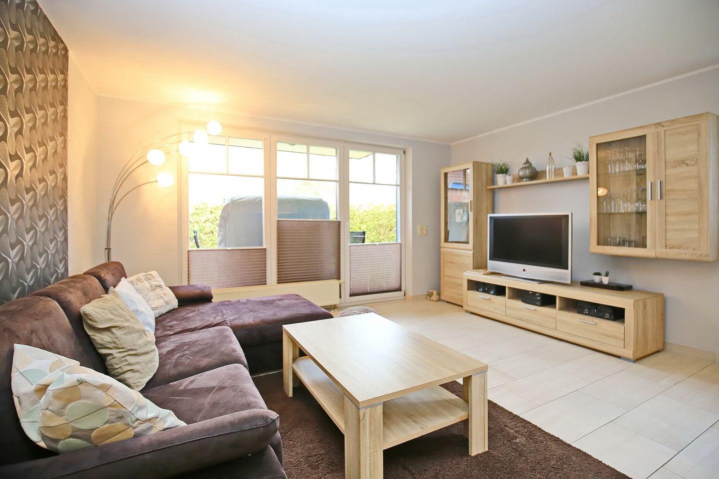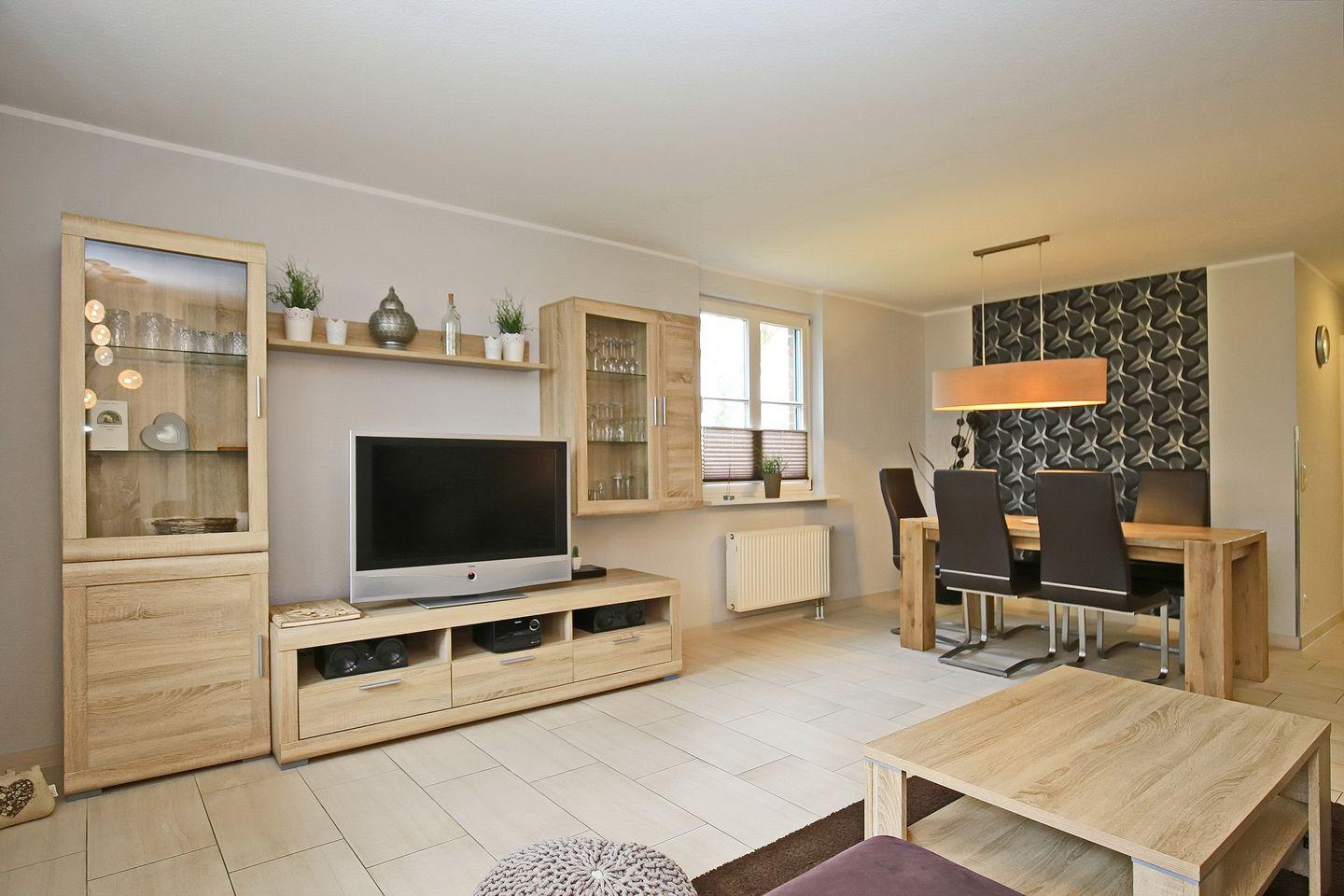 Vom sonnendurchfluteten Wohnzimmer mit bodentiefen Terrassenfenstern erreicht man die südwestlich ausgerichtete möblierte Terrasse. Im Wohn-/Essbereich, mit seinen hochwertigen Fliesen, kannst du auf der bequemen Polsterecke (mit Schlaffunktion, 130 x 190 cm) entspannen. Genieße deine Mahlzeiten am modernen Esstisch. Für deine Unterhaltung sorgen der große Flachbild TV (40 Zoll, 102 cm), die moderne Musikanlage und der Blu-ray-Player. Eine kleine Auswahl an Kinderspielzeug lässt Kinderaugen strahlen.