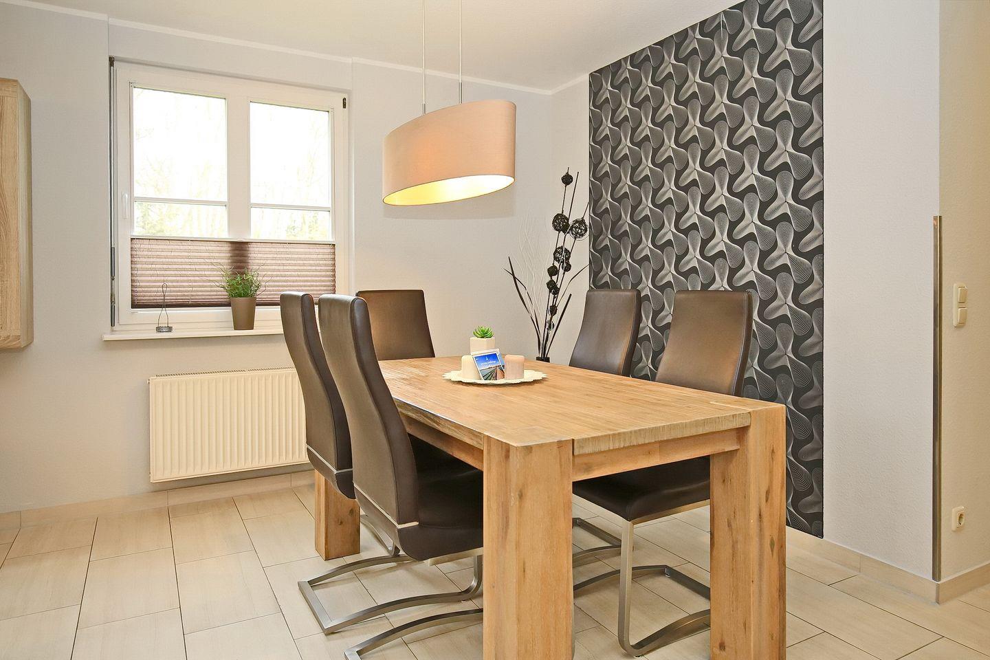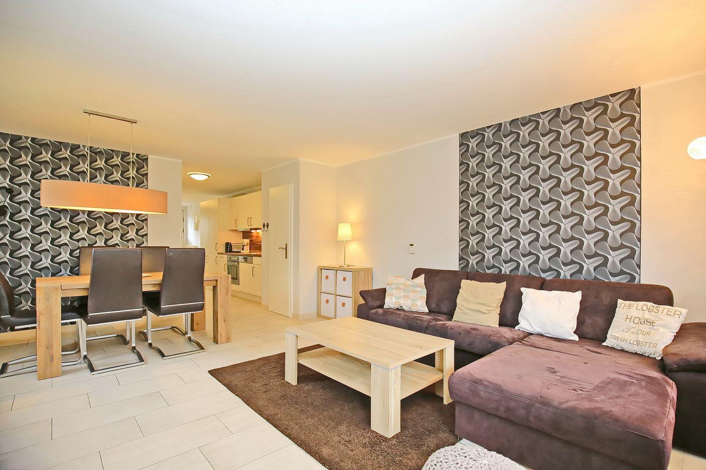 Am Ende des Hauses bietet dir diese exklusiv eingerichtete Ferienwohnung auf 55 m² eine ansprechende Unterkunft. Es stehen dir ein Wohn-/Essbereich, ein Schlafzimmer, eine Küchenzeile und ein Duschbad zur Verfügung. Zum Strand sind es vom Feriendorf Papillon etwa 250 m.