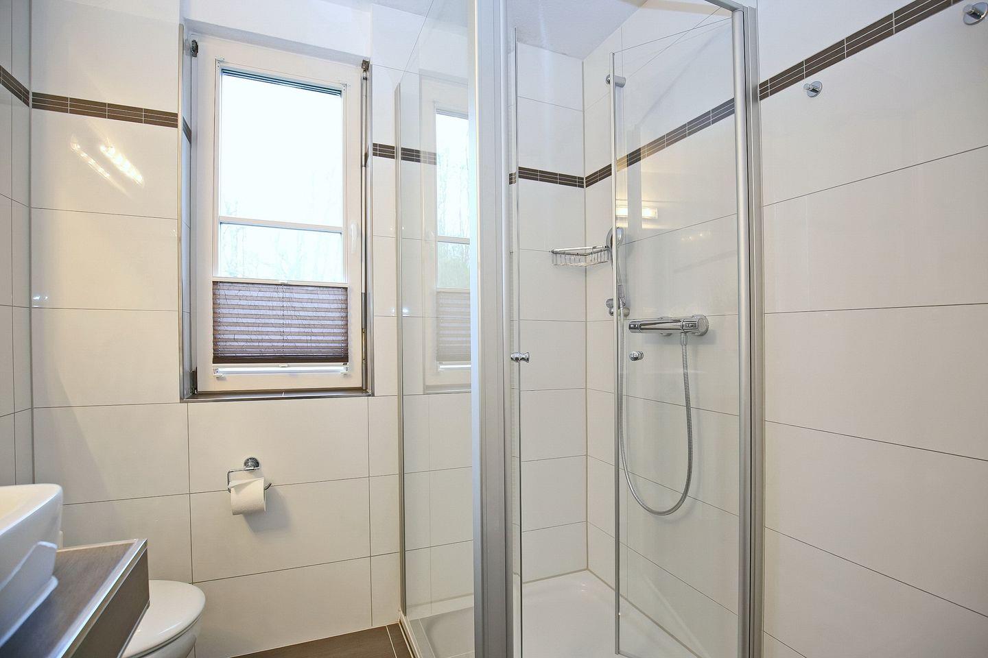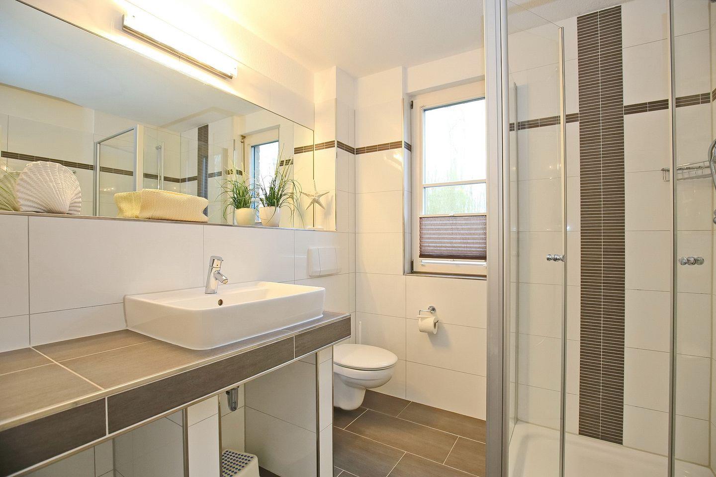 Das Bad mit Fenster ist mit einem modernen Waschtisch und einer ebenerdigen Dusche ausgestattet. Weitere Extras in der Ausstattung sind ein Bügelbrett und Bügeleisen sowie WLAN (ohne Gewähr). Fahrräder können im Fahrradkeller sicher abgestellt.