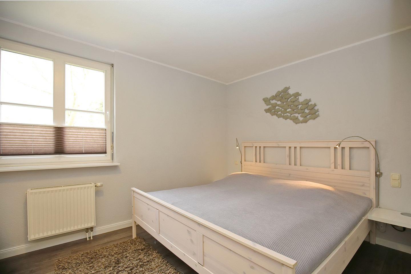 Im separaten Schlafzimmer befinden sich ein großes Doppelbett (2x 90cm x 200 cm) sowie ein 3-türiger Kleiderschrank für deine Urlaubsgarderobe. Du möchtest deine Lieblingssendung im Bett genießen? Der Flachbildfernseher (32 Zoll, 81 cm) an der Wand macht’s möglich. Zur Verdunkelung gibt es Außenjalousien an allen Fenstern.