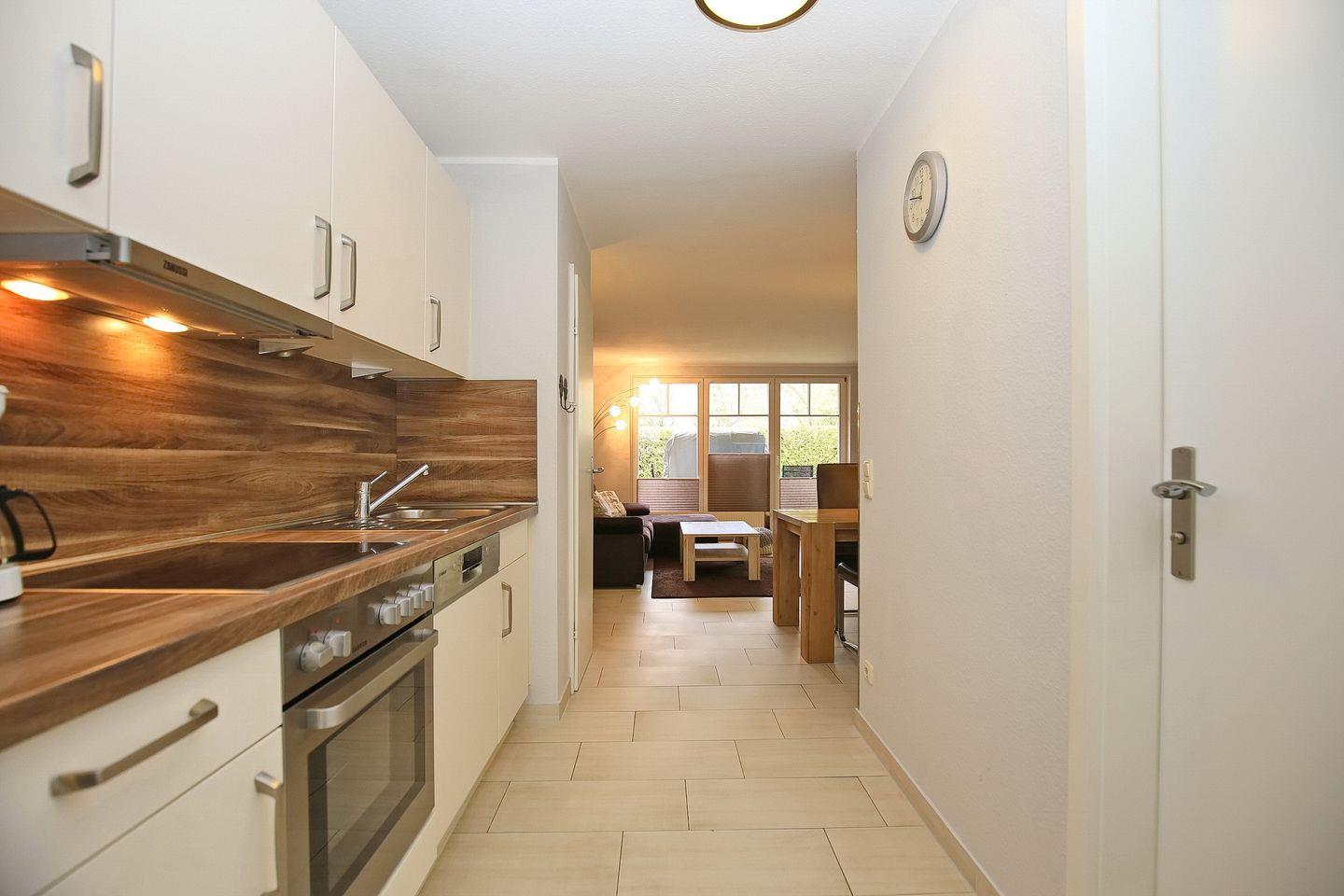 Die im Flur gelegene und im offenen Stil gehaltene Küchenzeile ist hochwertig ausgestattet und bietet neben Designgeschirr auch einen Geschirrspüler, ein Cerankochfeld, einen Backofen und einen Kühlschrank mit Gefrierfach.