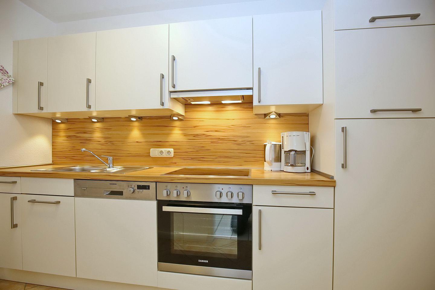 Die moderne Einbauküche ist mit einem 4-Platten-Cerankochfeld, Backofen mit Grill, großem Kühlschrank mit 4**** Eisfach, Geschirrspüler und Mikrowelle voll ausgestattet. Der Wohn- und Schlafbereich in der unteren Ebene ist gefliest.