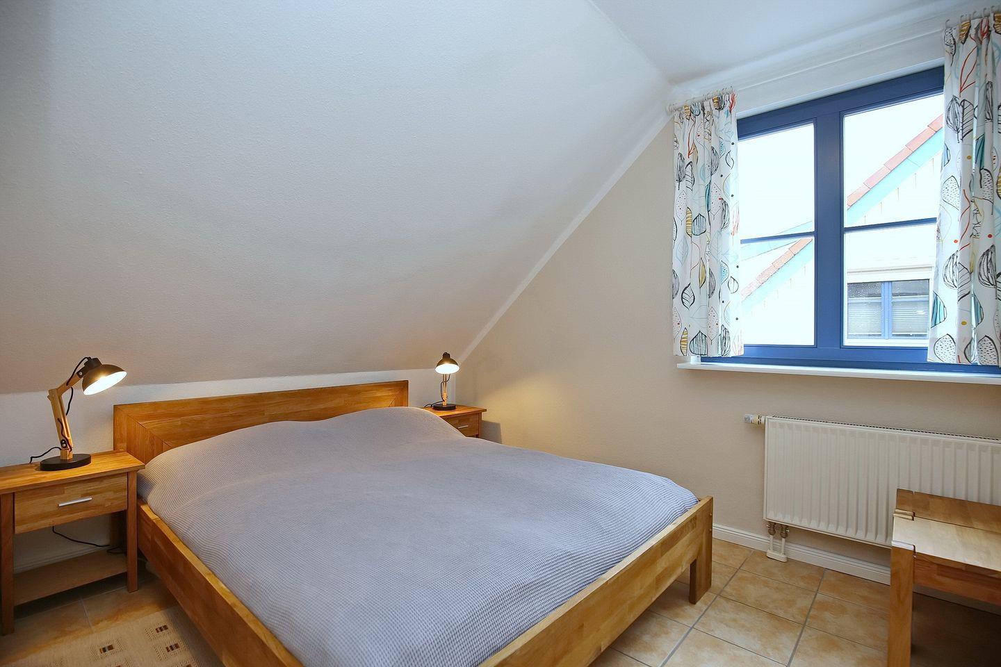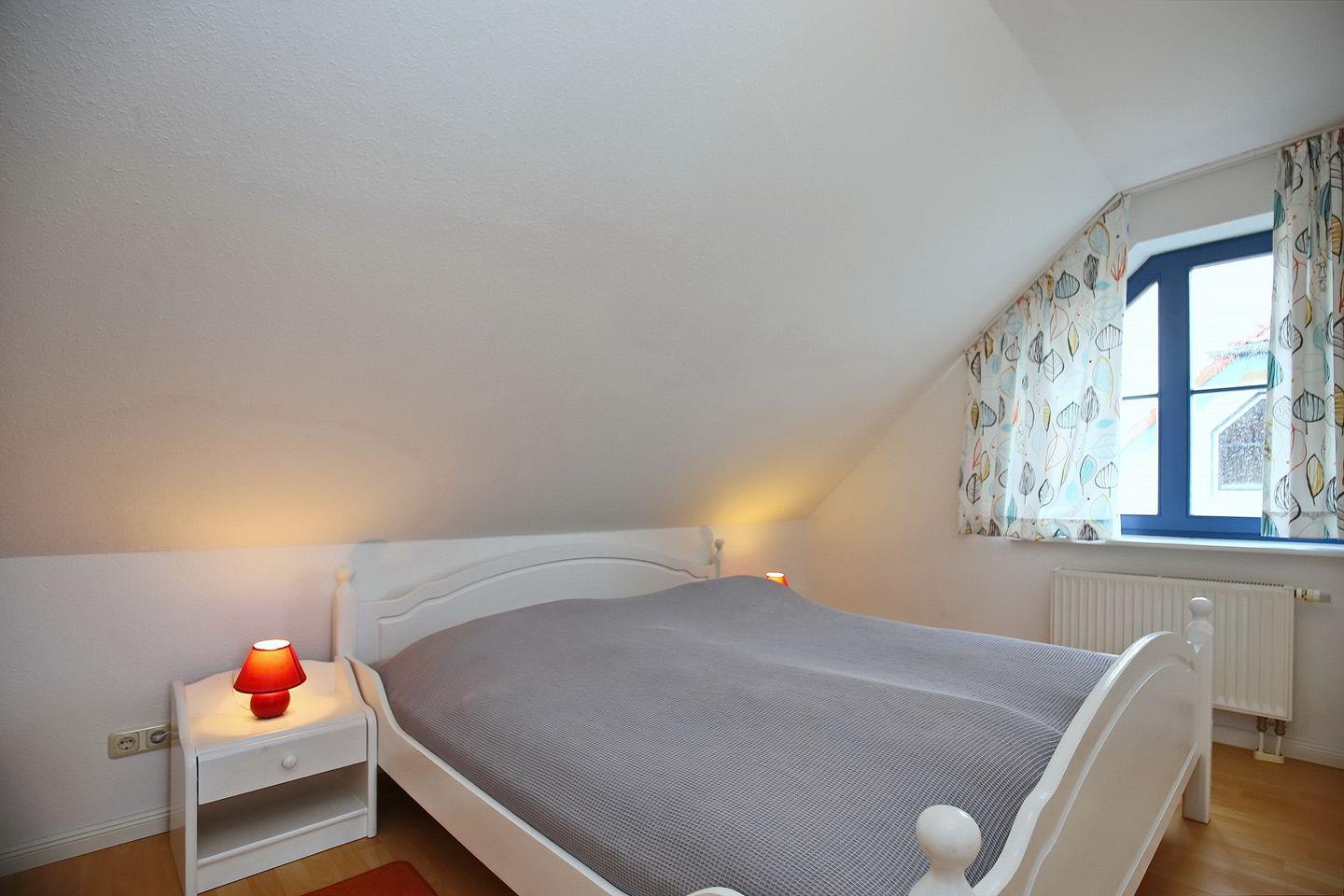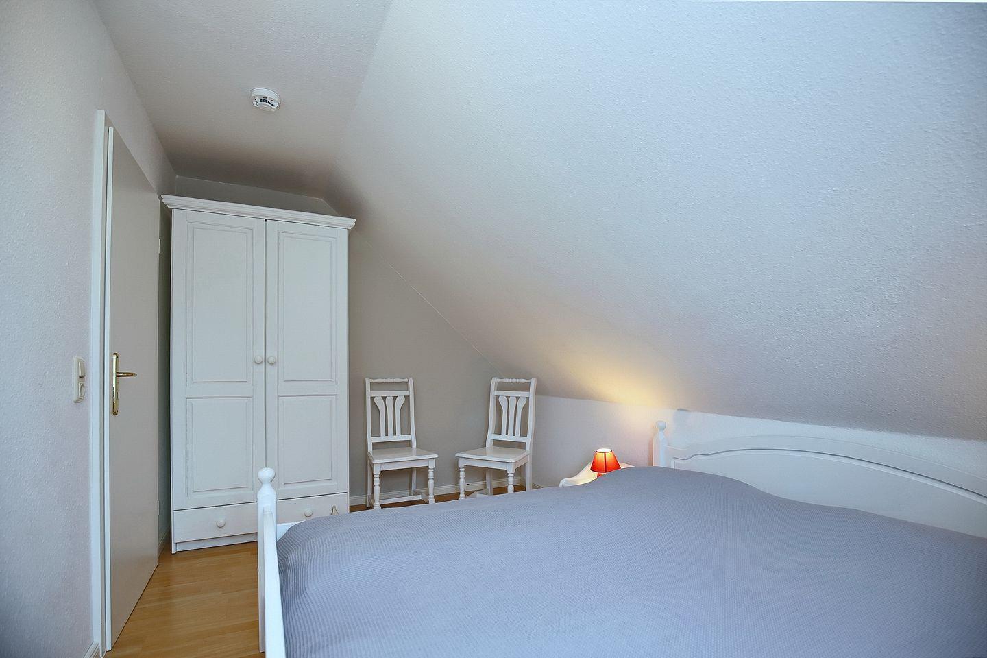 Im Schlafzimmer des 1. OG findest du ein Doppelbett und auch einen Kleiderschrank vor. Die zwei Schlafzimmer im Dachgeschoss erreichst du vom Wohnbereich aus über eine innenliegende Treppe. Beide Schlafräume sind mit jeweils einem Doppelbett (2 x 90 x 200 cm und 2 x 80 x 200 cm) und einem Kleiderschrank eingerichtet. Der Bodenbelag ist hier Laminat. An den Fenstern sind Rollos bzw. Außenjalousien zur Verdunkelung angebracht.