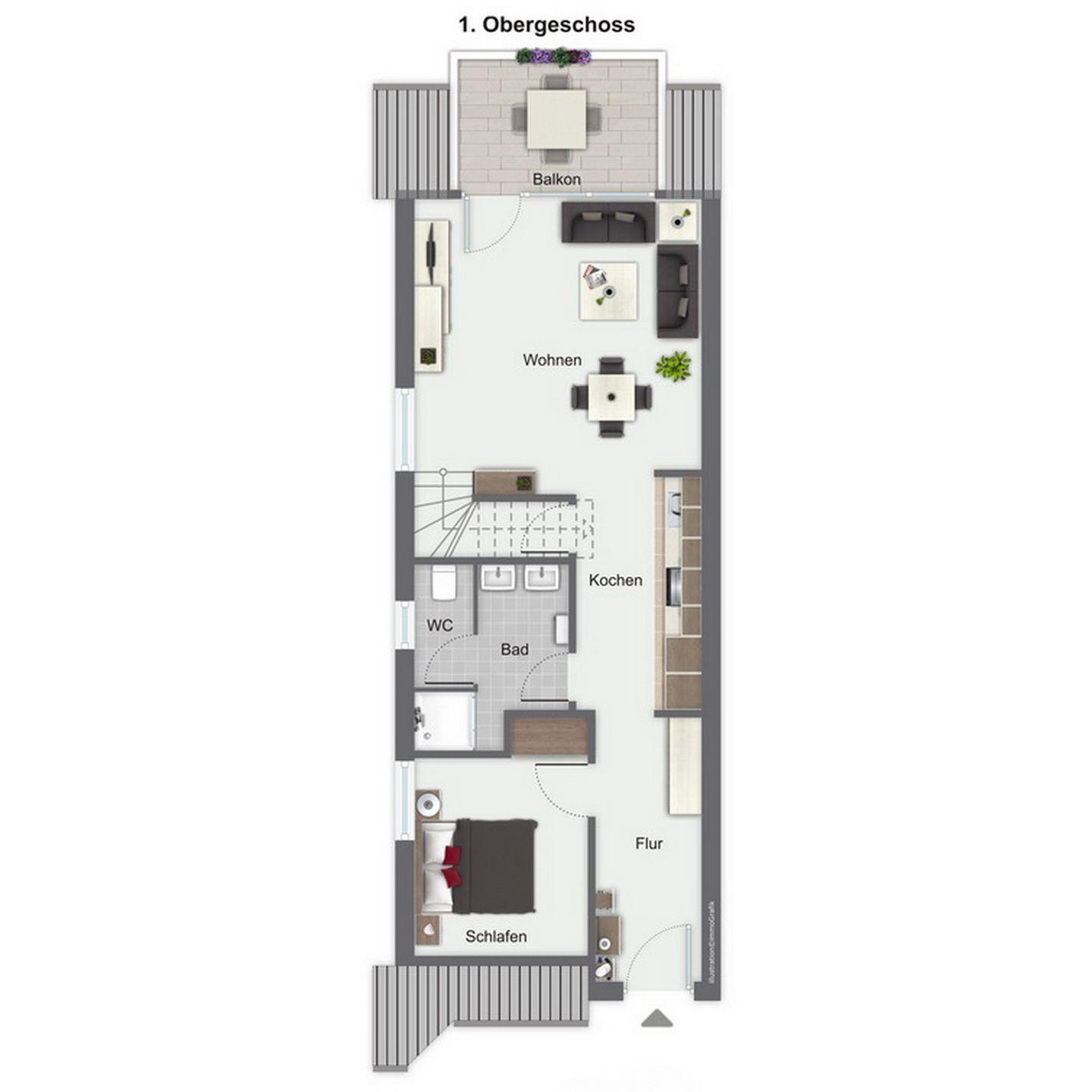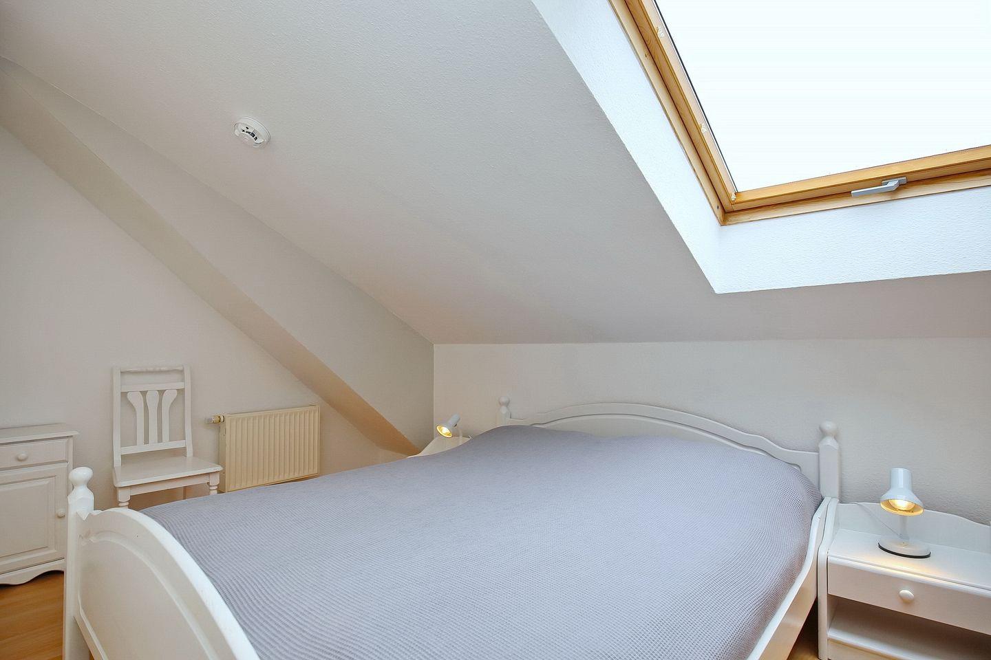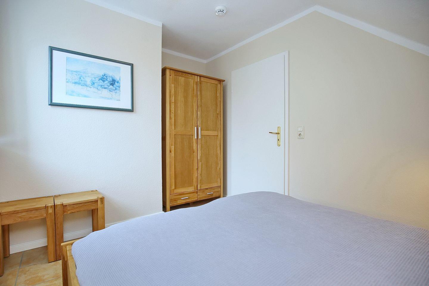 Im Schlafzimmer des 1. OG findest du ein Doppelbett und auch einen Kleiderschrank vor. Die zwei Schlafzimmer im Dachgeschoss erreichst du vom Wohnbereich aus über eine innenliegende Treppe. Beide Schlafräume sind mit jeweils einem Doppelbett (2 x 90 x 200 cm und 2 x 80 x 200 cm) und einem Kleiderschrank eingerichtet. Der Bodenbelag ist hier Laminat. An den Fenstern sind Rollos bzw. Außenjalousien zur Verdunkelung angebracht.