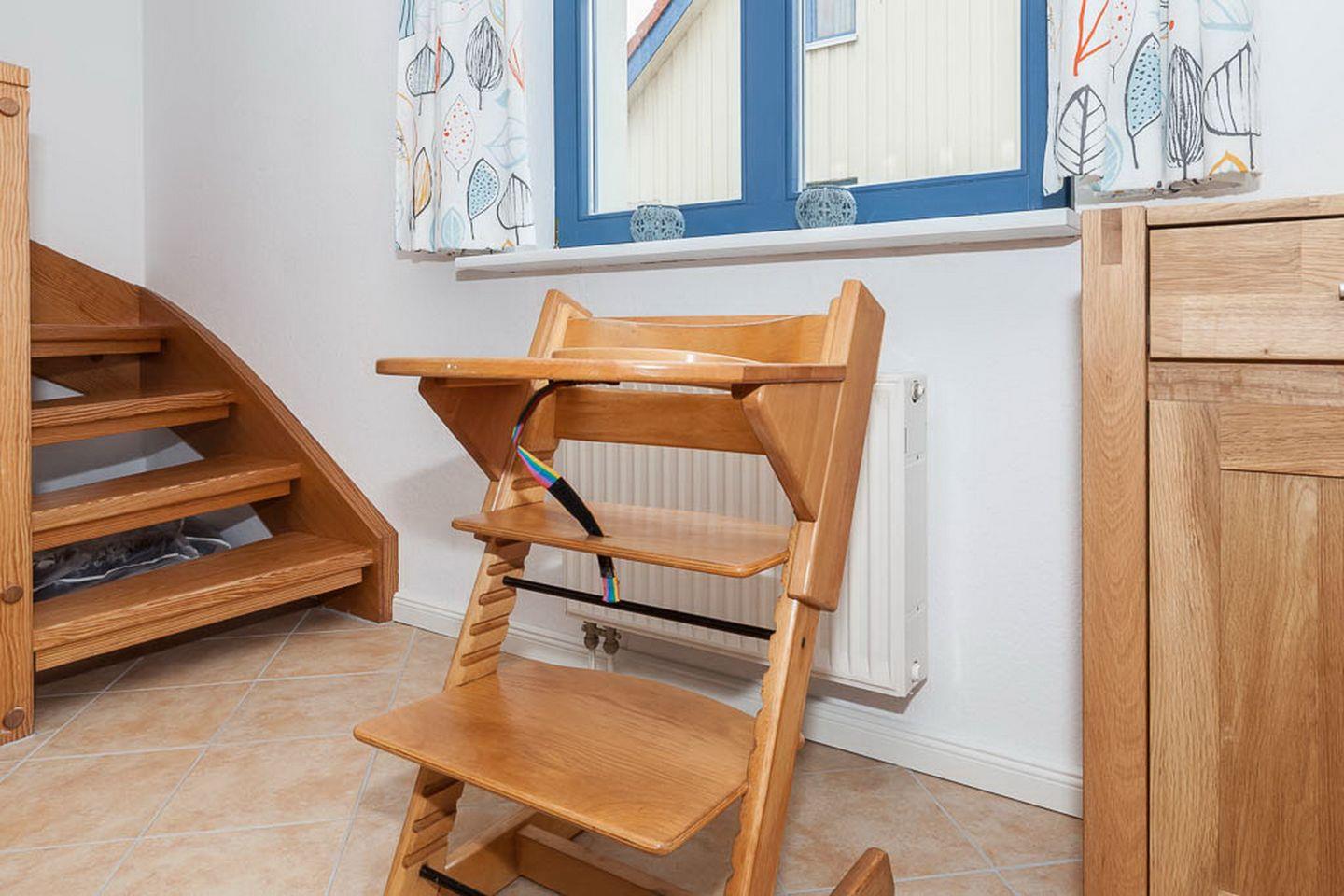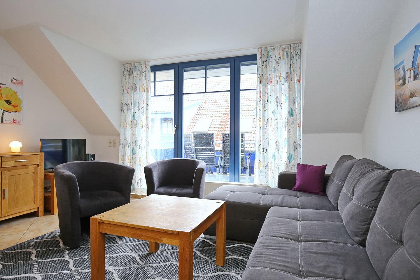Im Wohnzimmer findest du ein großes Balkonfensterelement vor, durch das die Sonne bis zum späten Abend in den Wohnbereich scheint. Von hier aus betrittst du den möblierten Balkon. Die bequeme Sitzgruppe im Wohnbereich und der Essbereich sind modern gestaltet. Damit auch kleinere Kinder es zu den Mahlzeiten bequem haben, steht ein Tripp-Trapp-Hochstuhl zur Verfügung. Ein Flachbild-TV und eine Stereoanlage sorgen für Abwechslung am Abend.