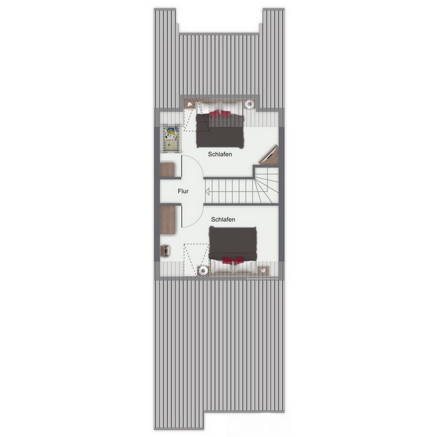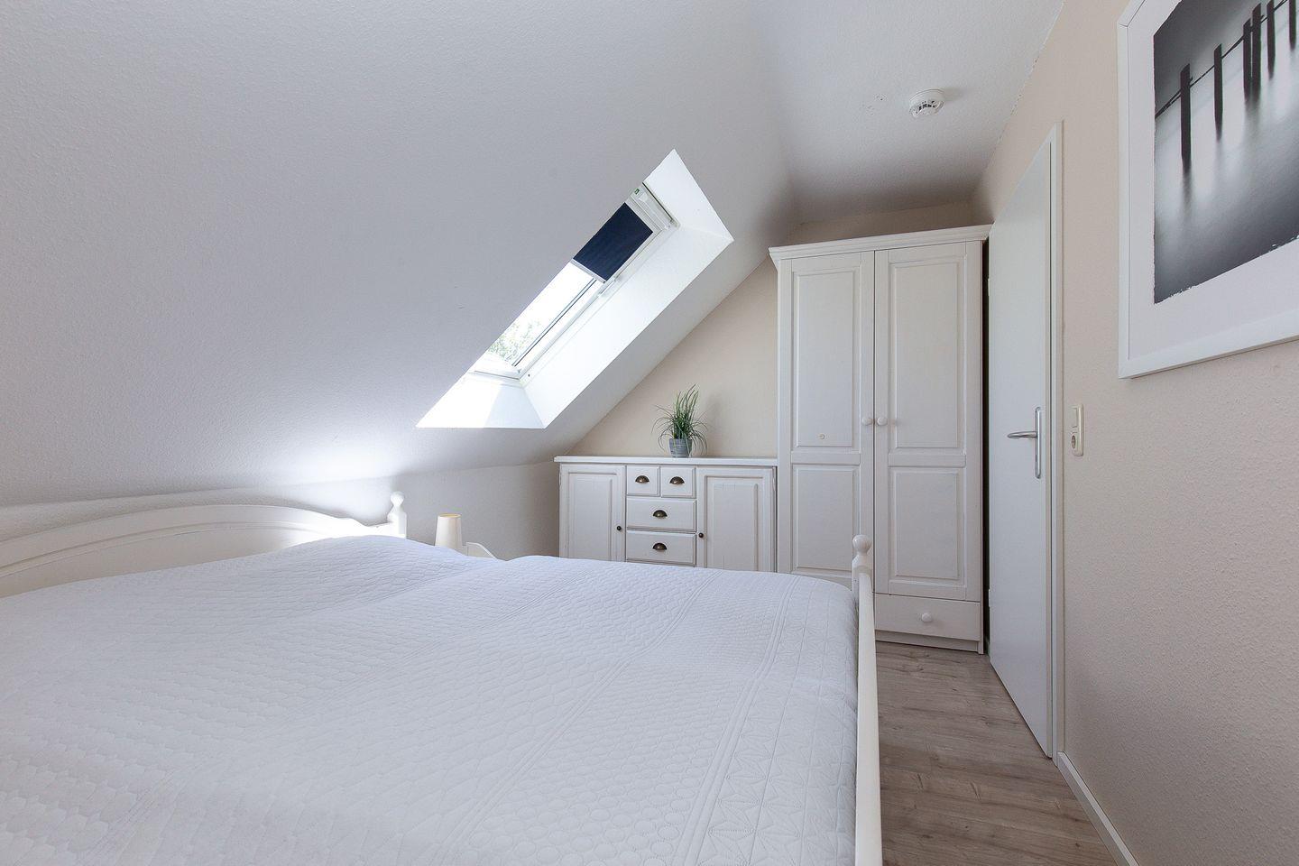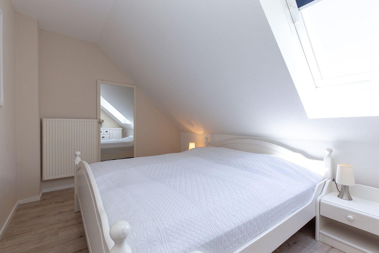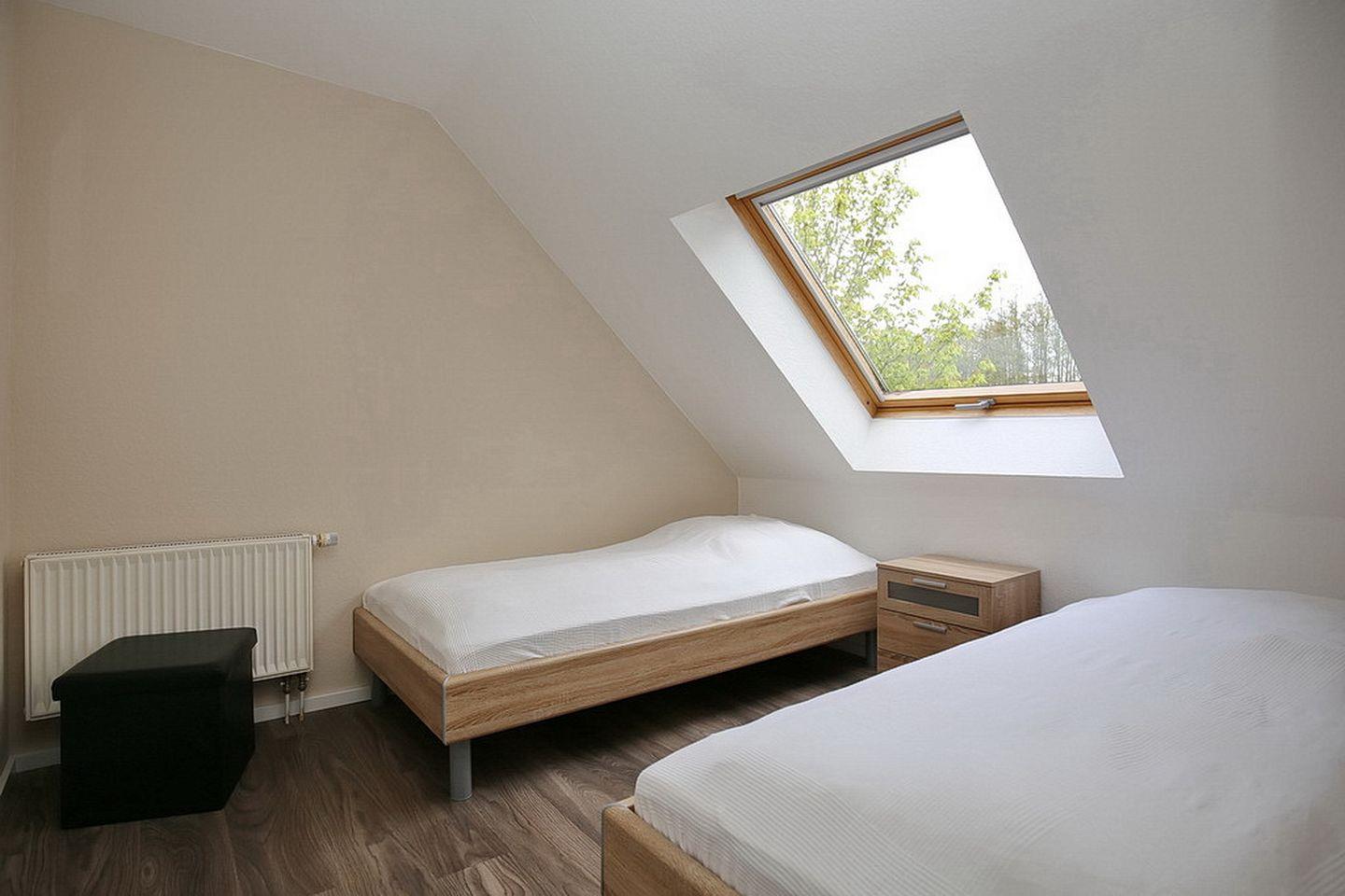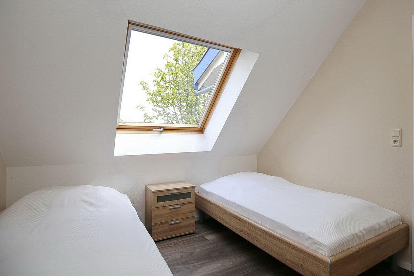 Im Schlafzimmer des 1. OG findest du neben zwei Einzelbetten (90 x 200 cm) auch einen Kleiderschrank vor. Die beiden Schlafzimmer im Dachgeschoss sind mit jeweils einem Doppelbett (2 x 90 x 200 cm und 2 x 80 x 200 cm) und einem Kleiderschrank möbliert. Ein weiteres Highlight hier ist der 2. TV in einem der oberen Schlafzimmer. Zur Verdunkelung an den Fenstern gibt es Rollos bzw. Außenjalousien.