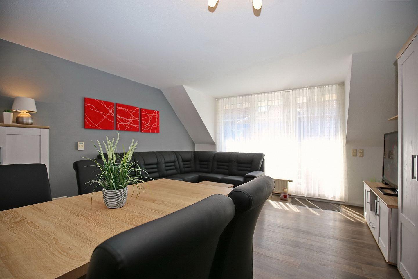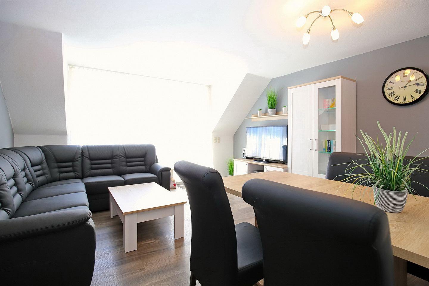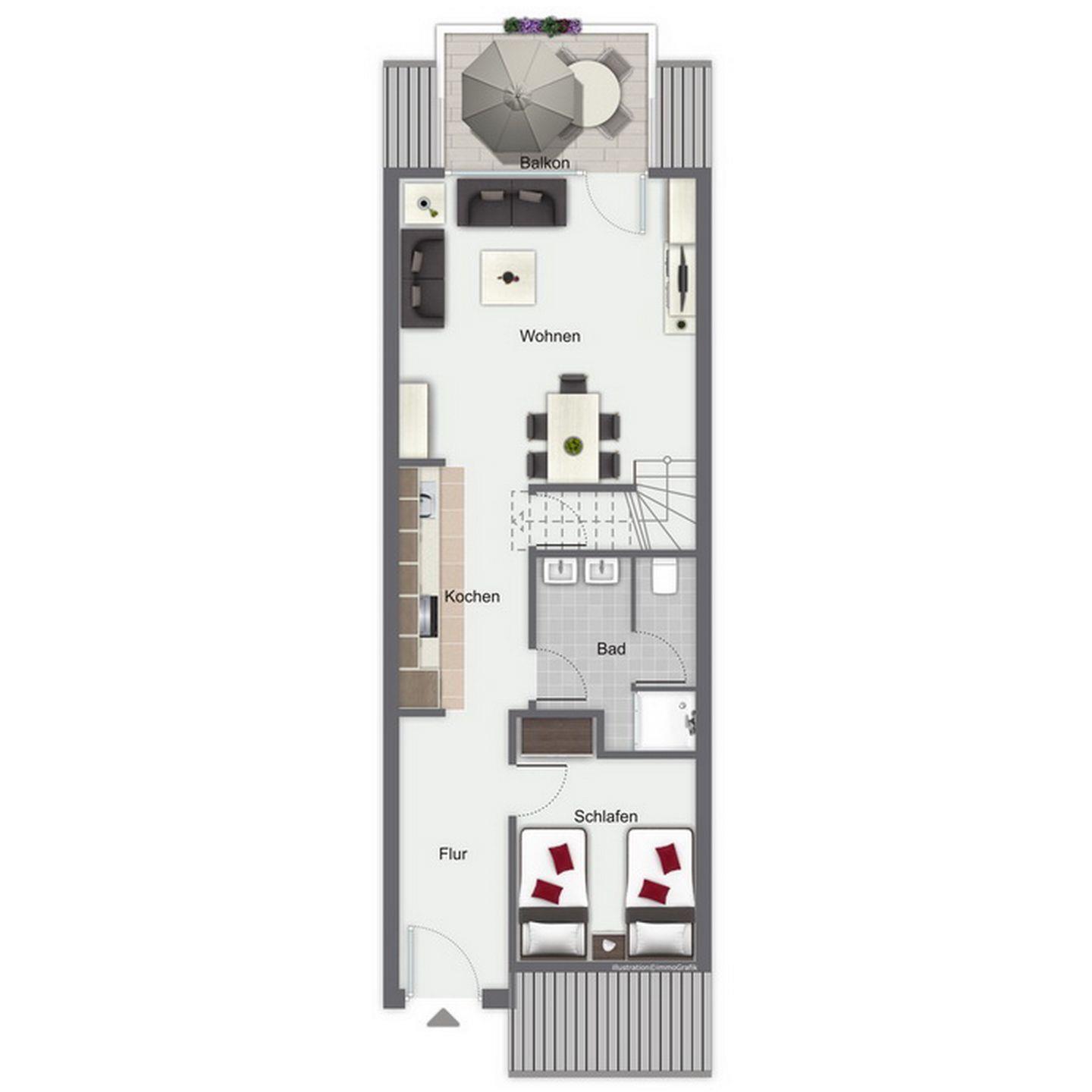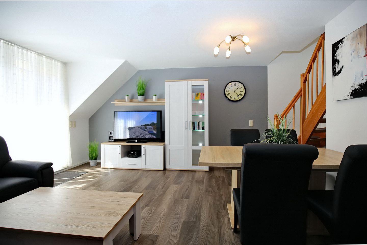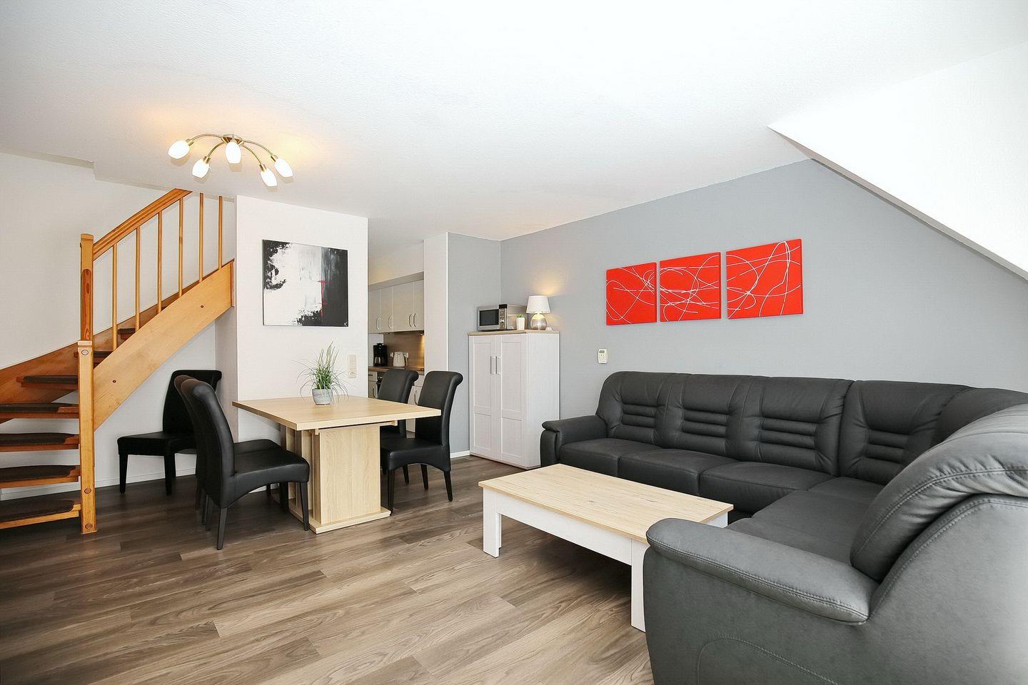 Auf den möblierten Balkon gelangst du vom Wohnbereich. Im gemütlich eingerichteten Wohnbereich mit Sofaecke und Essbereich fehlt es dir an nichts. Ein Flachbild-TV, eine Stereoanlage sowie eine Auswahl an Büchern stehen zur Verfügung. Die innenliegende Treppe führt in das Dachgeschoss mit zwei Schlafzimmern.