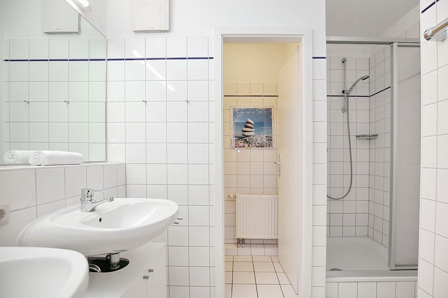 Im gefliesten Duschbad mit zwei Waschbecken gibt es ein separates WC. Fahrräder können am Fahrradständer am Haus oder im Abstellraum im Keller abgestellt werden. In dieser Nichtraucherwohnung sind Haustiere nicht erlaubt.