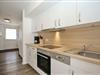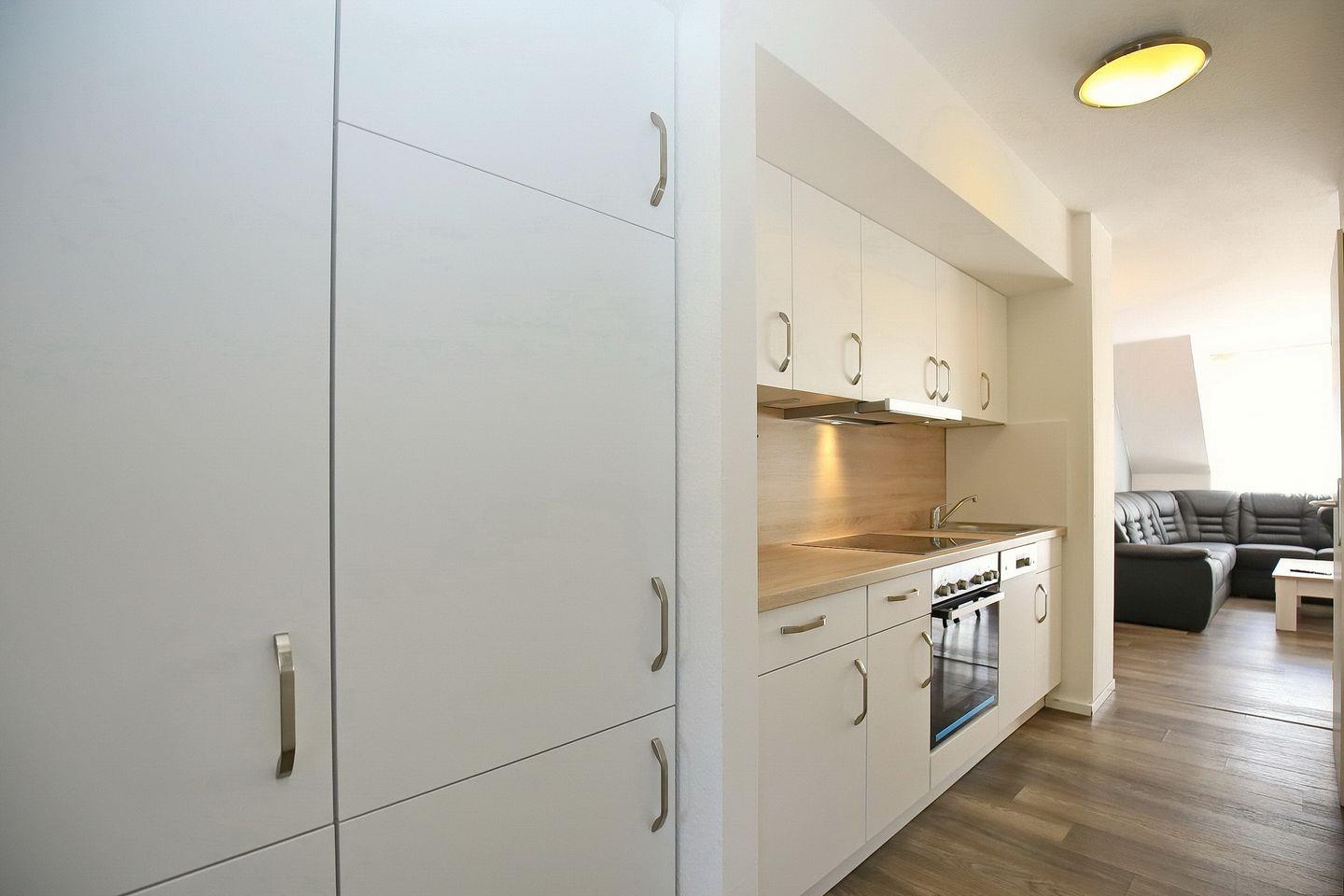 Die im Wohnbereich integrierte Küchenzeile ist mit einem Cerankochfeld mit Backofen, einem Geschirrspüler und einem Kühlschrank mit Gefrierfach sowie einer Mikrowelle ausgestattet. Die gesamte Wohnung ist mit Laminat ausgelegt.