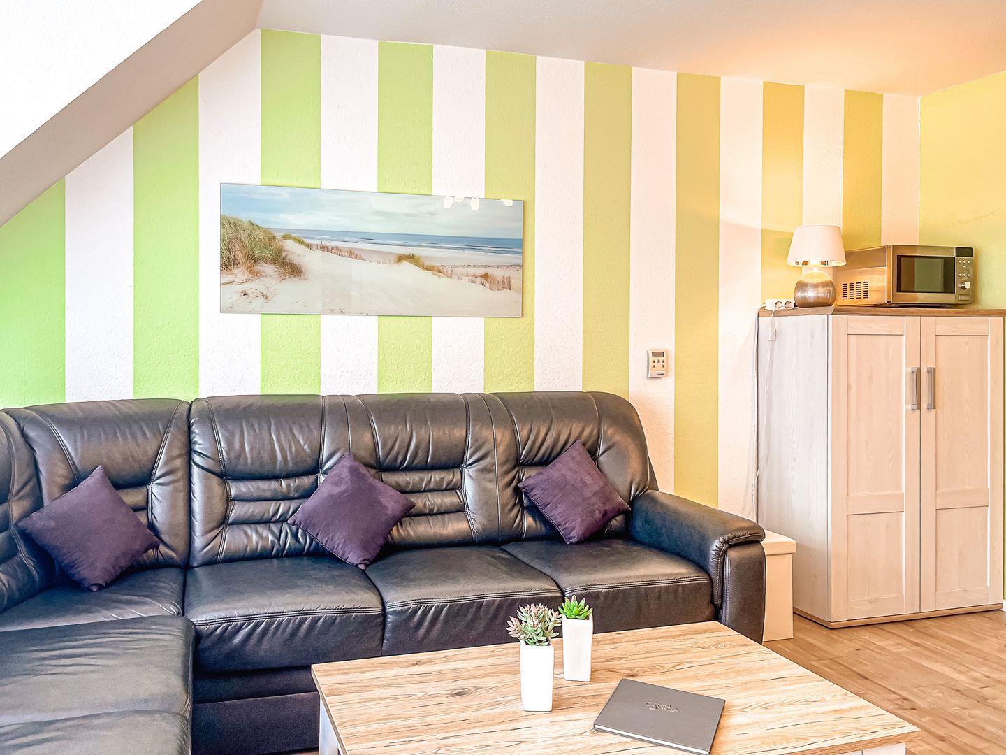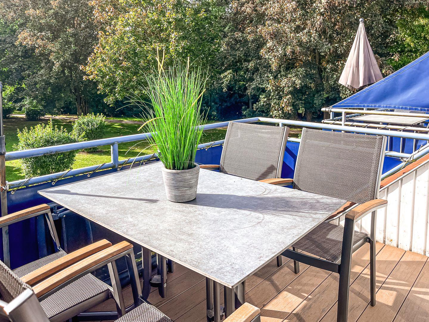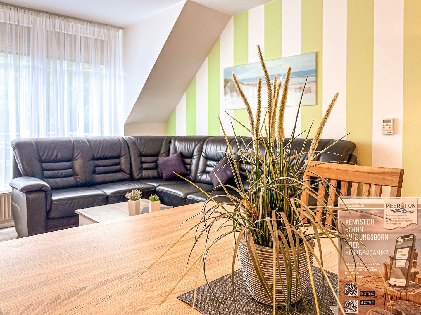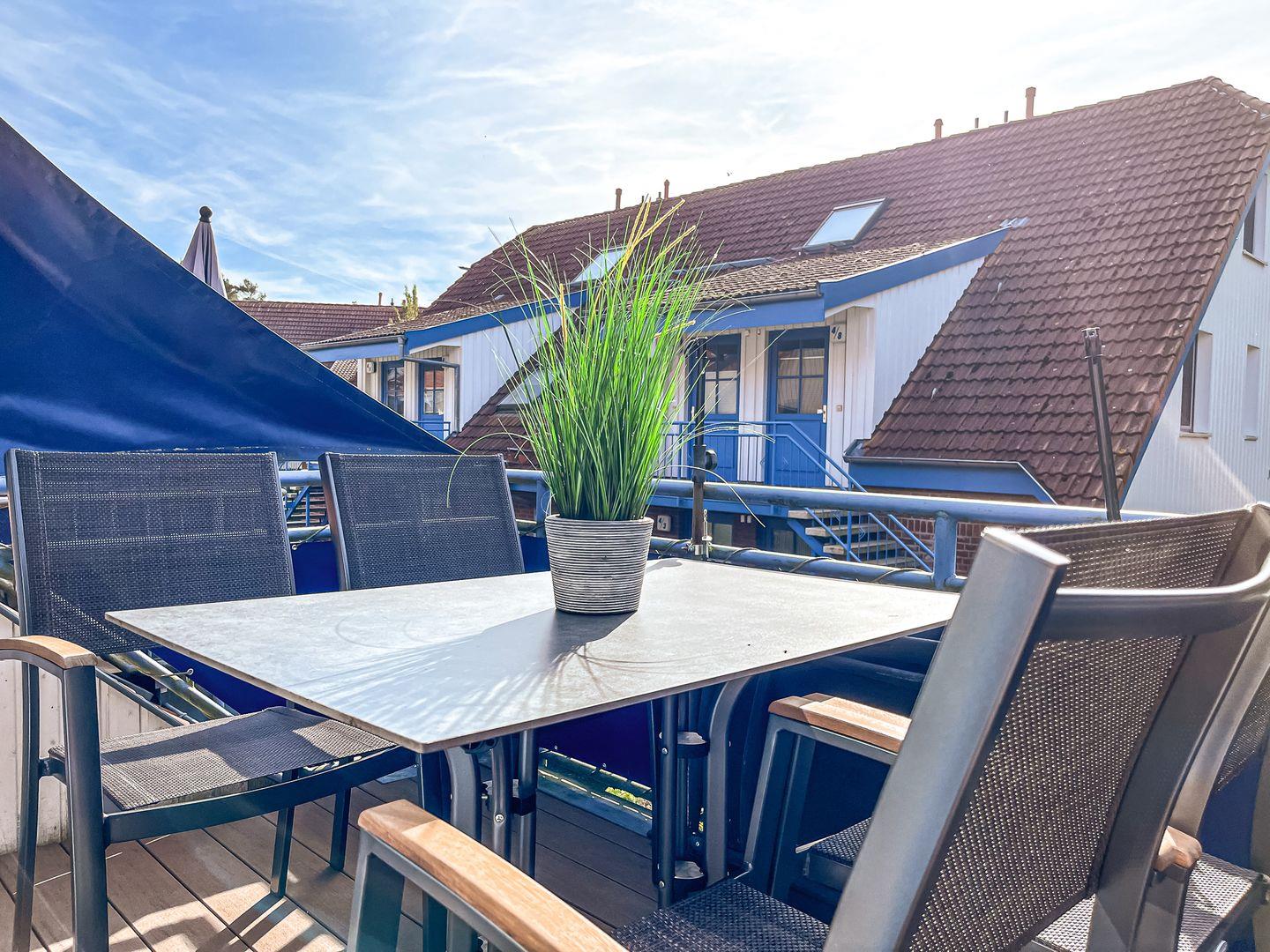 Den möblierten sonnig gelegenen Balkon betrittst du aus dem Wohnzimmer. Die bequeme Eck-Couch lädt zum Entspannen ein. Nutze zur Unterhaltung gerne den Flachbild-TV und die Stereoanlage. Auch der Essbereich für sechs Personen befindet sich hier. Für unsere kleinen Gäste stehen ein Hochstuhl und ein festaufgebautes Kinderbett mit Matratze (120 x 60 cm) zur Verfügung. Bettzeug und Laken für das Kinderbett bringst du bitte selbst mit.