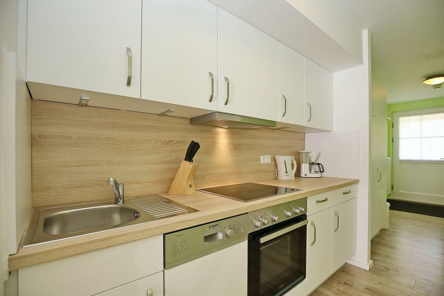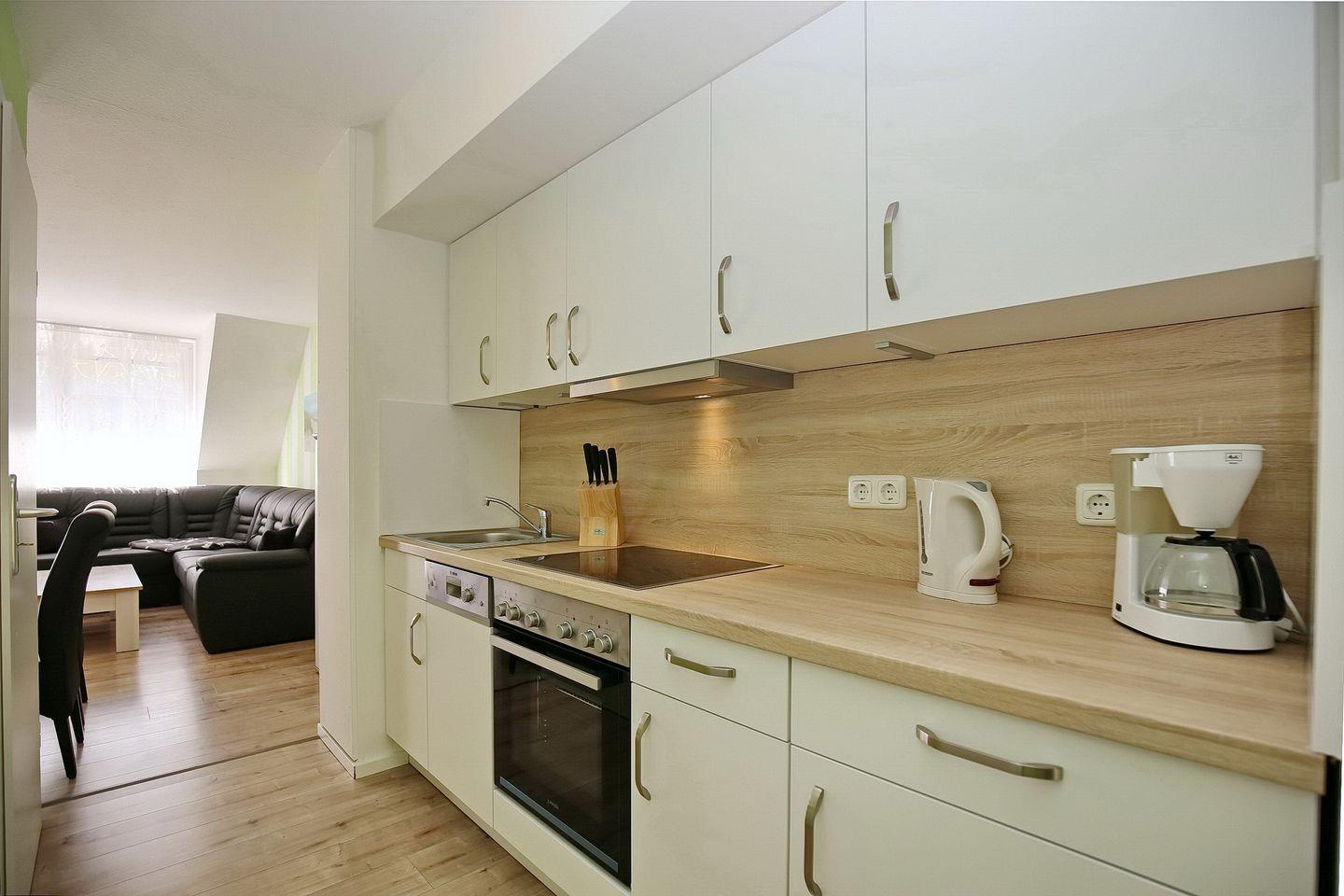 In der integrierten Küchenzeile befindet sich ein 4-Platten-Cerankochfeld mit Backofen, ein Geschirrspüler und ein Kühlschrank mit Gefrierfach sowie eine Mikrowelle. In der gesamten Wohnung ist Laminat verlegt.