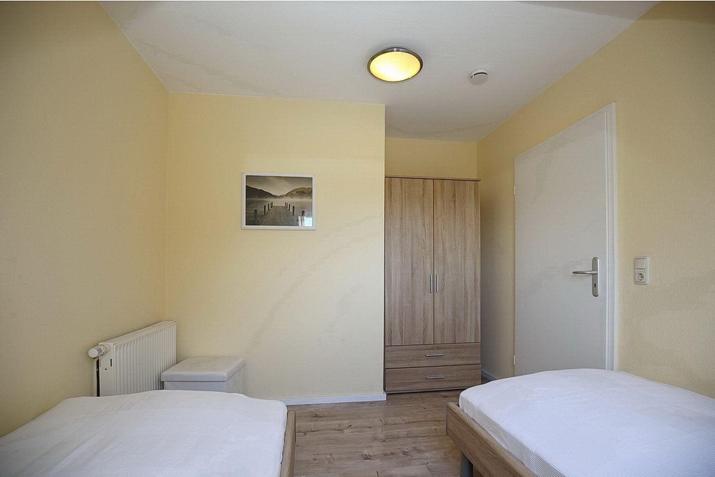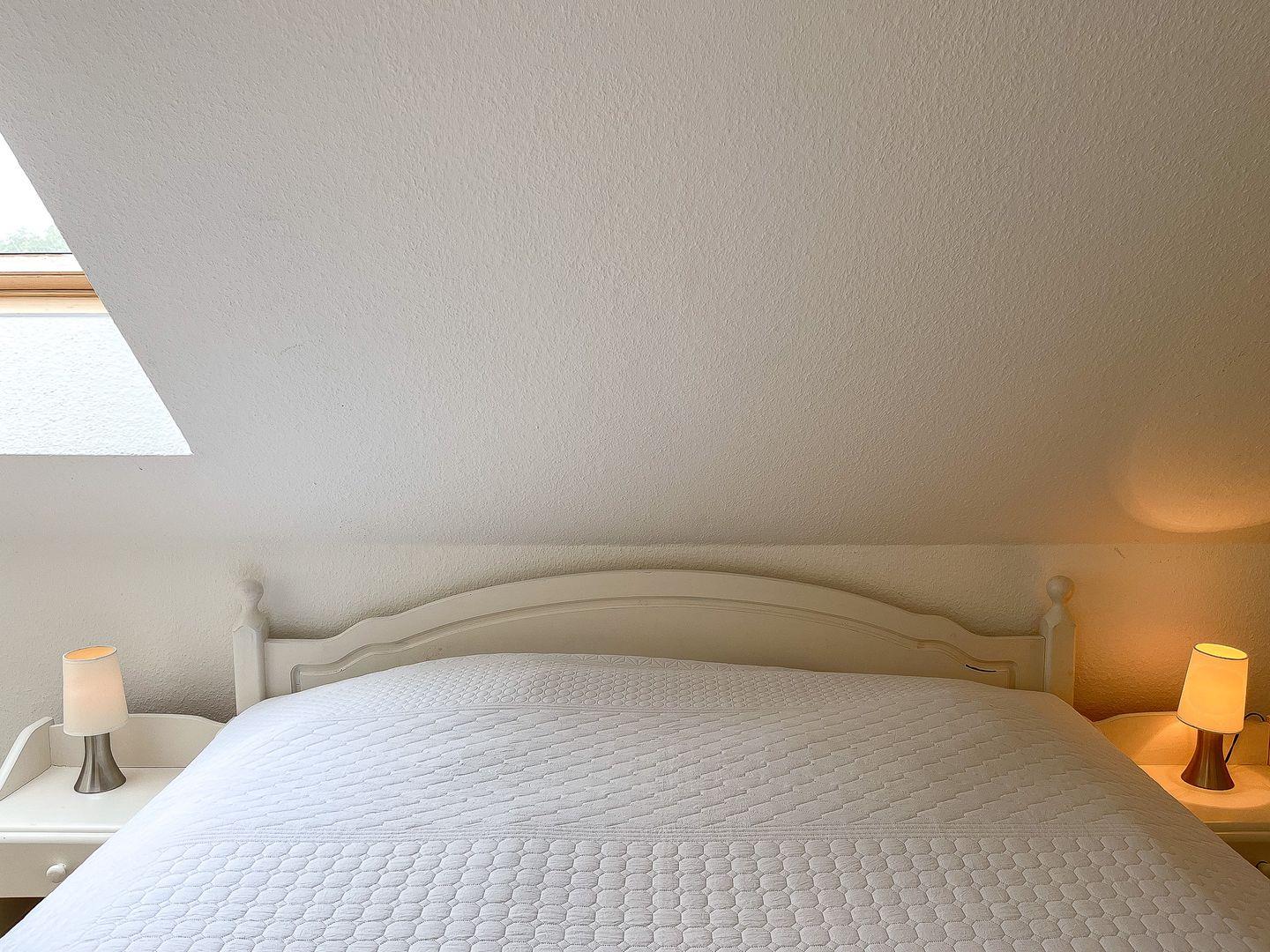 Das Schlafzimmer des 1. OG ist mit zwei Einzelbetten (90 x 200 cm) und einem Kleiderschrank möbliert. Die zwei Schlafzimmer im Dachgeschoss erreichst du vom Wohnbereich über eine innenliegende Treppe. Beide Schlafräume sind mit jeweils einem Doppelbett (2 x 90 x 200 cm und 2 x 80 x 200 cm) und einem Kleiderschrank eingerichtet. Hier steht dir ein zweites TV-Gerät zur Verfügung. An den Fenstern sind Rollos bzw. Außenjalousien zur Verdunkelung angebracht.