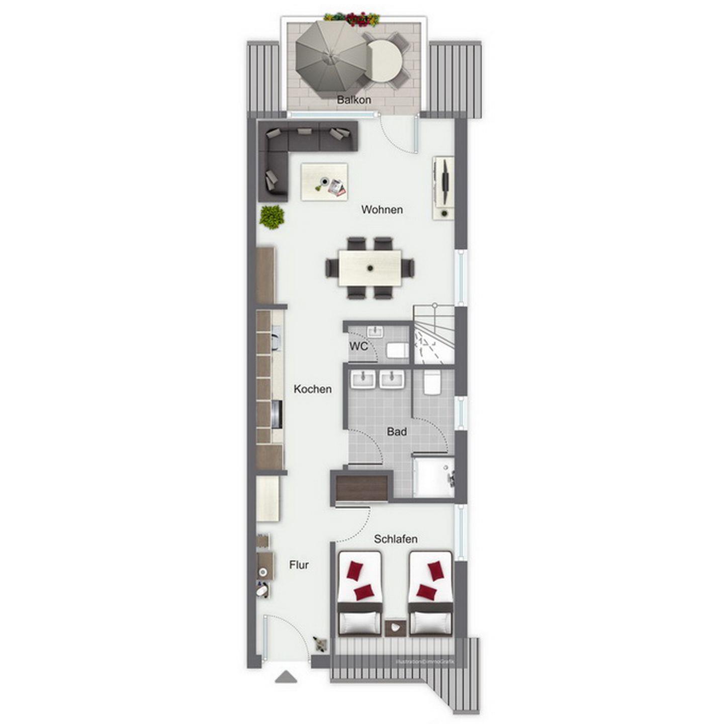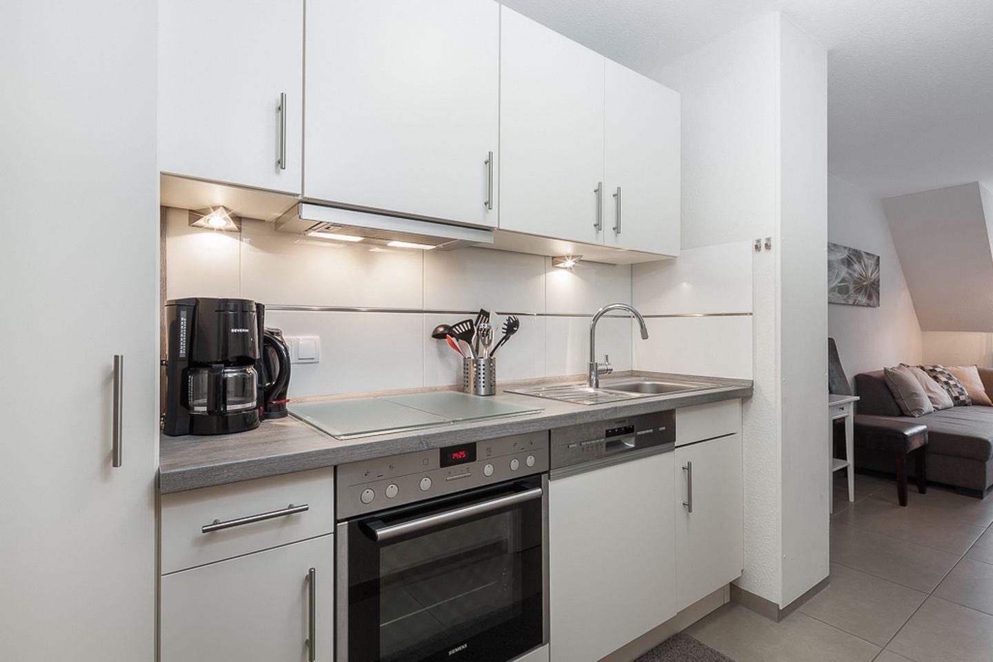 Die Küchenzeile bietet ein 4-Platten-Cerankochfeld mit Backofen, einen Geschirrspüler und einen Kühlschrank mit Gefrierfach. Im Untergeschoss befindet sich ein Schlafzimmer mit zwei Einzelbetten (90 x 200 cm) und einem Kleiderschrank. Als Verdunklung wurde für die gesamte Wohnung eine Außenjalousie gewählt.