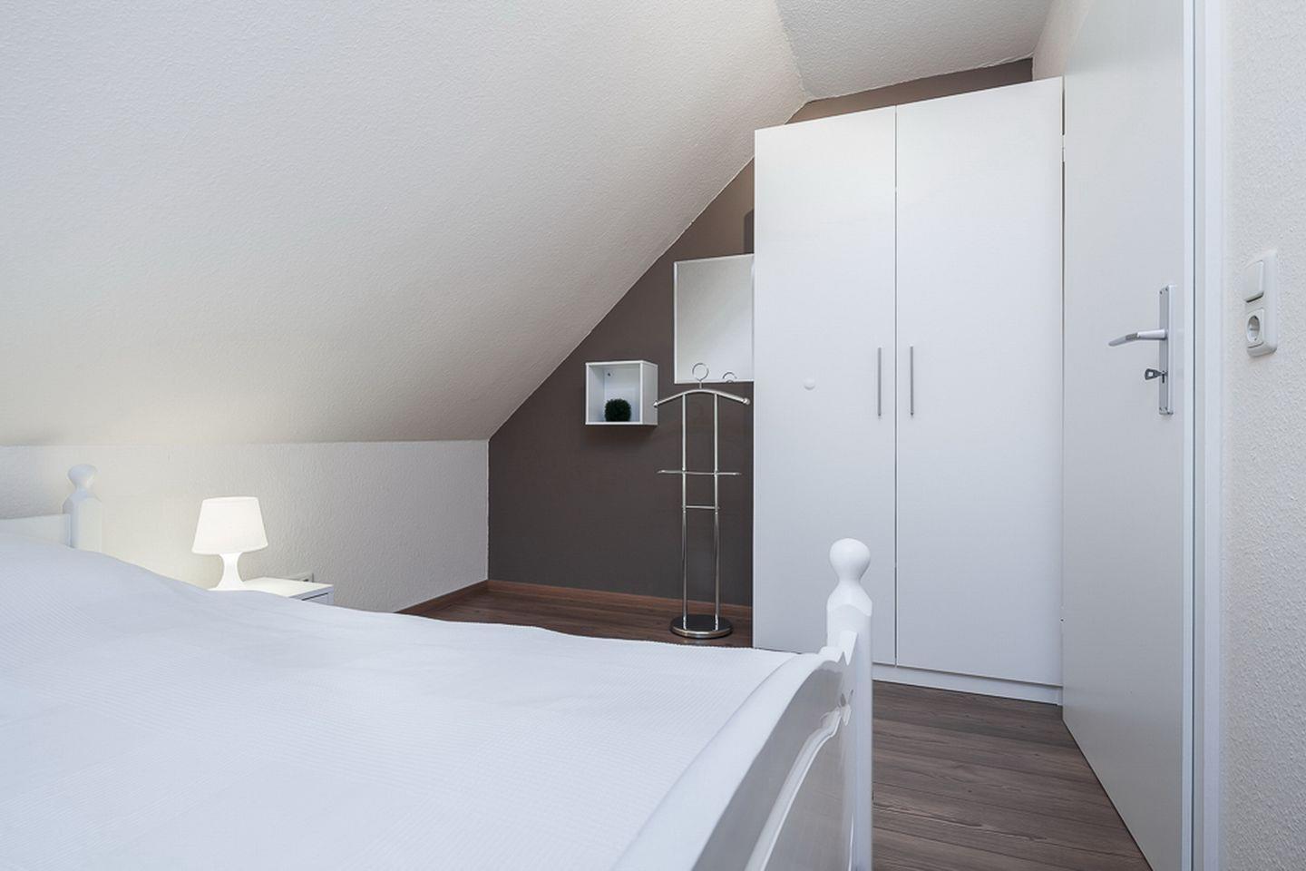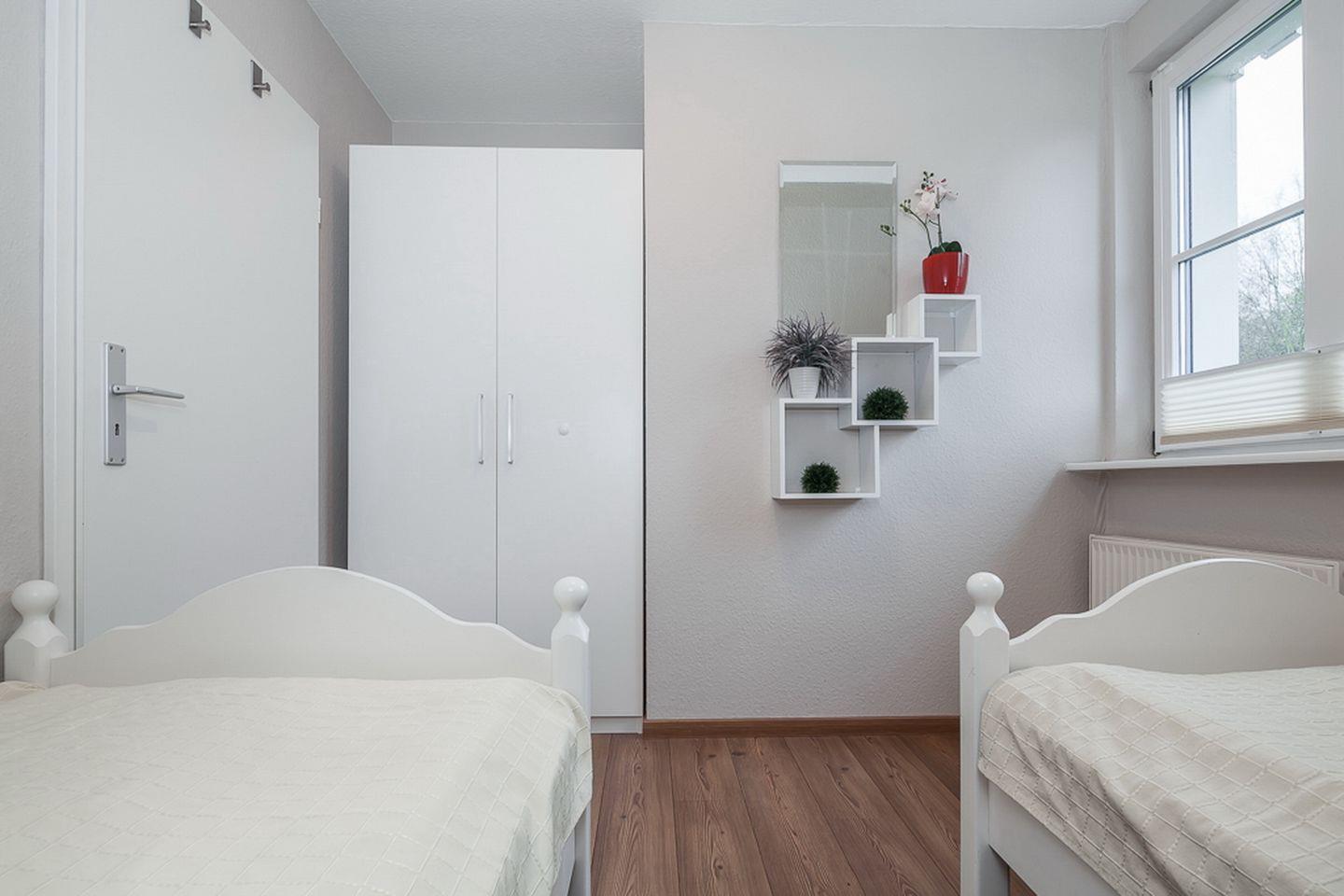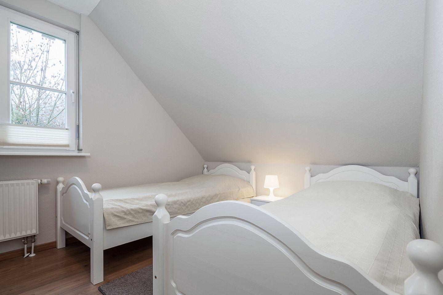 Durch die innenliegende Treppe in der ersten Etage gelangst du ins Obergeschoss zu den Schlafzimmern. Diese sind mit Kleiderschränken und jeweils einem Doppelbett (2 x 90 x 200 cm und 2 x 80 x 200 cm) ausgestattet. Der linke Schlafraum verfügt zusätzlich über einen Flachbild-TV. In allen Schlafräumen ist der Bodenbelag Laminat.