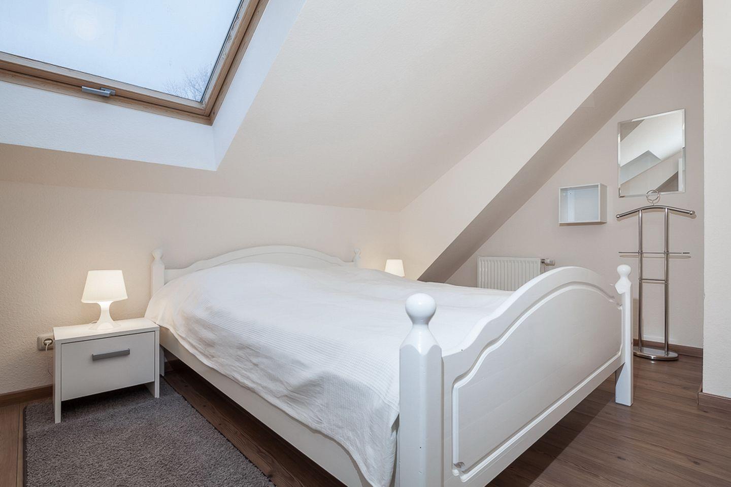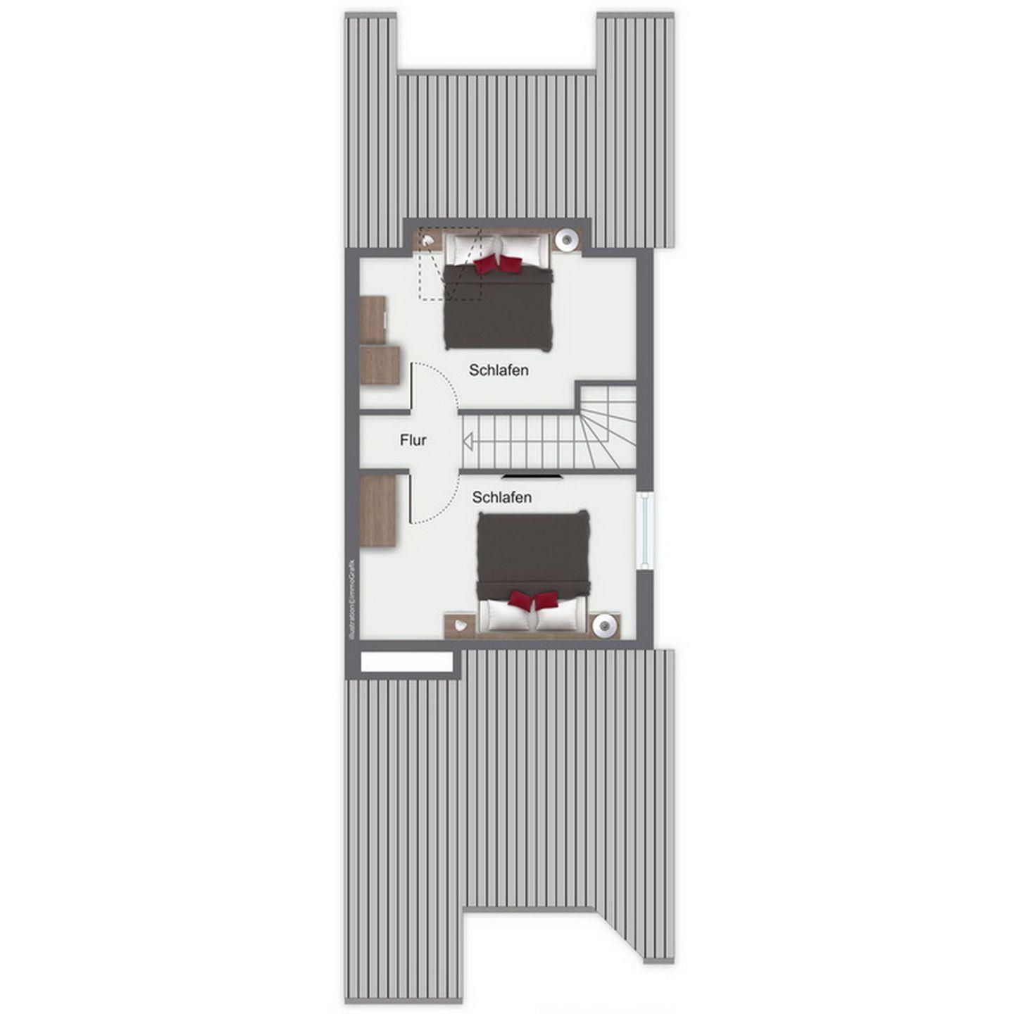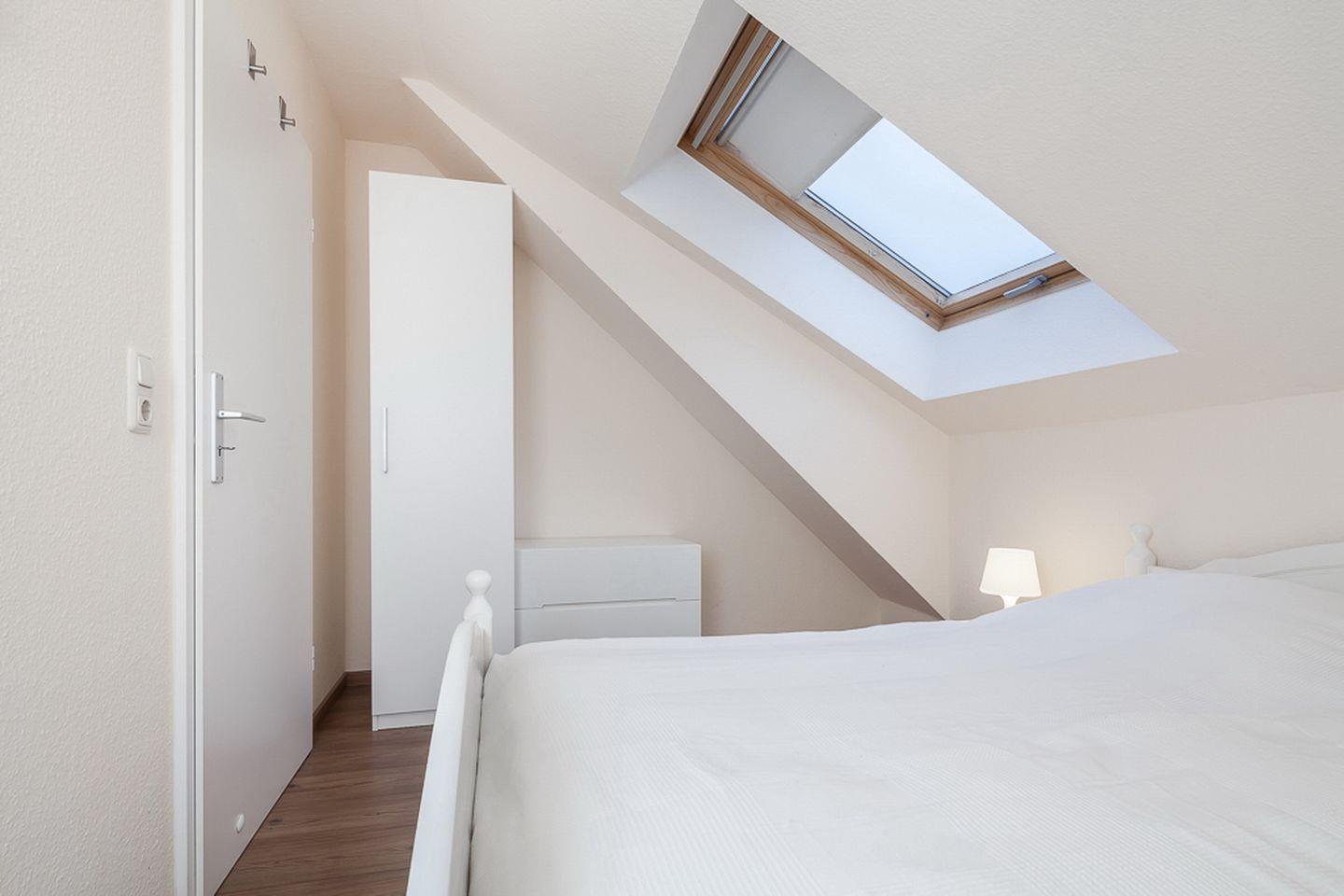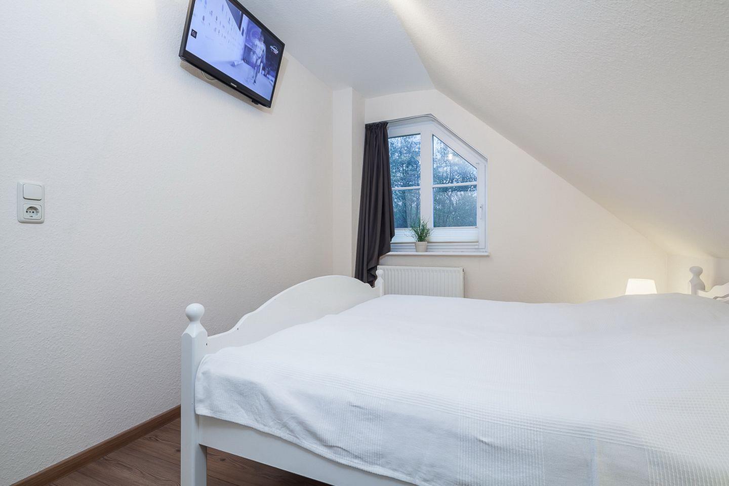 Durch die innenliegende Treppe in der ersten Etage gelangst du ins Obergeschoss zu den Schlafzimmern. Diese sind mit Kleiderschränken und jeweils einem Doppelbett (2 x 90 x 200 cm und 2 x 80 x 200 cm) ausgestattet. Der linke Schlafraum verfügt zusätzlich über einen Flachbild-TV. In allen Schlafräumen ist der Bodenbelag Laminat.