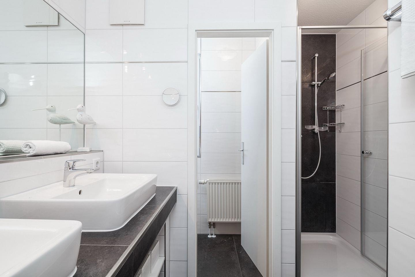 Im modernen, gefliesten Duschbad gibt es eine ebenerdige Dusche mit Klarglas, ein separates WC mit einem Fenster sowie ein Einbauradio. Eine Besonderheit in dieser Wohnung ist das extra Gäste WC im Untergeschoss. Fahrräder können im Fahrradständer des Hauses abgestellt werden. Haustiere sind in der Nichtraucherwohnung erlaubt.